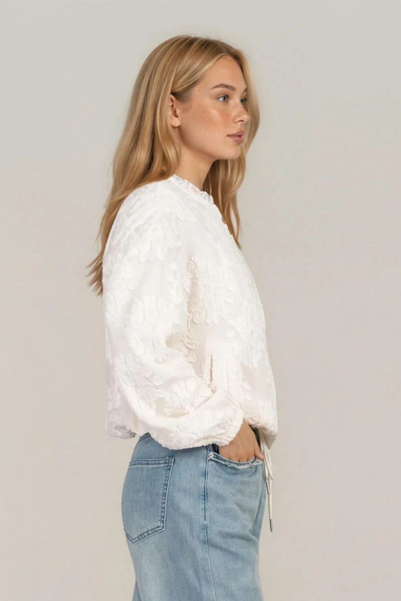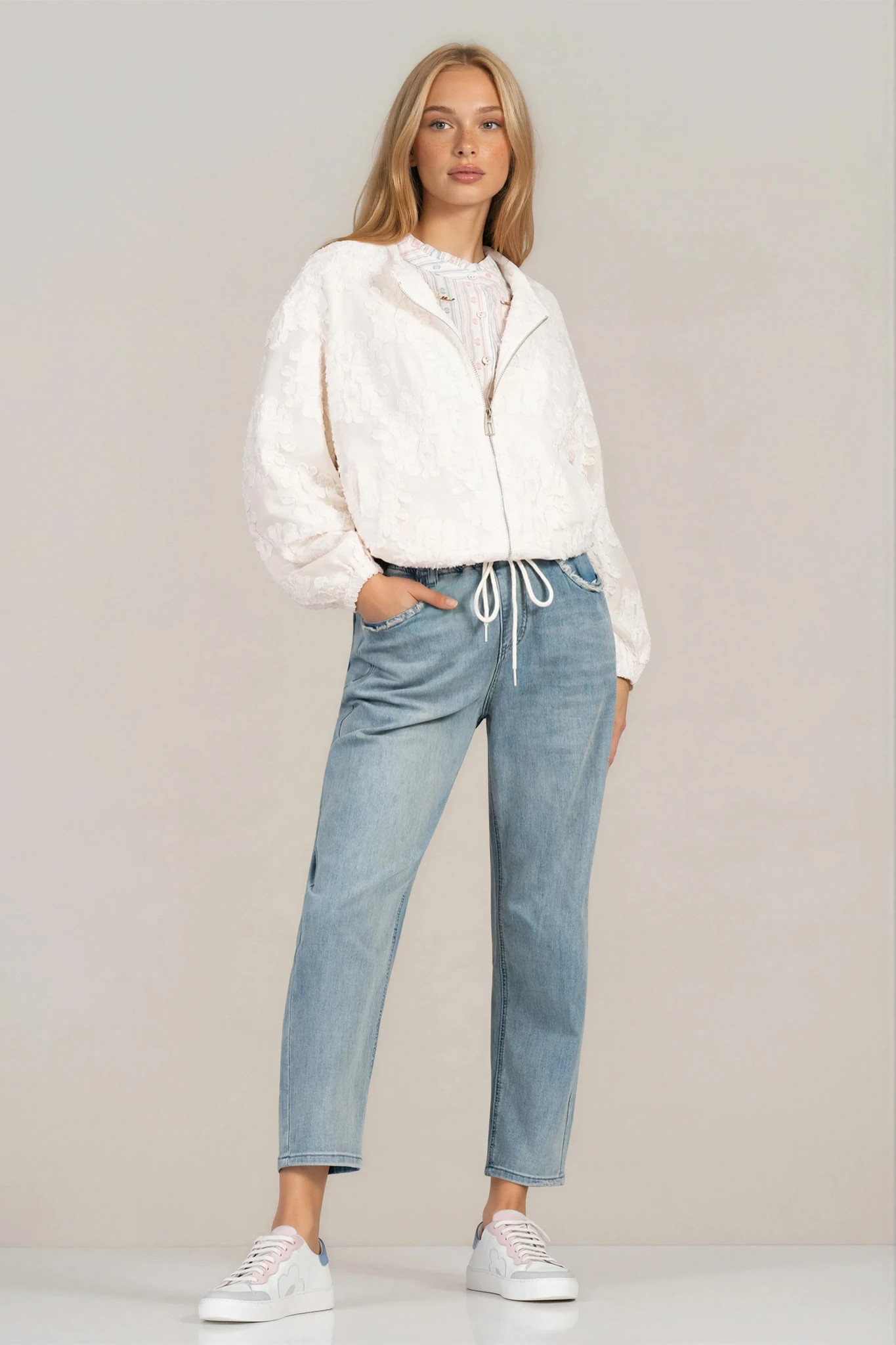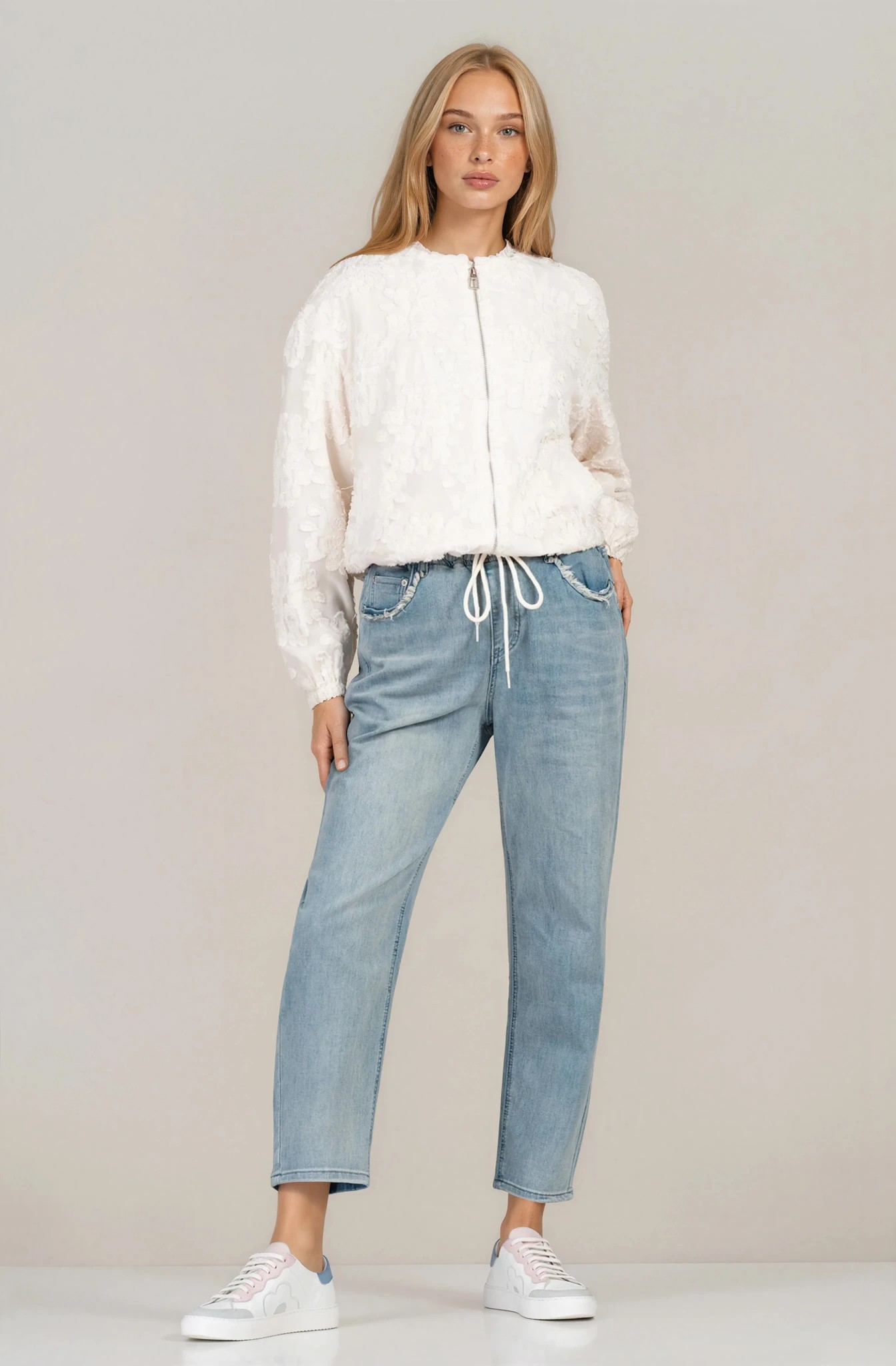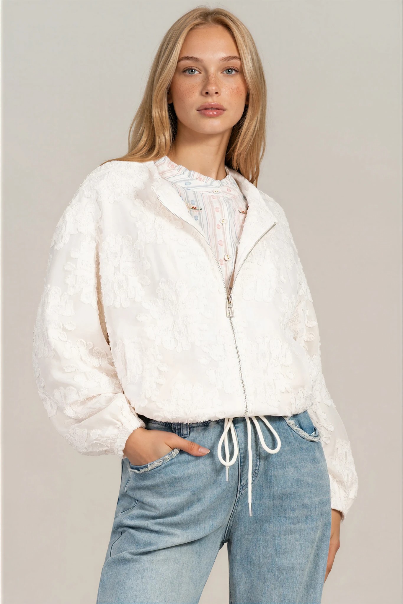 Елегантно тънко яке в цвят ванилия, отличаващо се с релефен принт по цялата повърхност. Леката материя осигурява комфорт и свобода на движение, а закопчаването с цип добавя практичност в ежедневието. Моделът е със свободна кройка и връзки в долната част, които позволяват регулиране на силуета. Подходящ избор за пролетно-летния сезон и стилни градски визии.