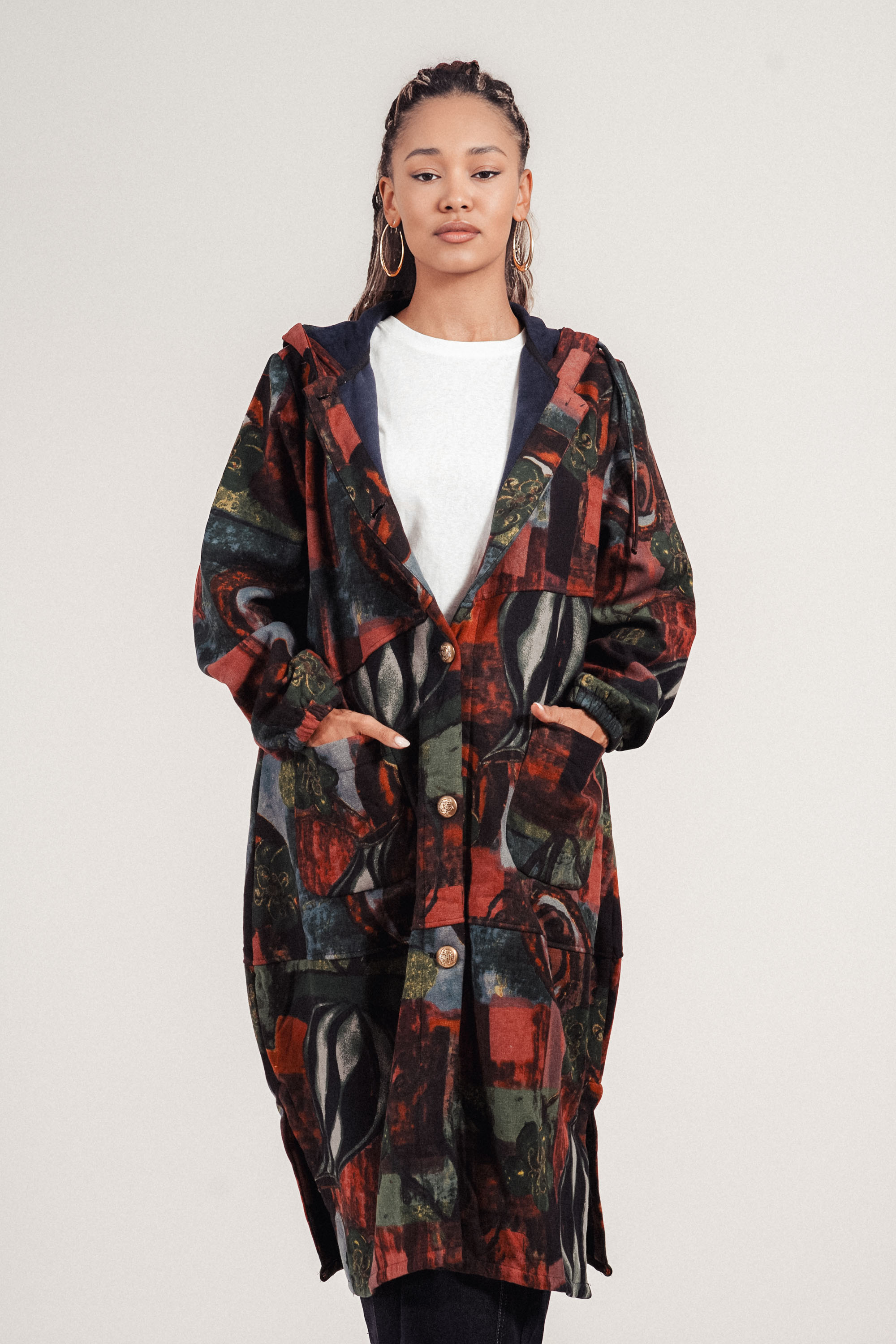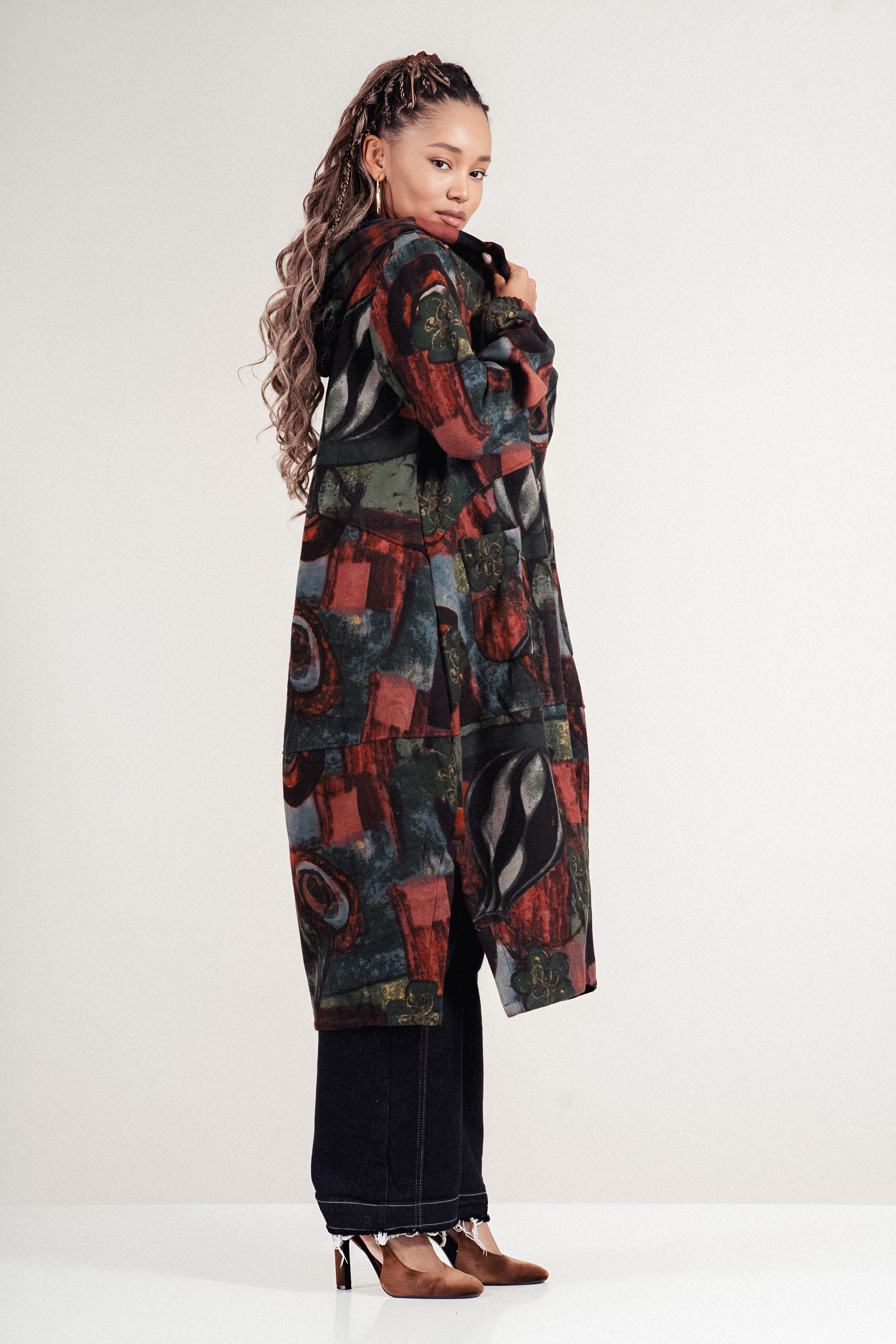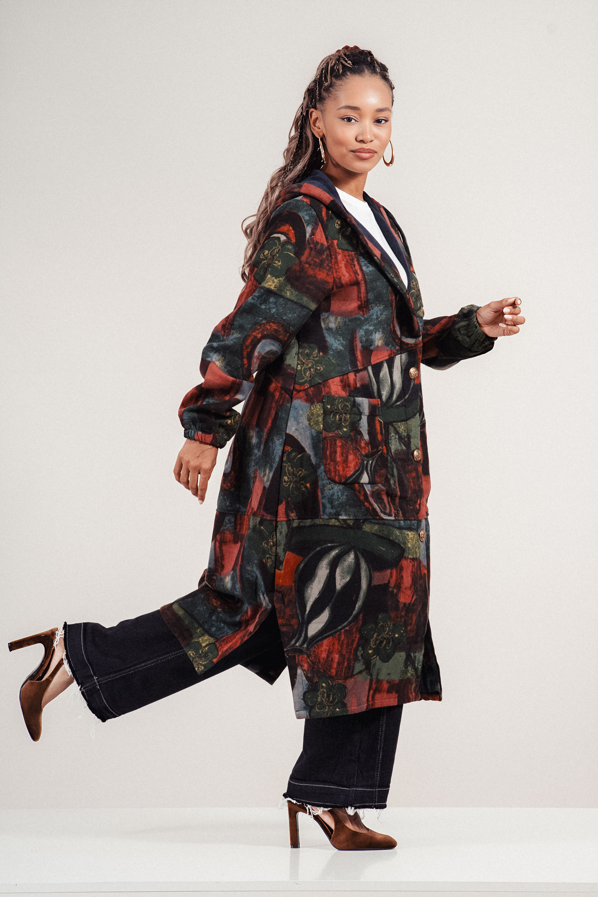 Удобно и стилно палто с ватирана вътрешност, подходящо за хладните сезони. Моделът впечатлява с артистичен принт на цветя в зелено на червен фон. Закопчаването със златисти копчета и качулката с връзки добавят практичен завършек. Подходящо както за ежедневие, така и за по-елегантна визия.