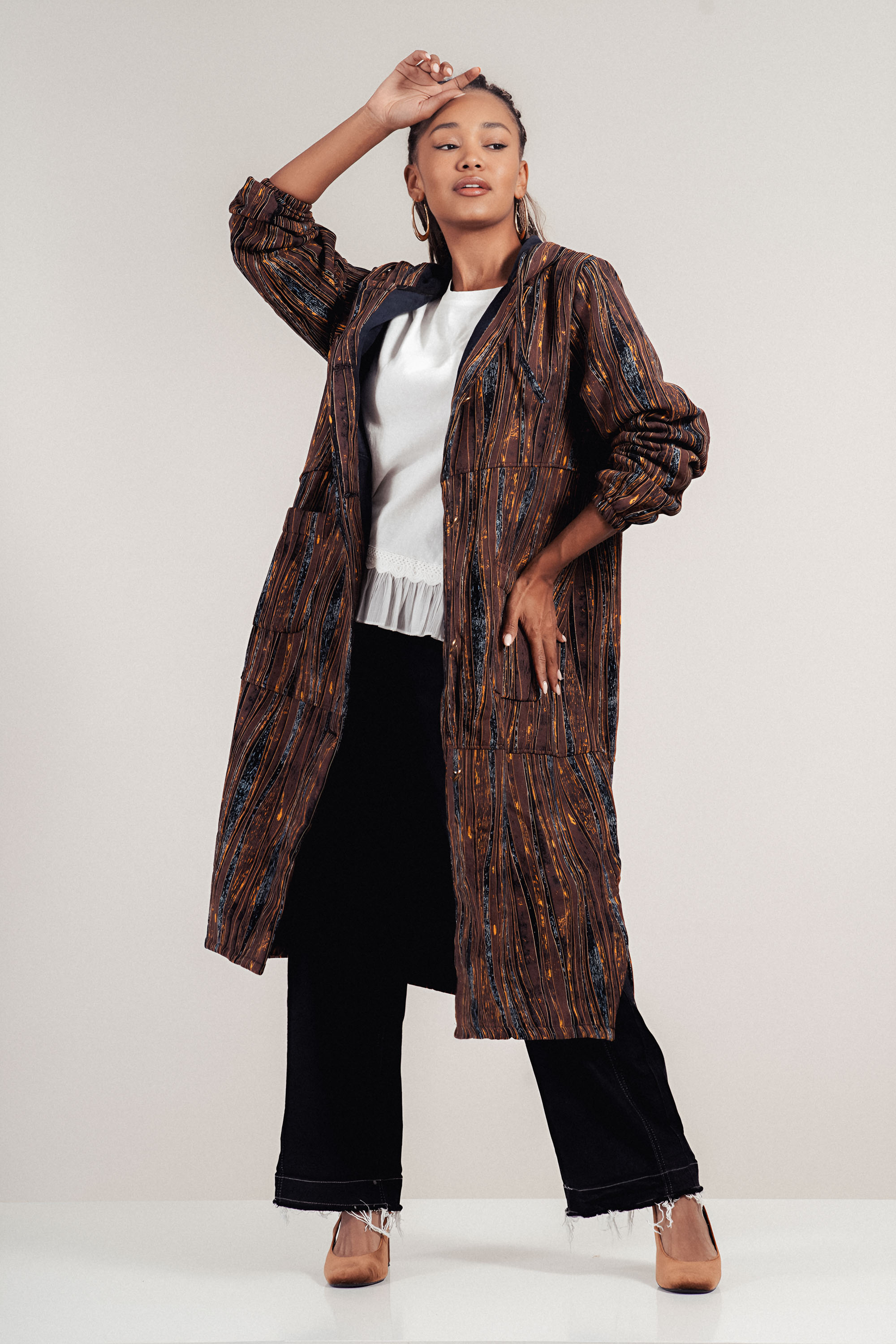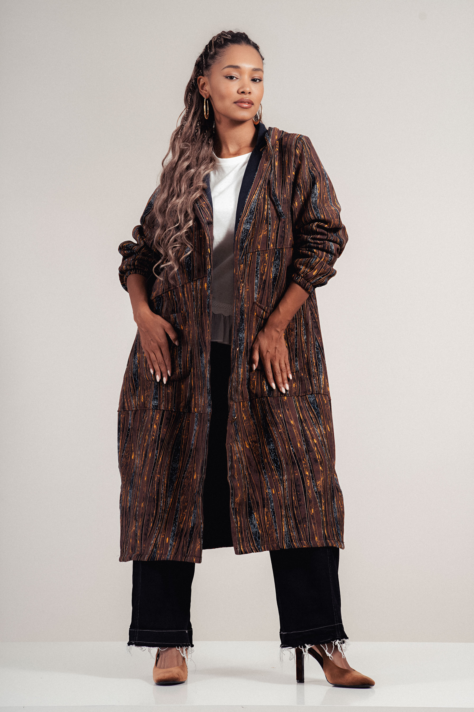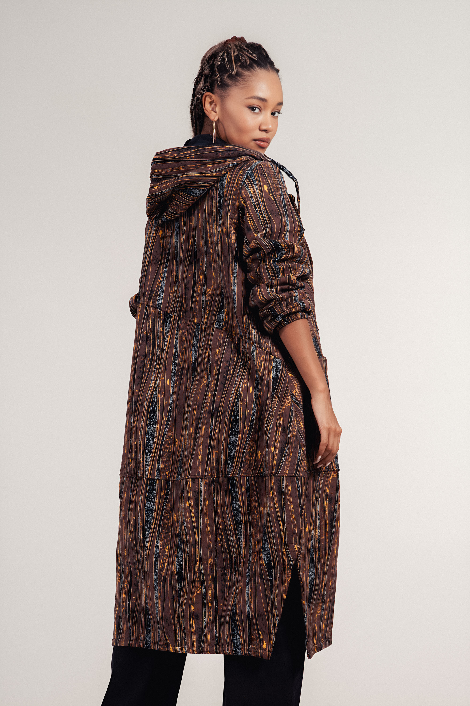 Удобно и стилно палто с ватирана вътрешност, подходящо за хладните сезони. Моделът впечатлява с артистичен принт от вертикални линии в жълто и синьо, който издължава силуета. Закопчаването със златисти копчета и качулката с връзки добавят практичен завършек. Подходящо както за ежедневие, така и за по-елегантна визия.
