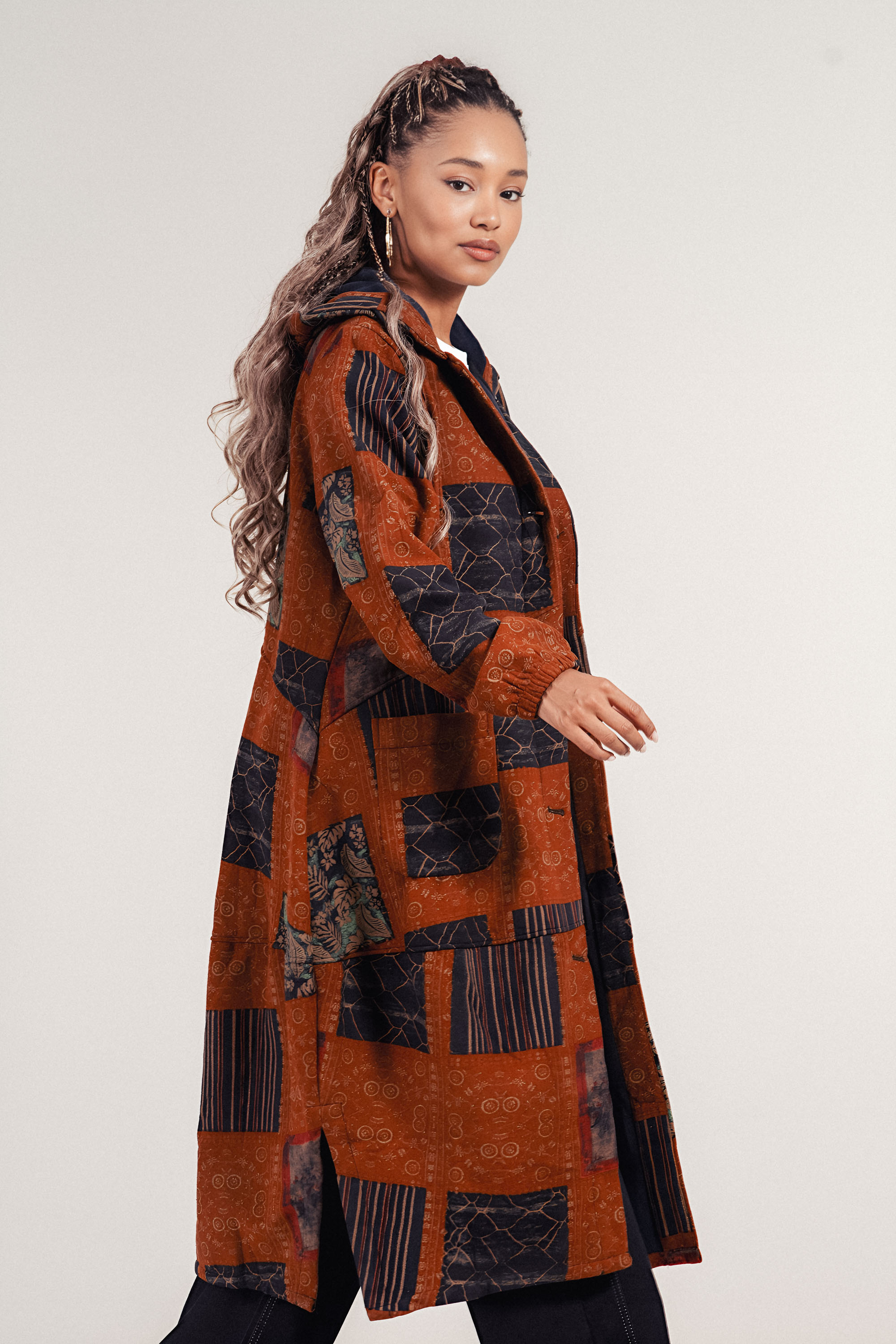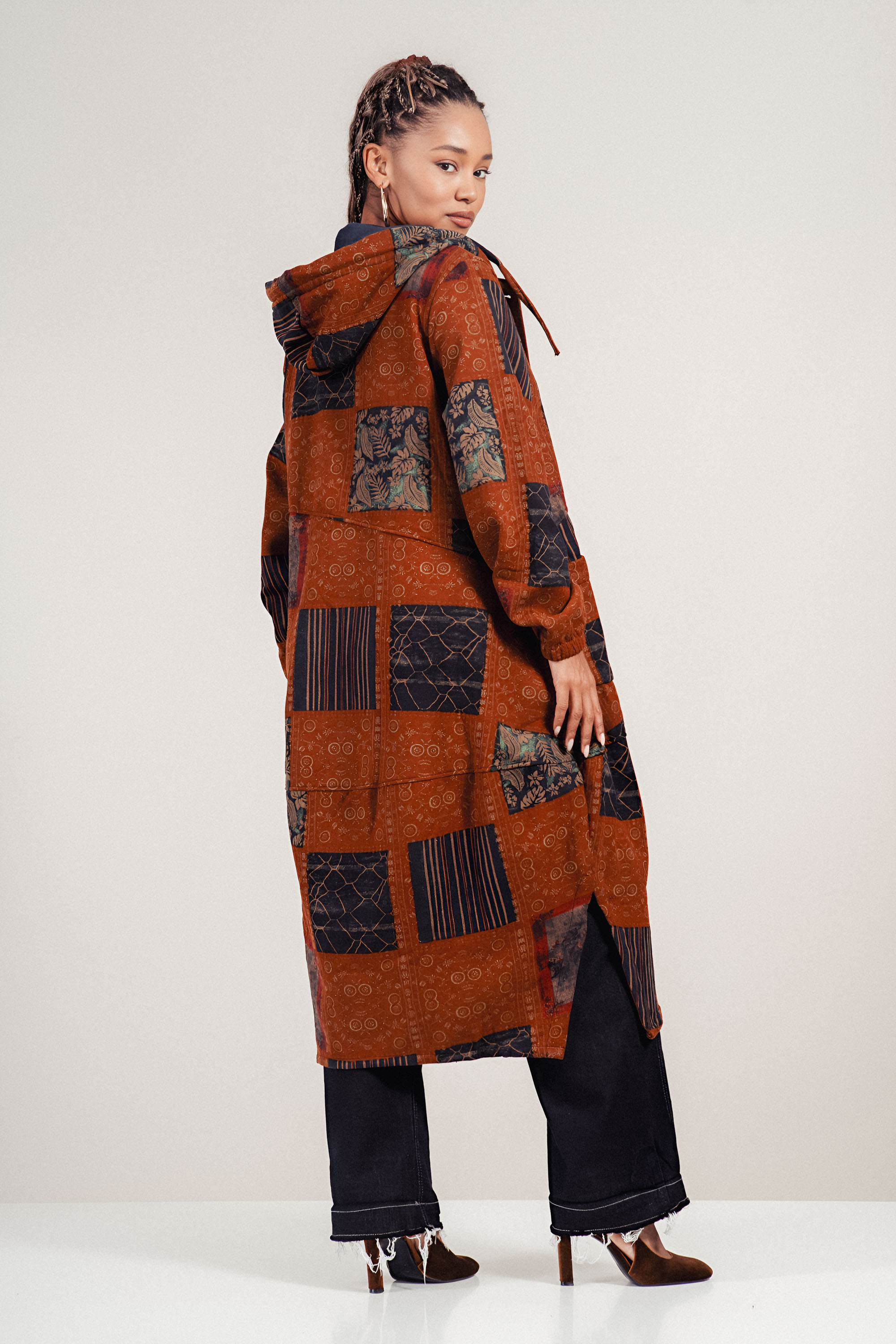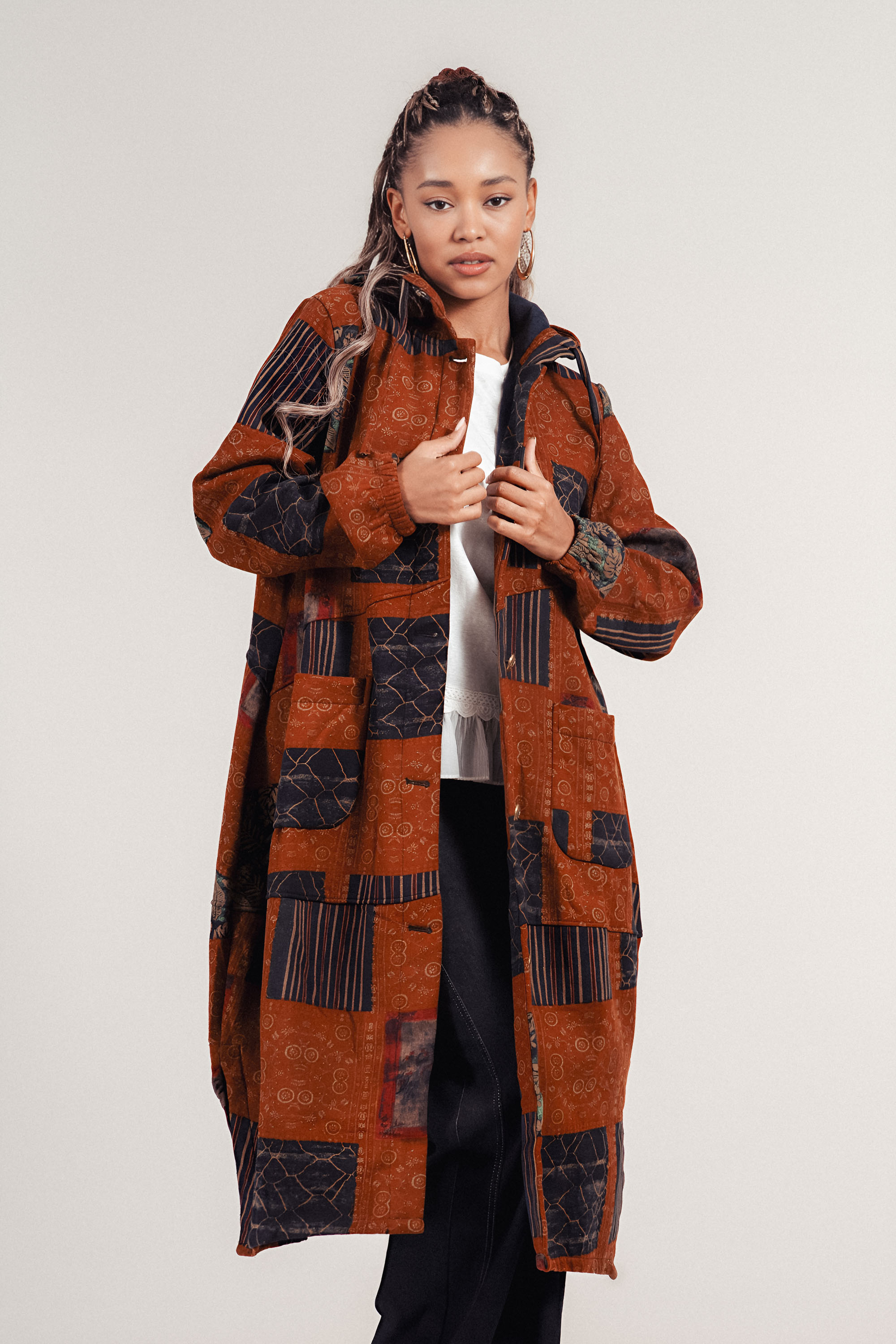 Удобно и стилно палто с ватирана вътрешност, подходящо за хладните сезони. Моделът впечатлява с артистичен принт на квадрати тип мрежа и райе в черно. Закопчаването със златисти копчета и качулката с връзки добавят практичен завършек. Подходящо както за ежедневие, така и за по-елегантна визия.