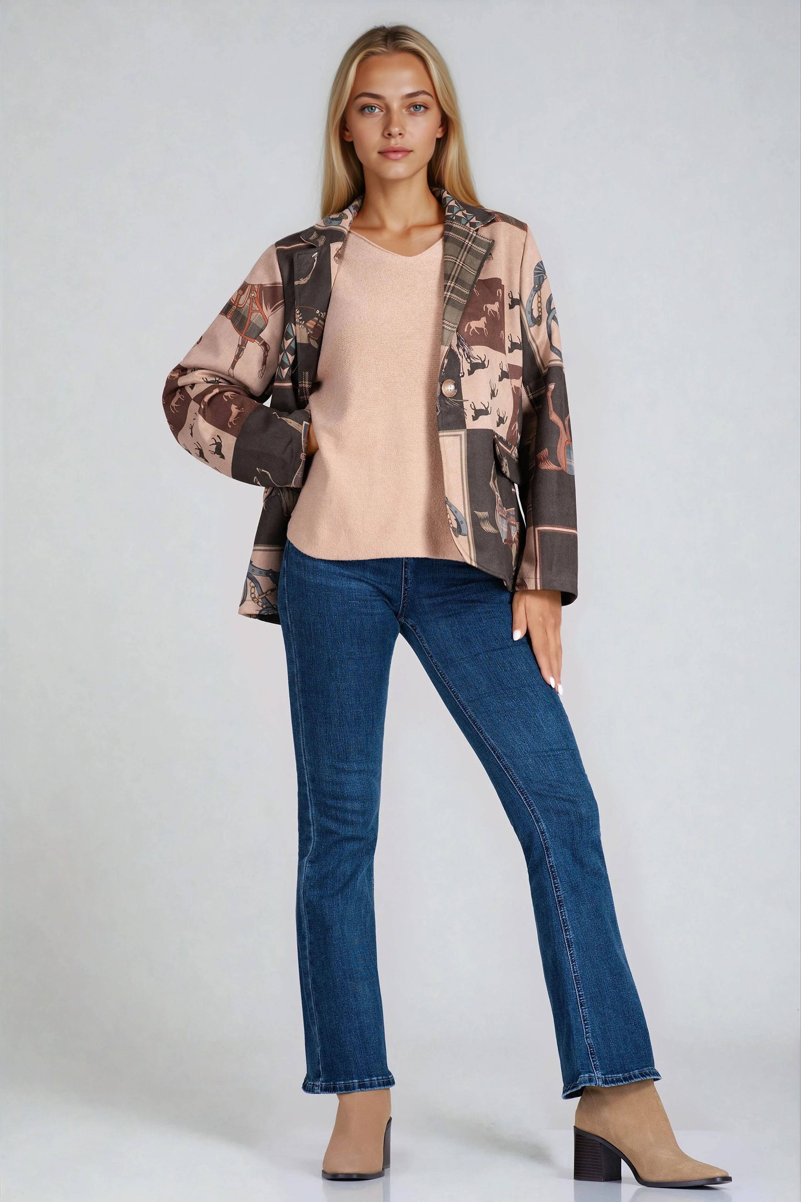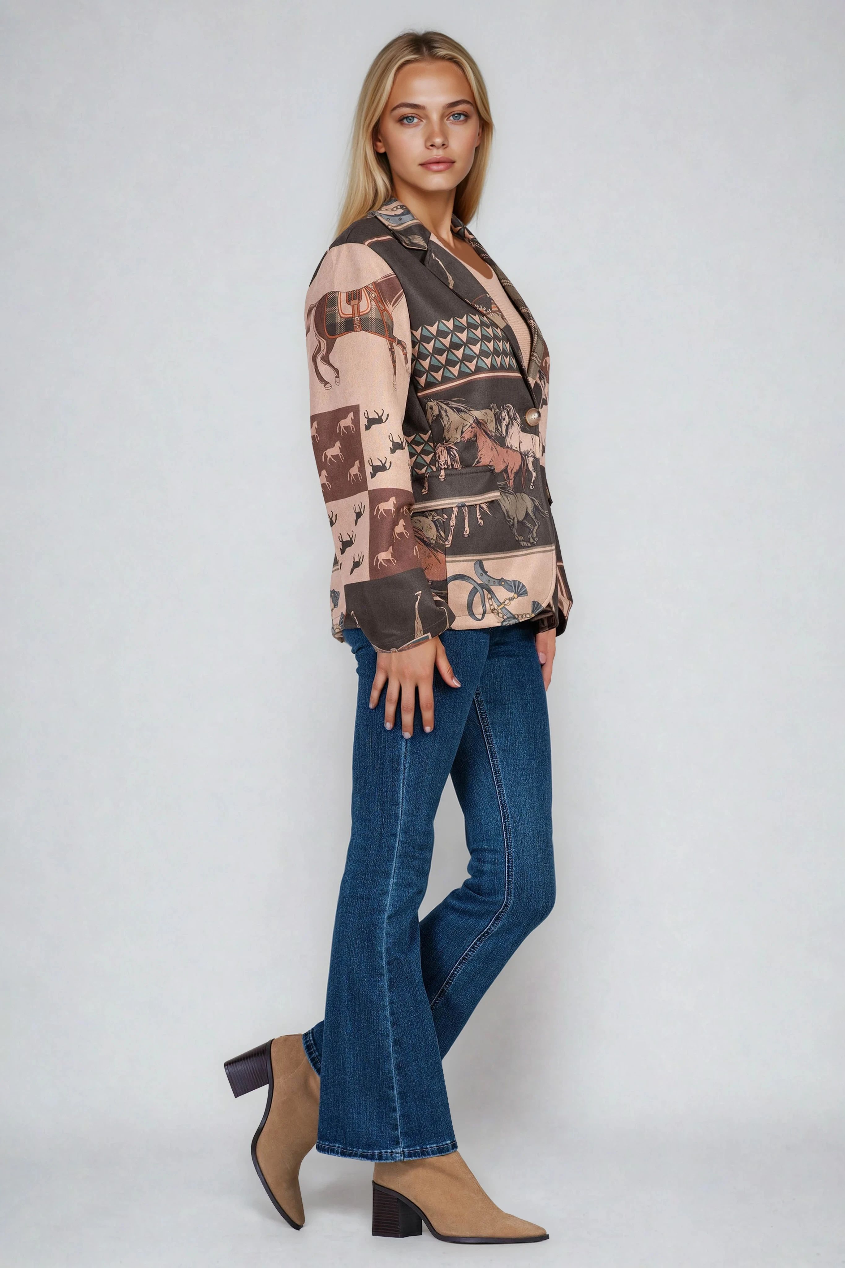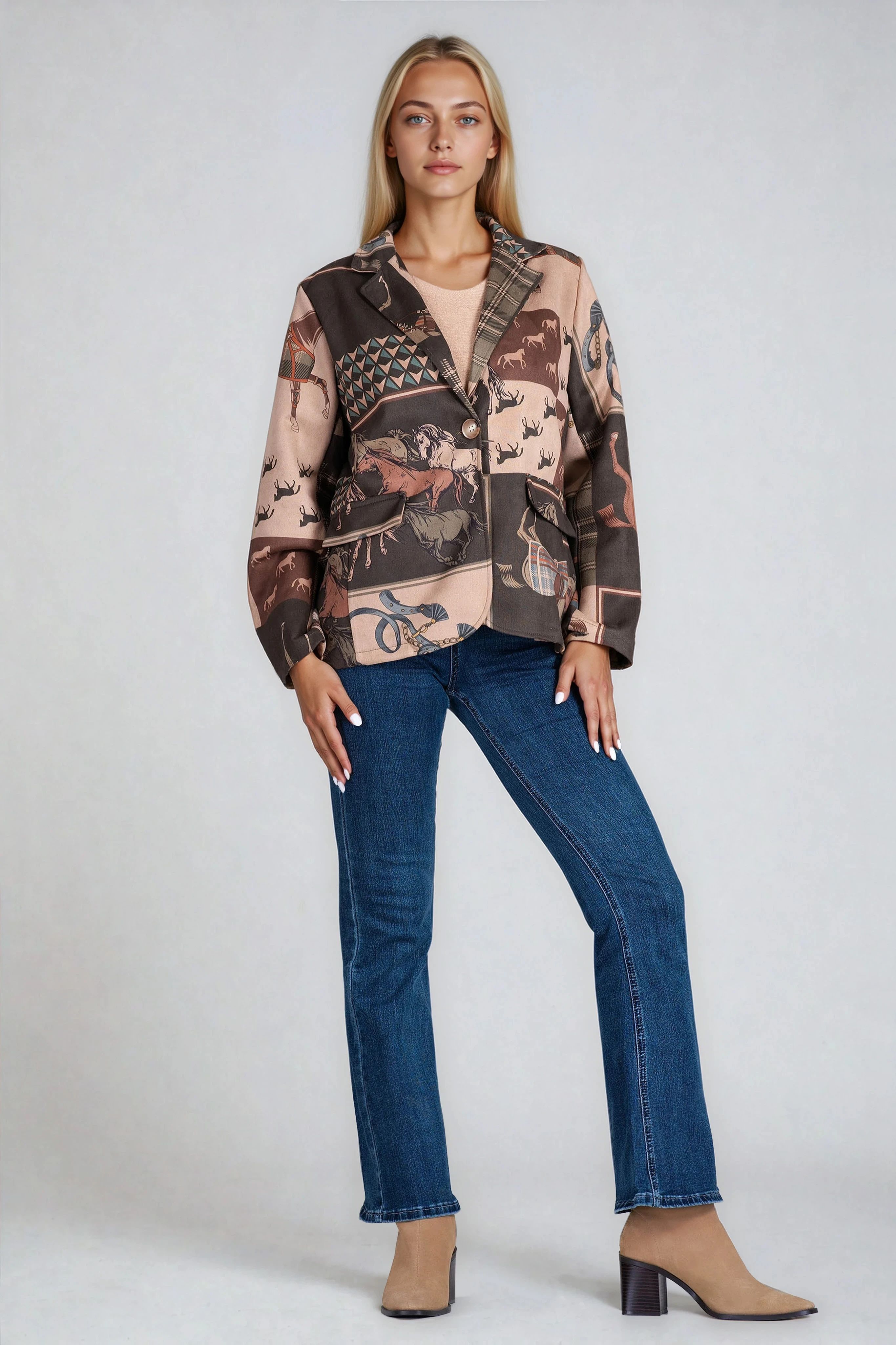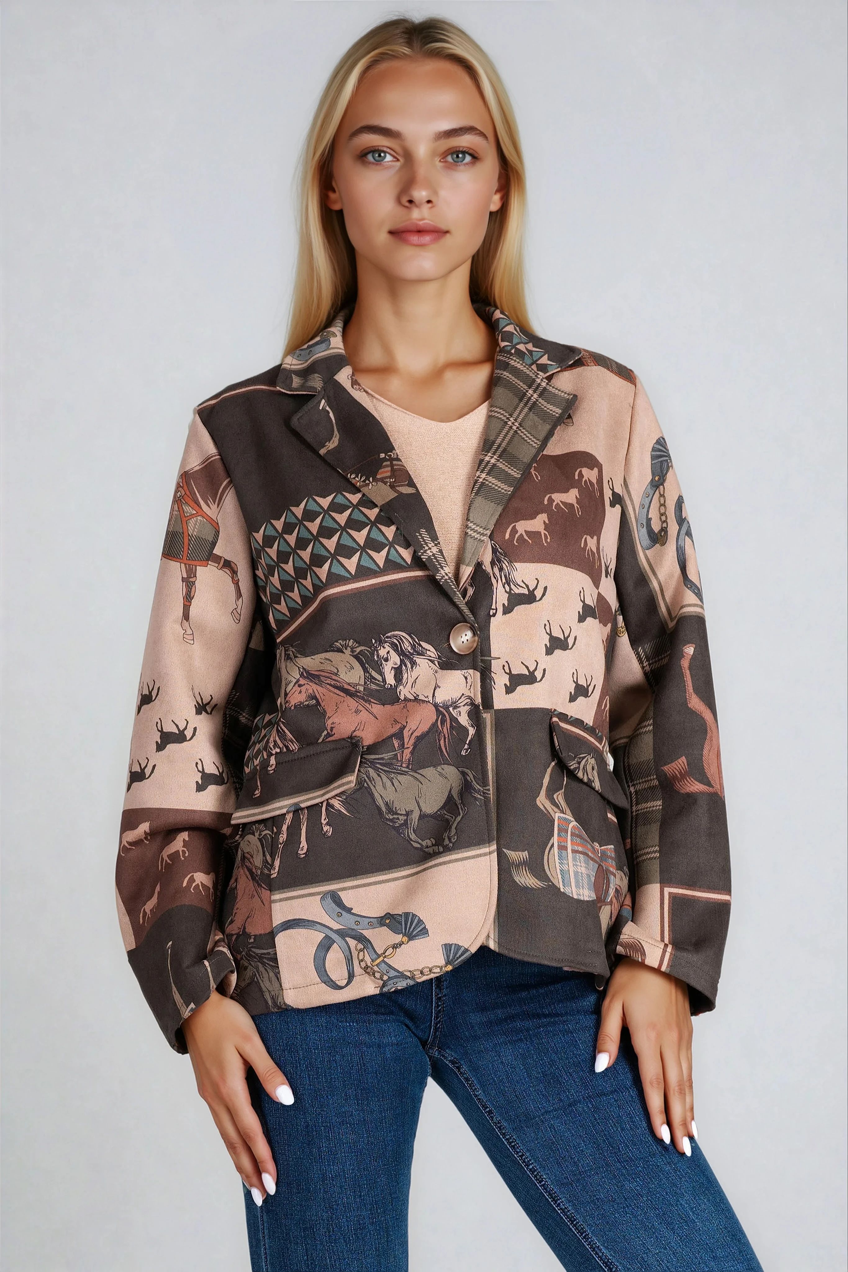 Смело сако тип велур с артистичен принт, съчетаващ каре, ездачески елементи и фигури на коне. Закопчаването с копчета и декоративните джобове добавят завършеност към дизайна. Подходящо за комбиниране както с дънки, така и с пола за по-екстравагантна визия.