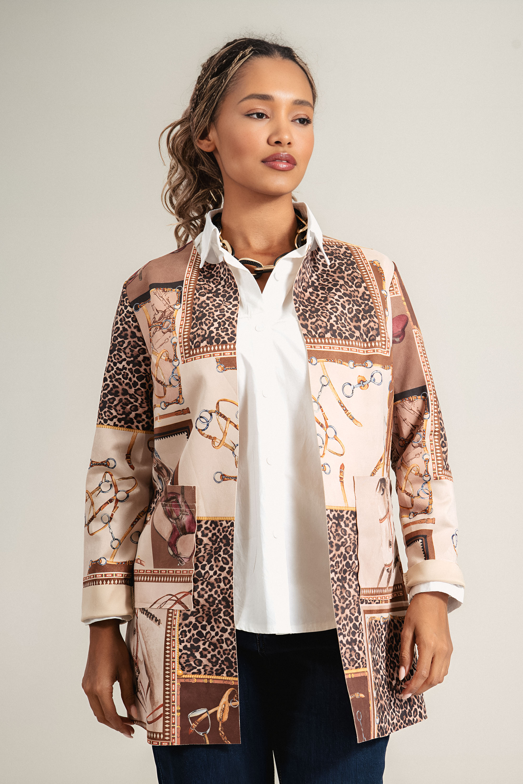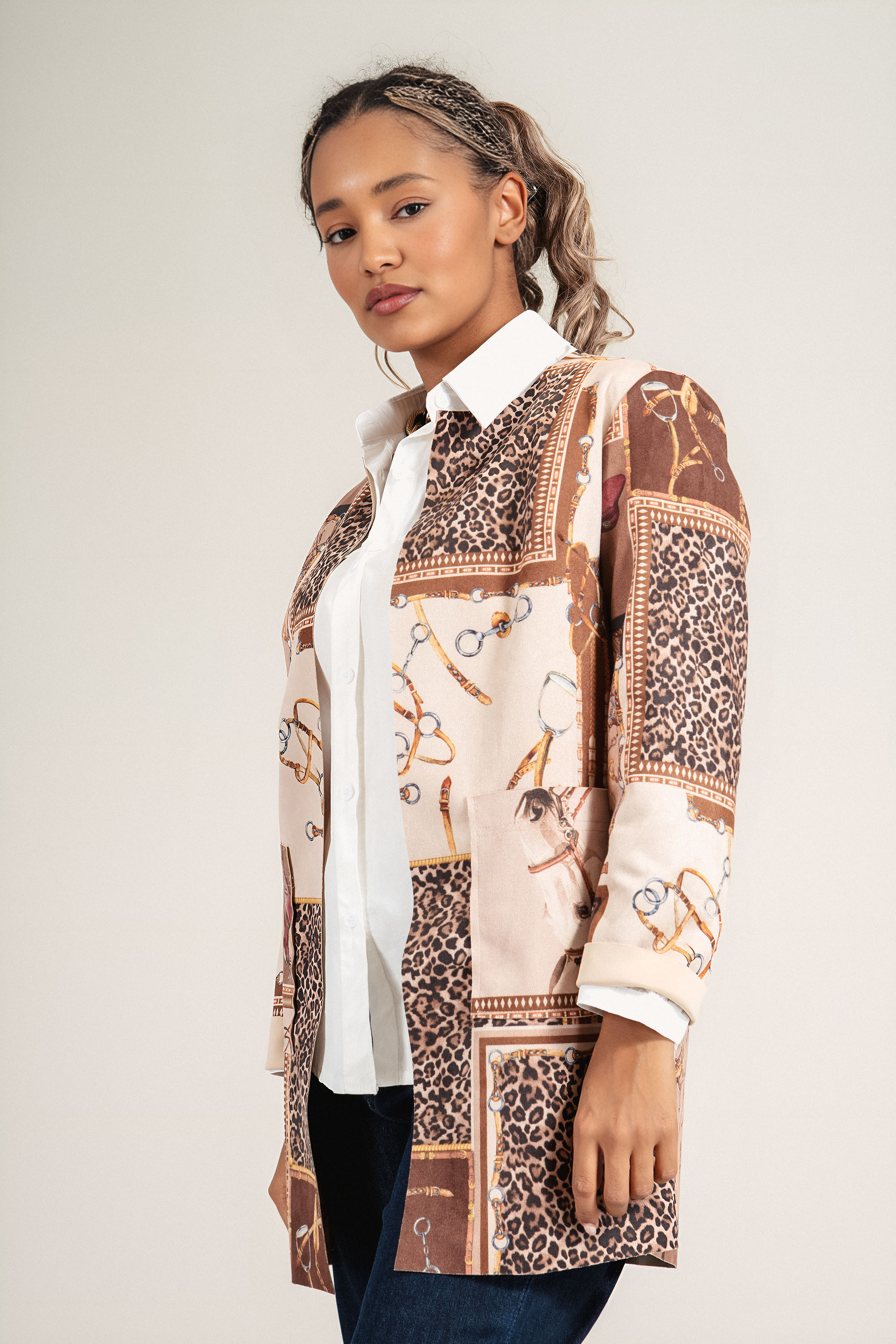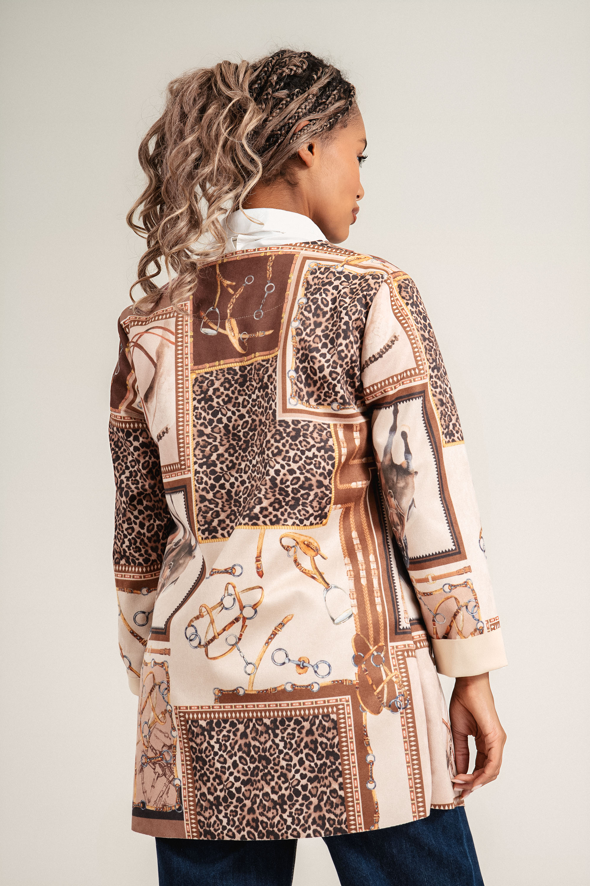 Модерно сако с артистичен принт, комбиниращ леопардов прин със животински елементи. Изработено от мека и устойчива материя, моделът е с обло деколте и без закопчаване за по-непринудена, но елегантна визия. Чудесен акцент към едноцветна риза или блуза, подходящо както за ежедневието, така и за по-специални поводи.