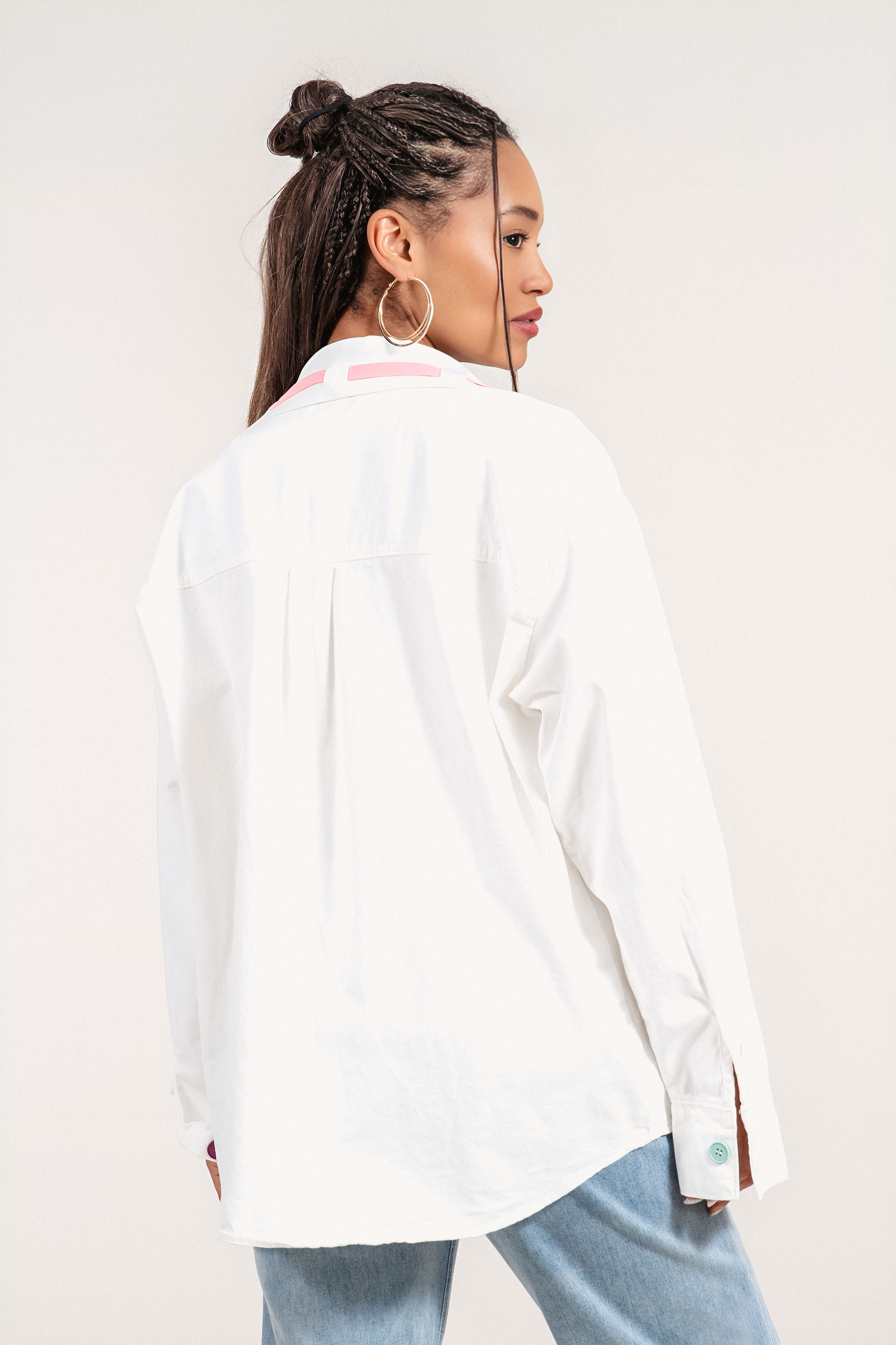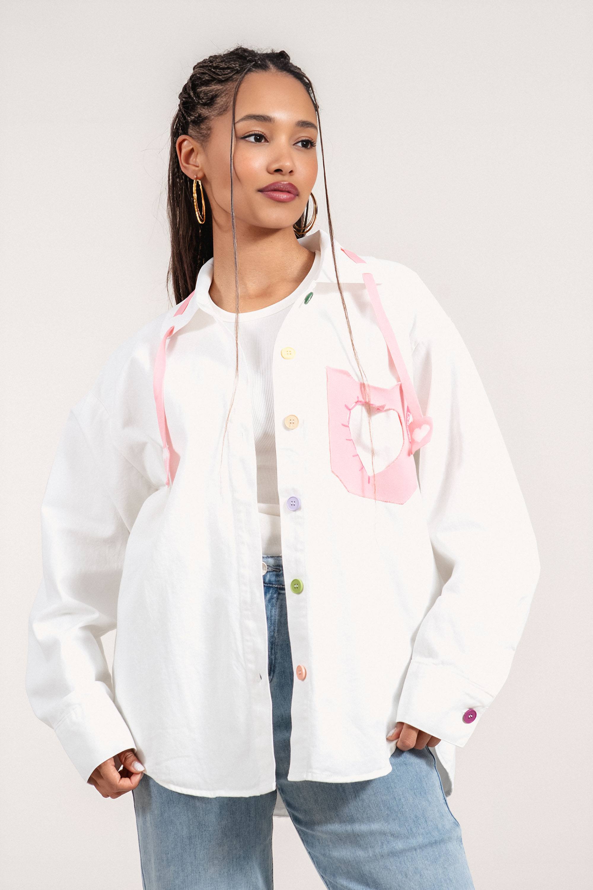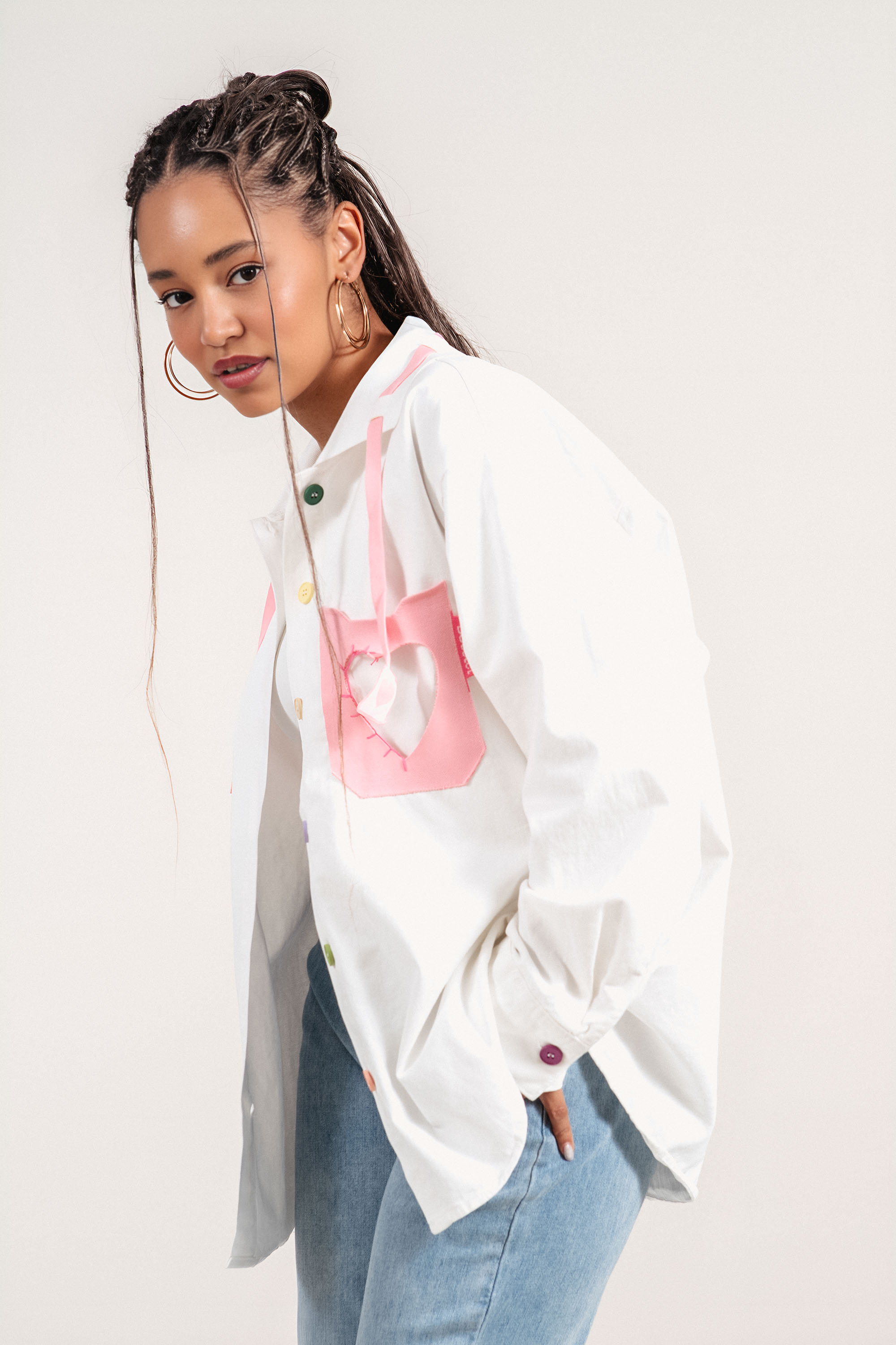 Леко преходно яке с модерен и свеж дизайн, подходящо за пролетно-летния сезон. Памучната материя осигурява комфорт, а добавените синтетични влакна допринасят за по-добра устойчивост на формата. Акцент са цветните копчета и ефектният детайл с розово сърце, които придават артистичен и разчупен стил. Свободната линия позволява лесно наслояване върху тениски и топове за завършена ежедневна визия.