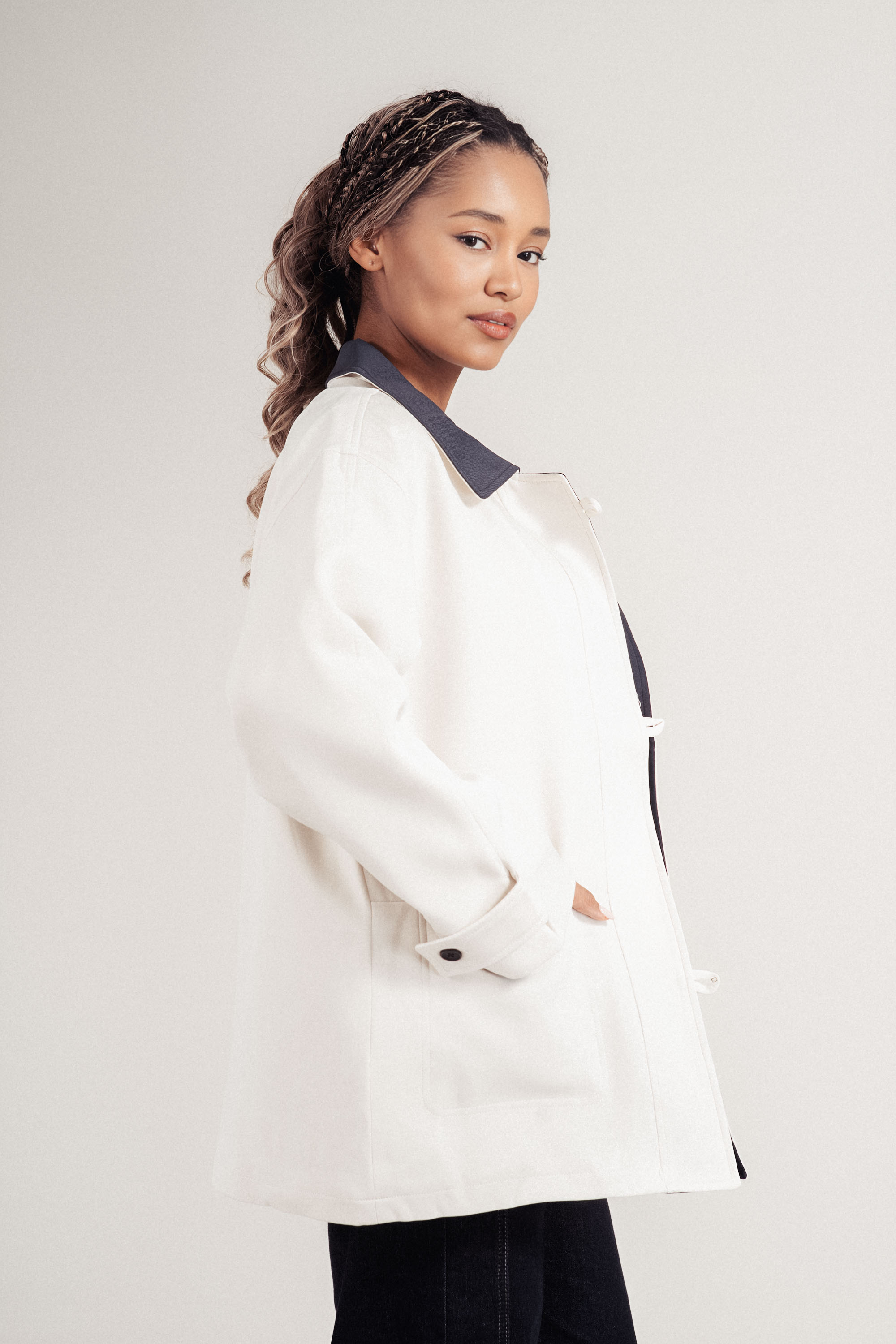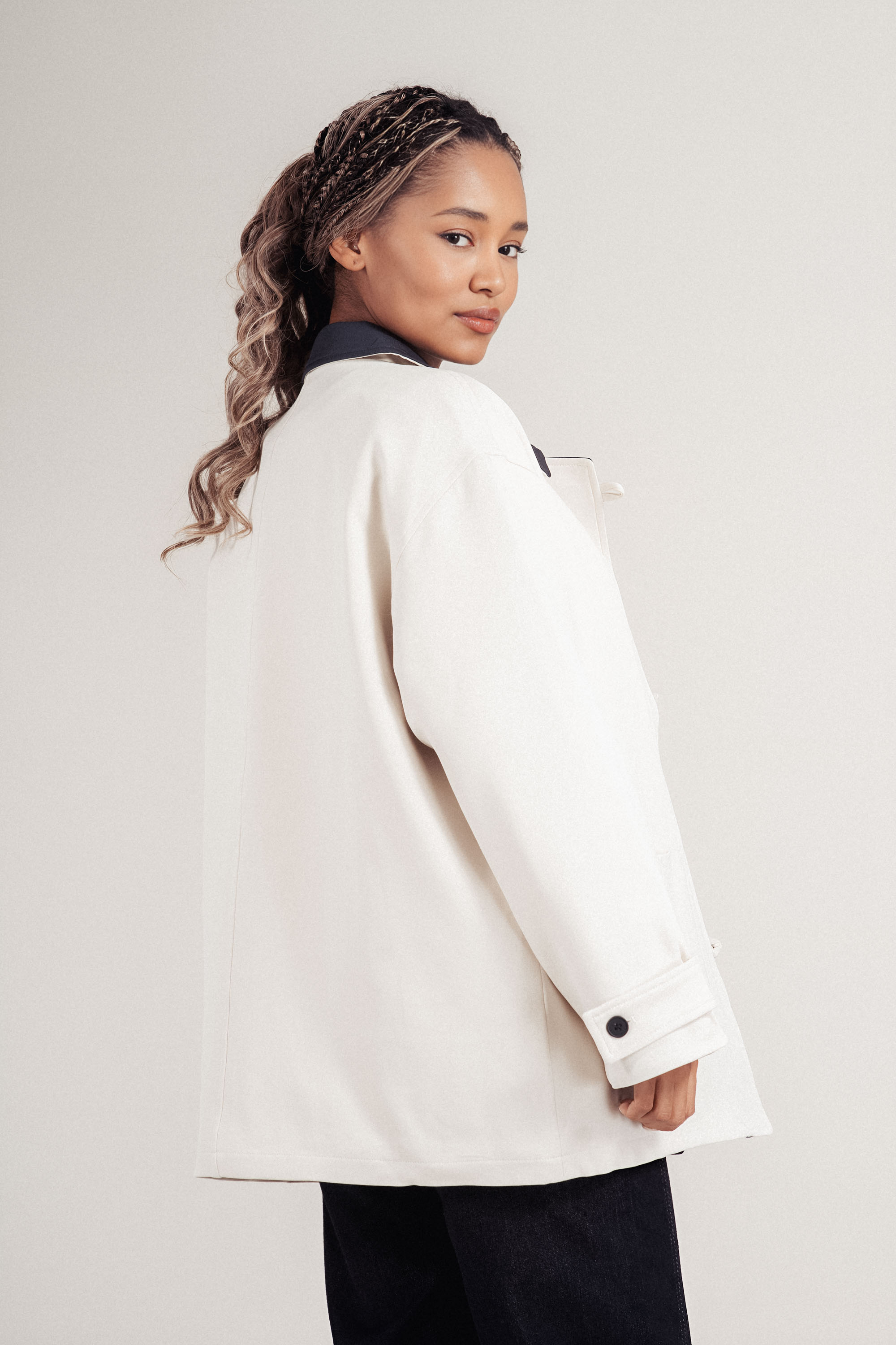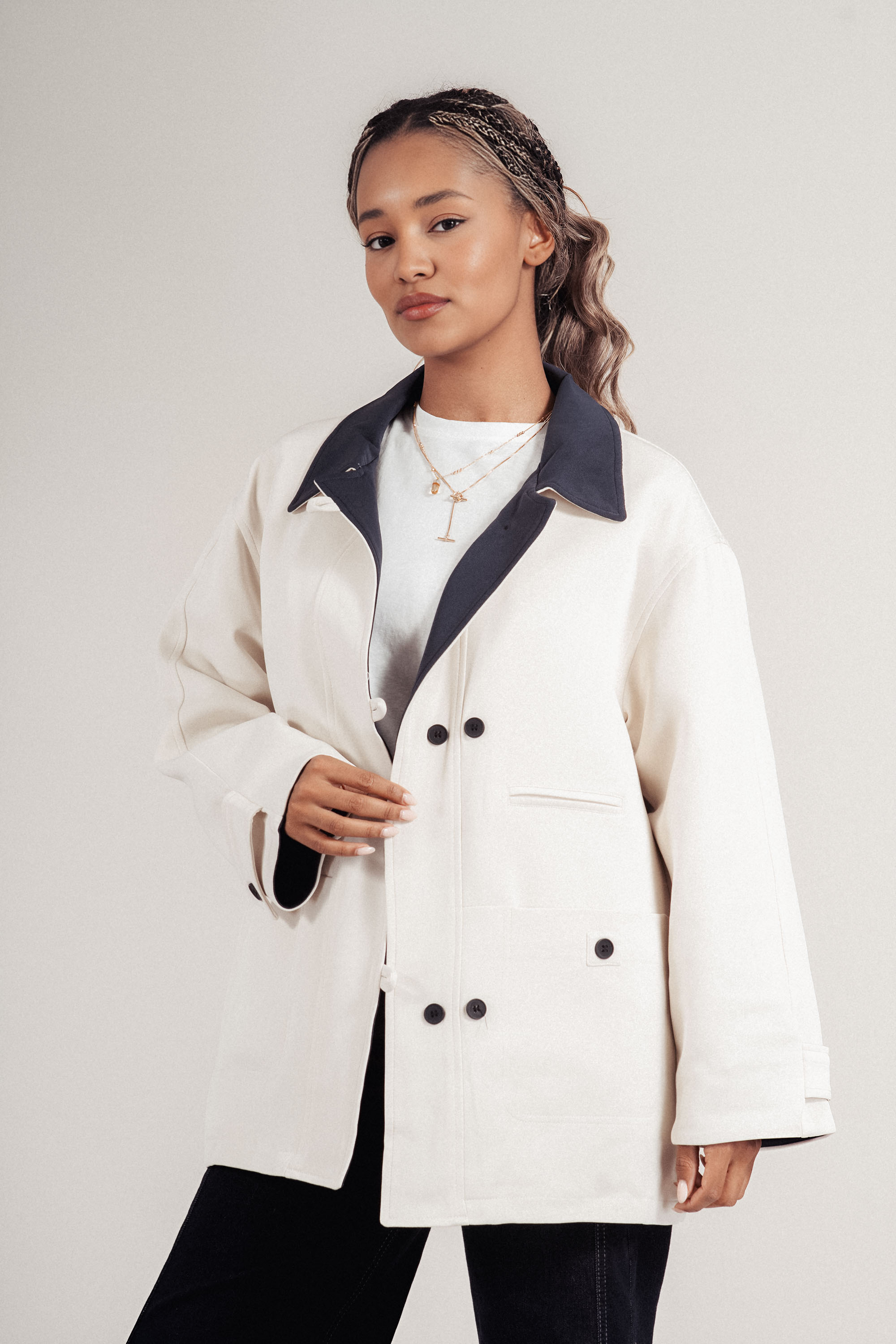 Модерен прочит на класическо яке, изработено от лека материя, подходяща за преходните сезони. Контрастната яка и ревер в тъмносиньо създават отличителна визия. Двуредовото закопчаване с черни копчета и джобовете добавят елегантен акцент. Комфортно и стилно допълнение към градската визия.