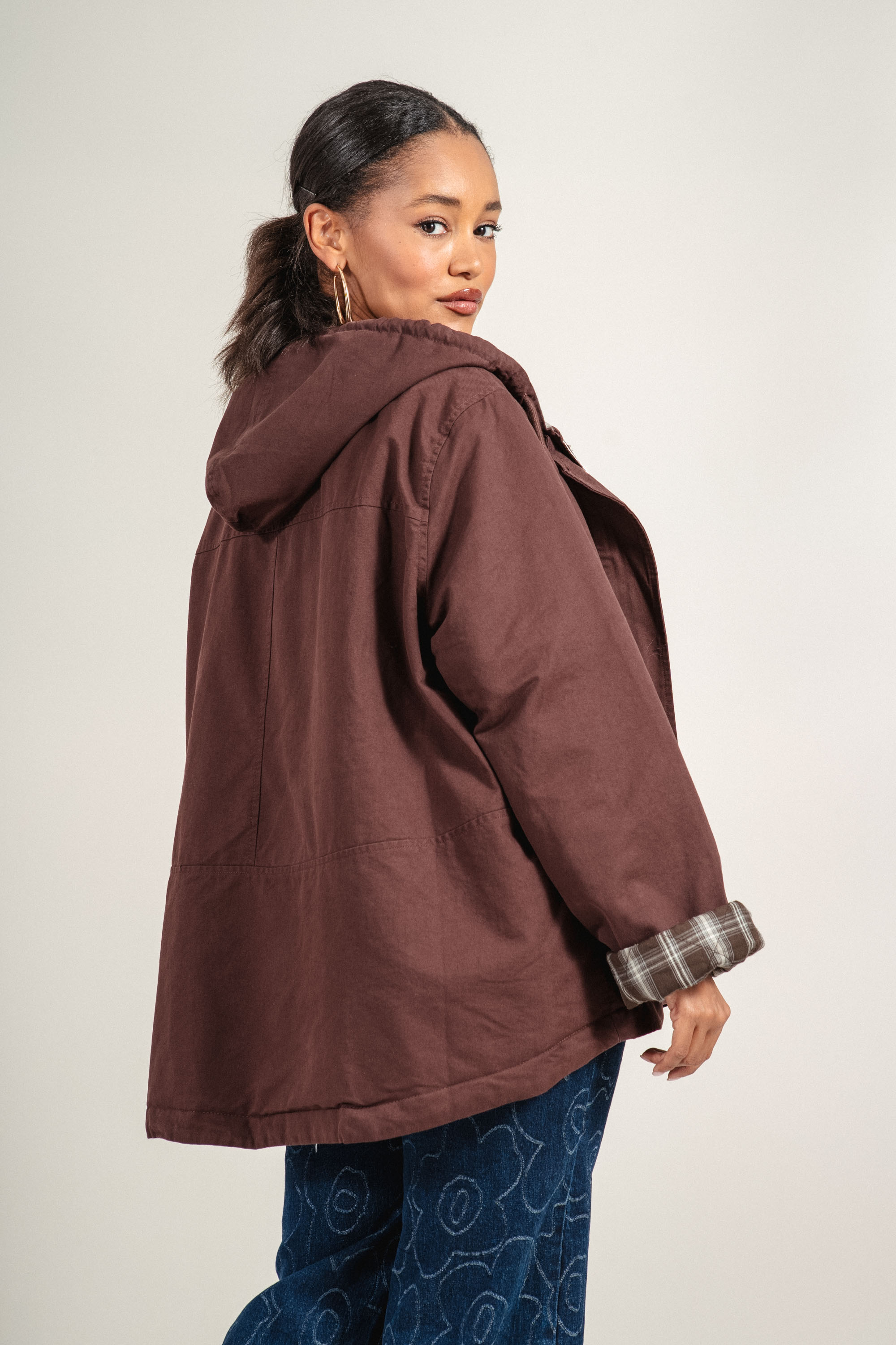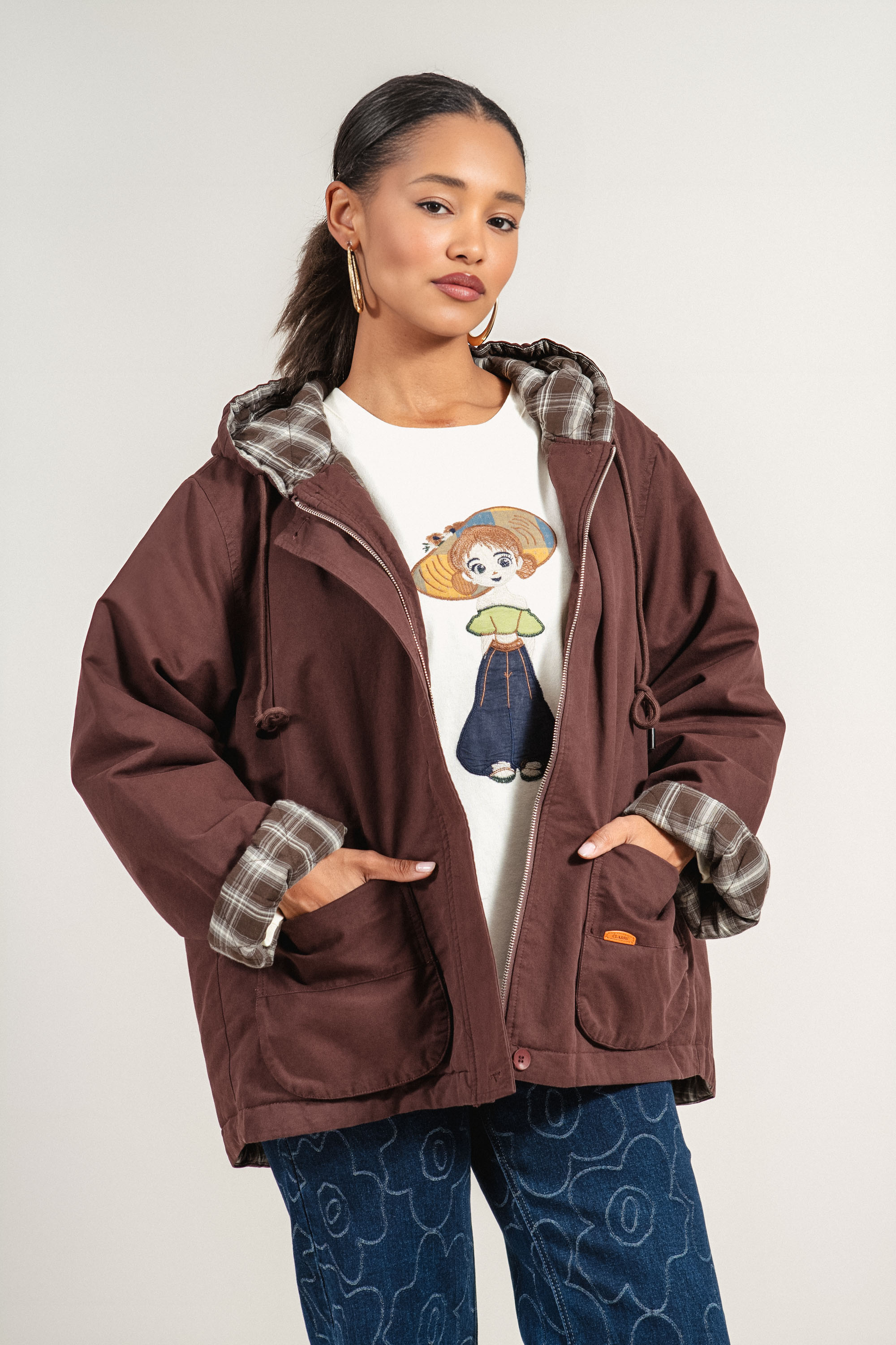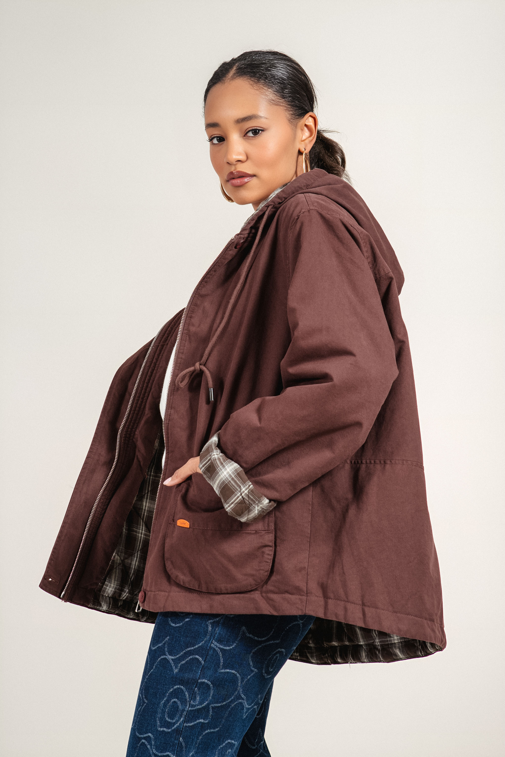 Дамско яке в кафяво с карирана подплата и качулка с връзки