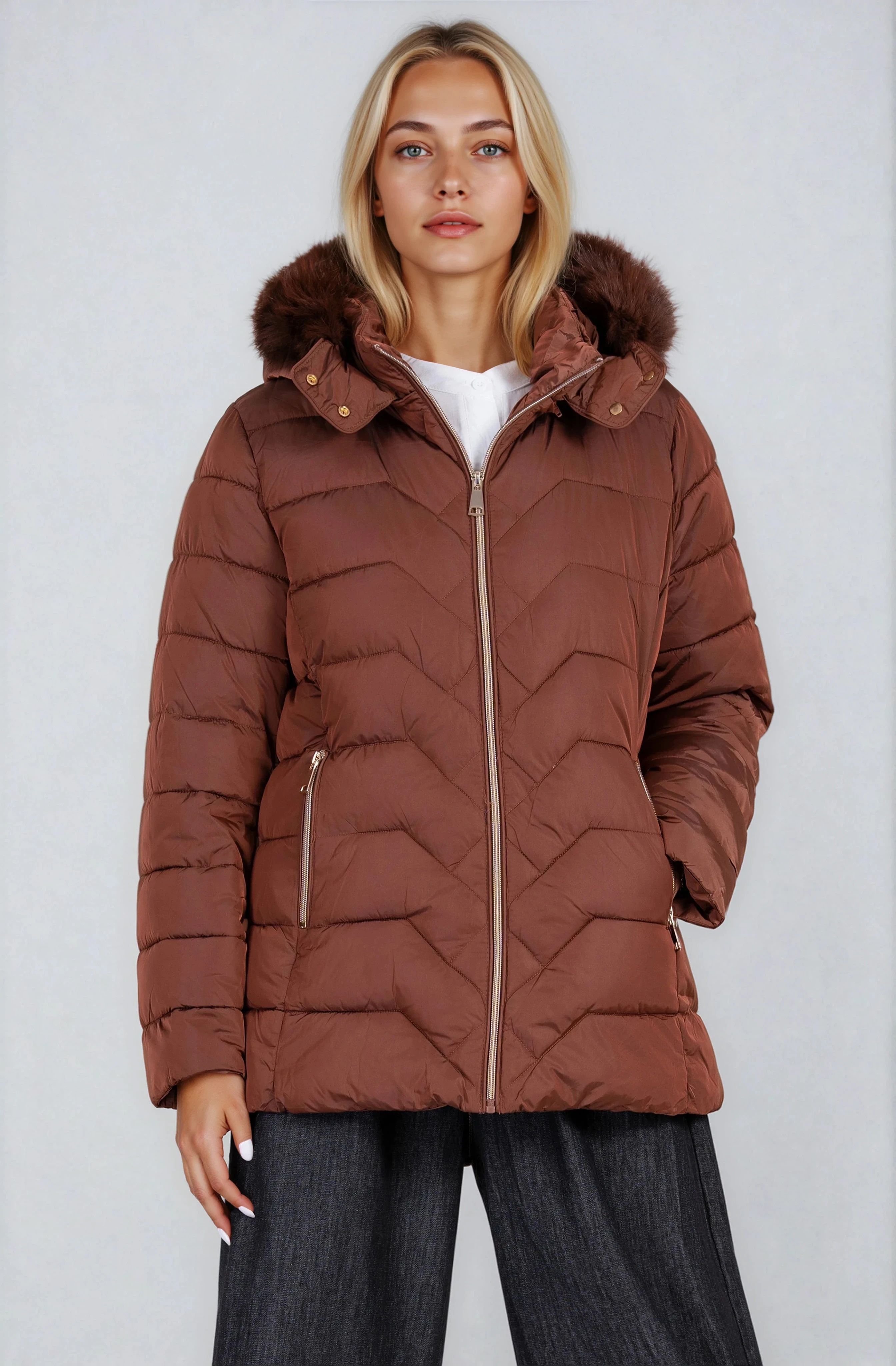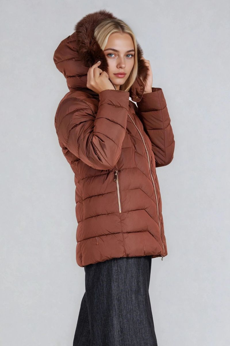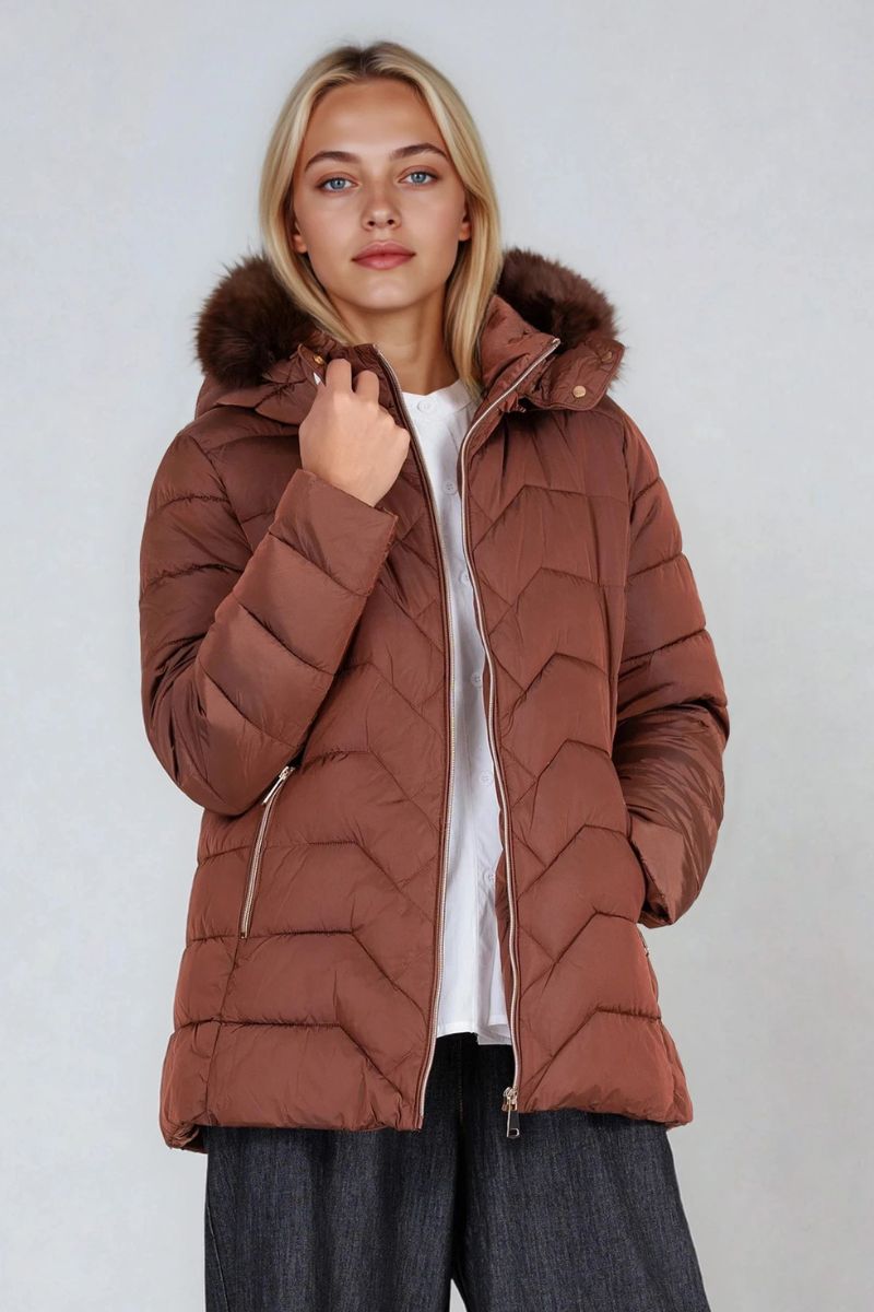 Елегантно и практично, това капитонирано яке в медено кафяв цвят е отлично решение за ежедневна визия в студените дни. Със своята топла подплата и качулка с пух, моделът осигурява комфорт и защита от вятъра. Златните ципове и декоративните тик-так копчета придават стилен акцент. Подходящо за есенно-зимния сезон, както за градска разходка, така и за пътуване.