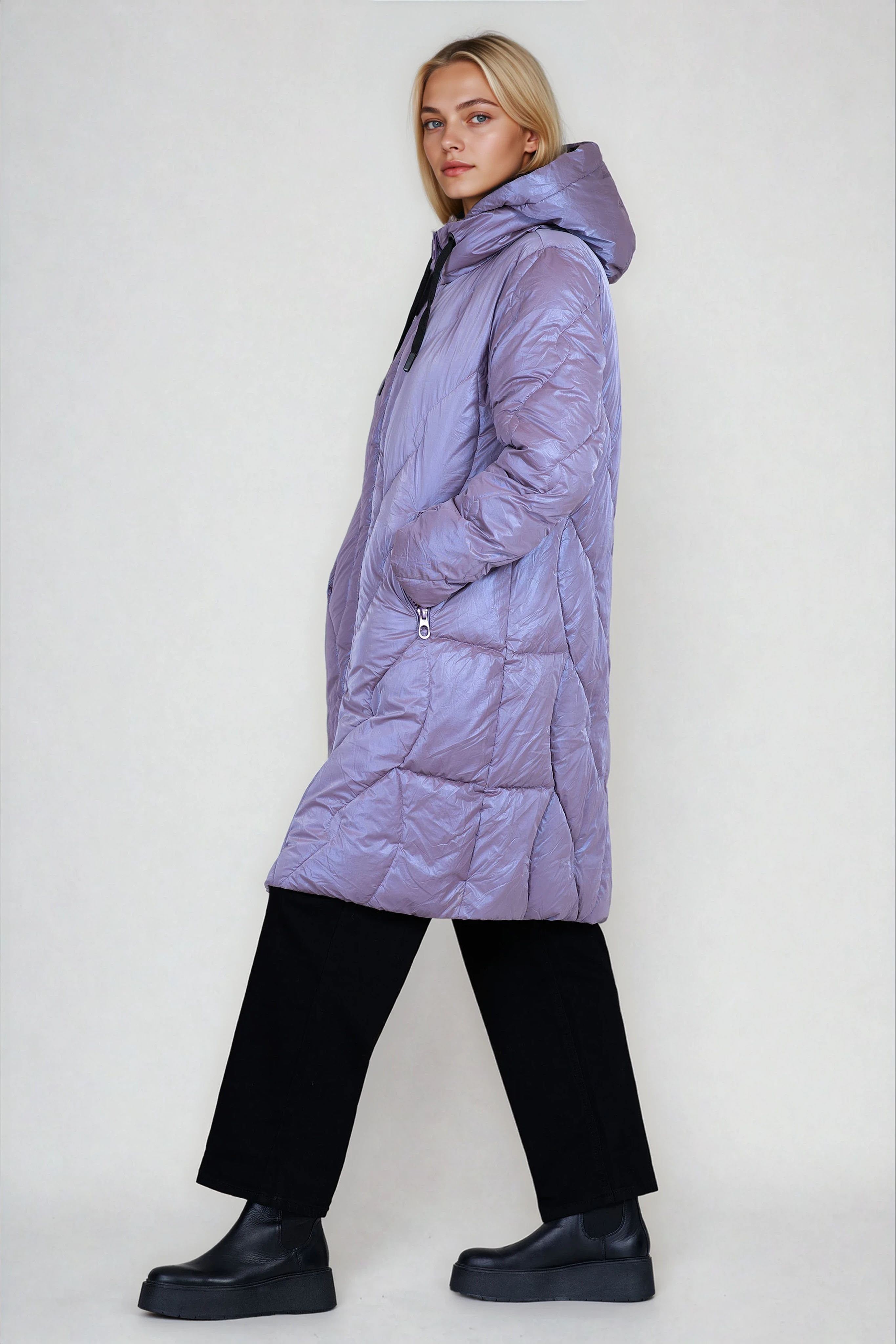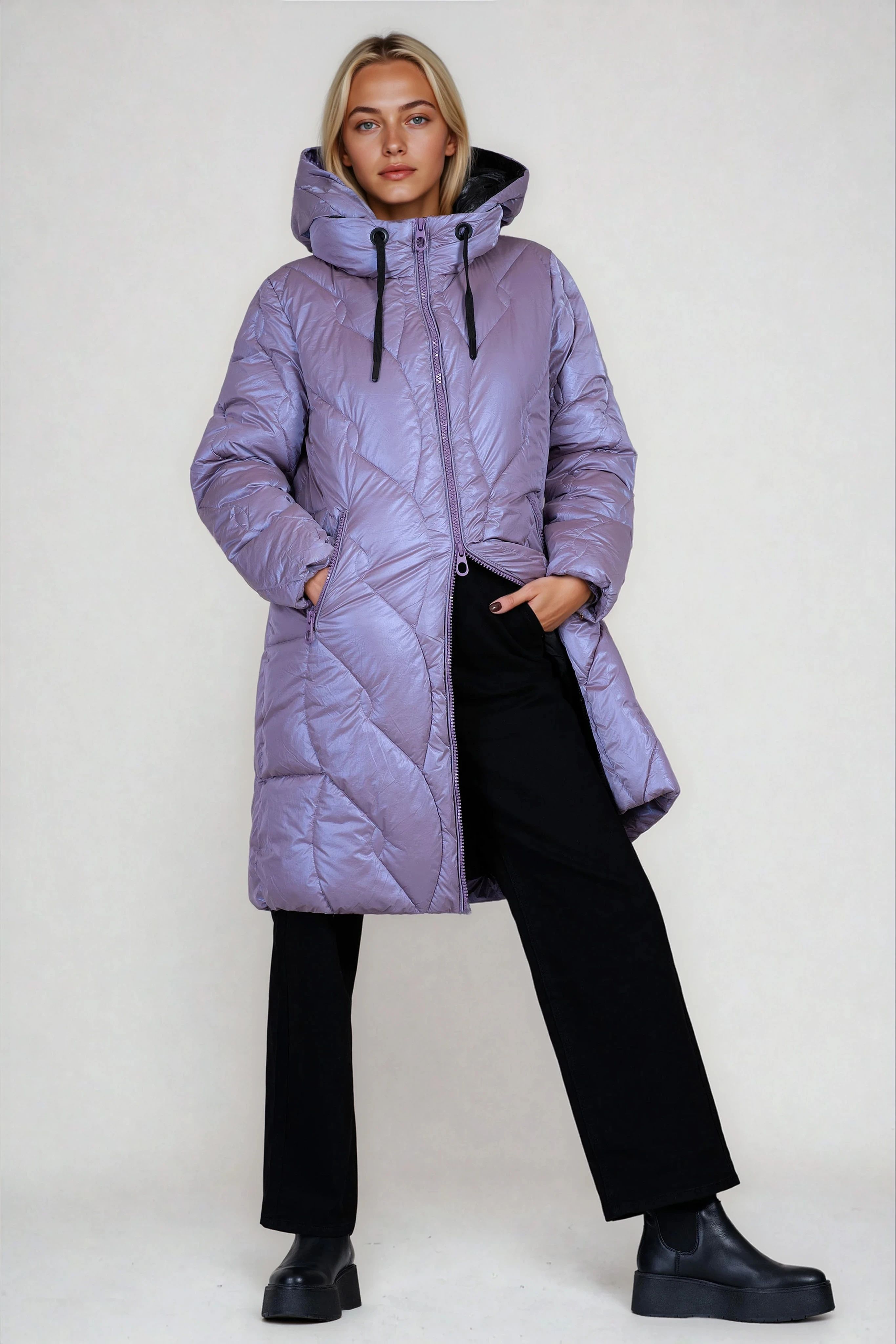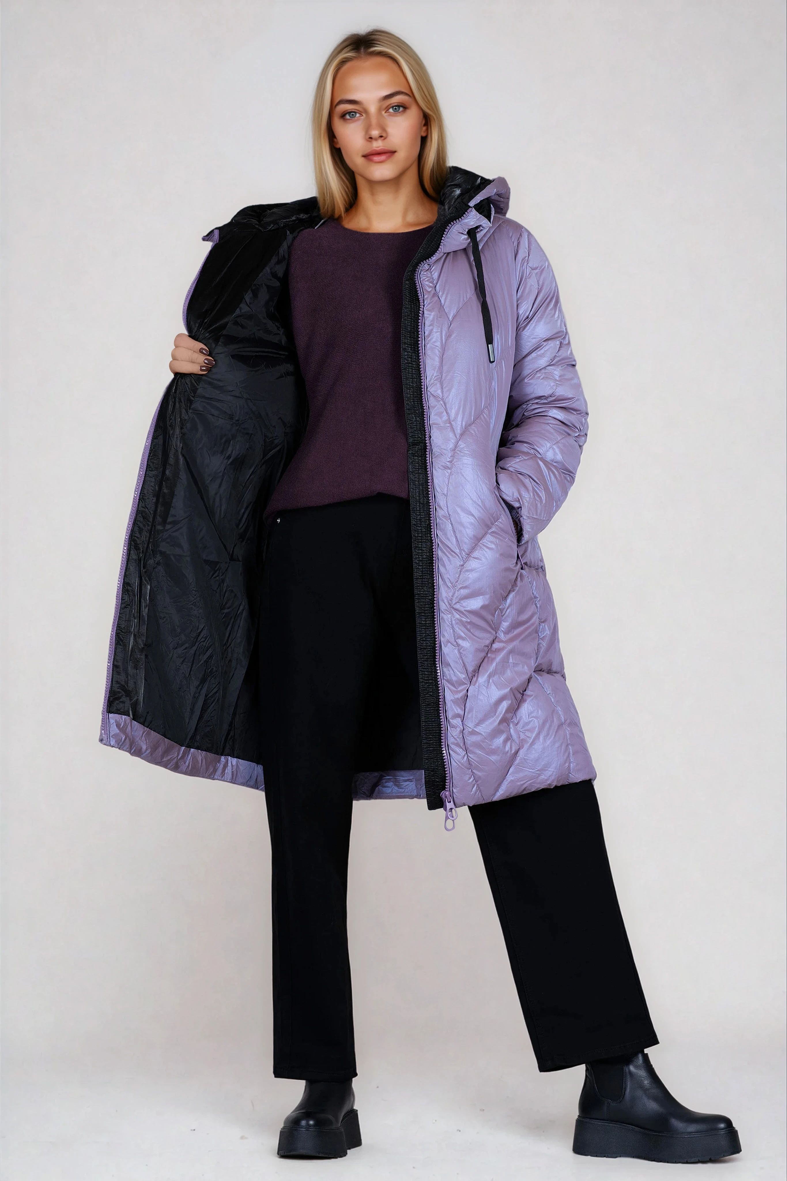 Това дълго яке в актуален лилав цвят впечатлява с модерна визия и удобство. Разполага с яка, сваляща се качулка и контрастни черни връзки, които придават характер. Хастарът и закопчаването с цип гарантират топлина и комфорт през студените дни. Идеален избор за зимен стил с отличителен акцент.