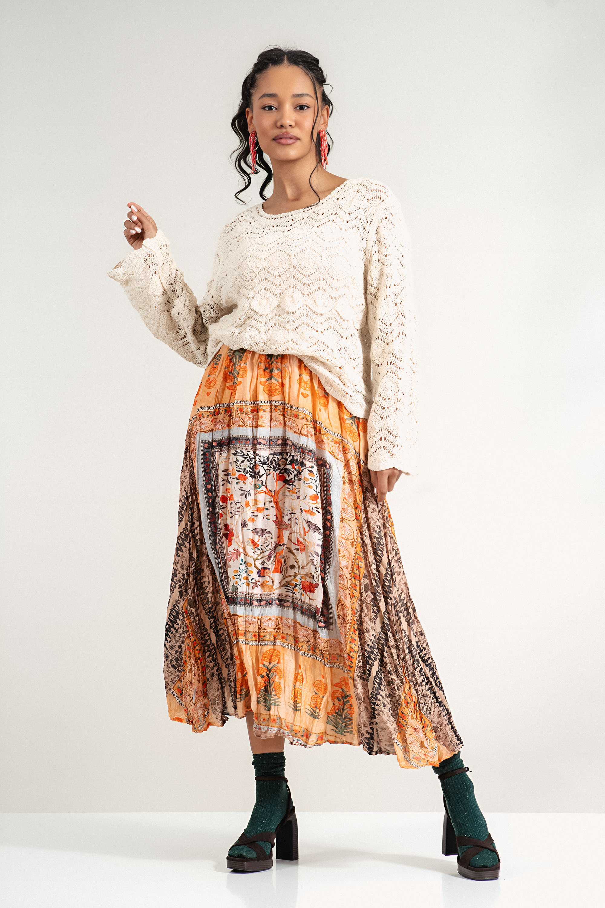 Тази ефектна пола с етно вдъхновение съчетава богатство от цветове и орнаменти. Оранжевата и зелена палитра, в съчетание с мотиви на дървета и флорални елементи, създават запомняща се визия. Ластичната талия осигурява удобство и адаптивност, а свободната кройка подчертава женствеността и придава лекота на силуета.