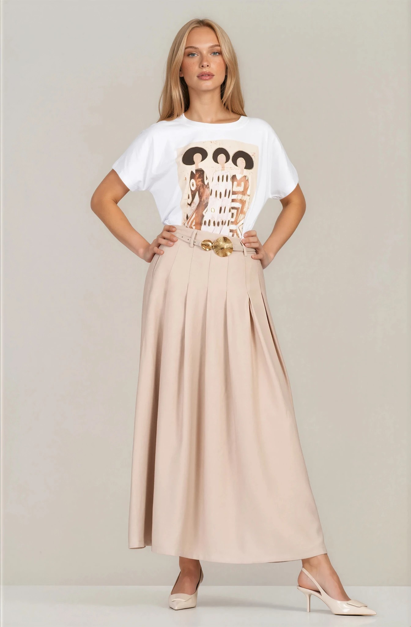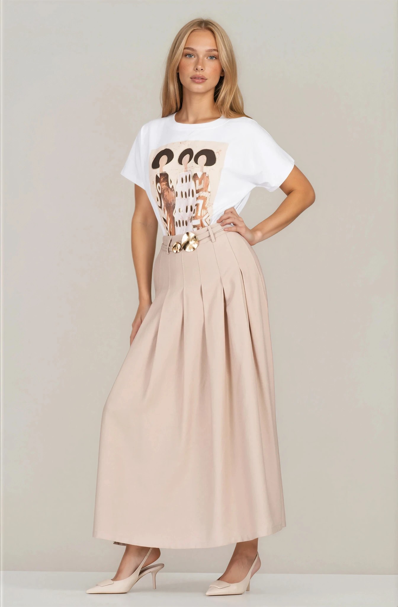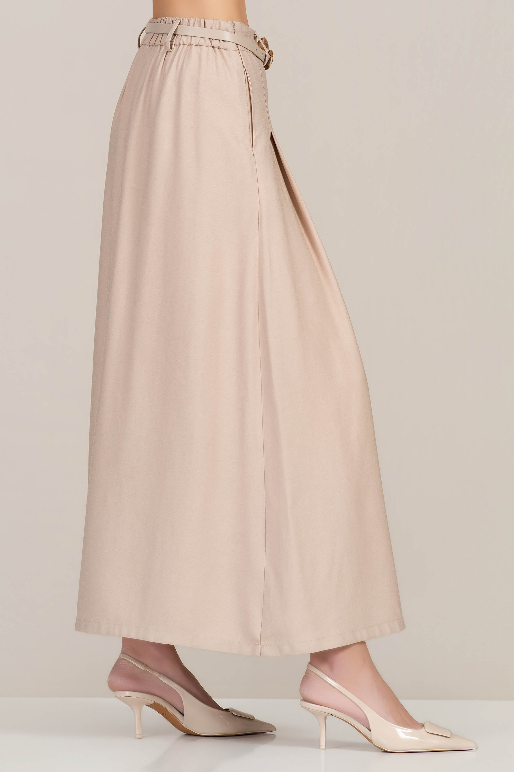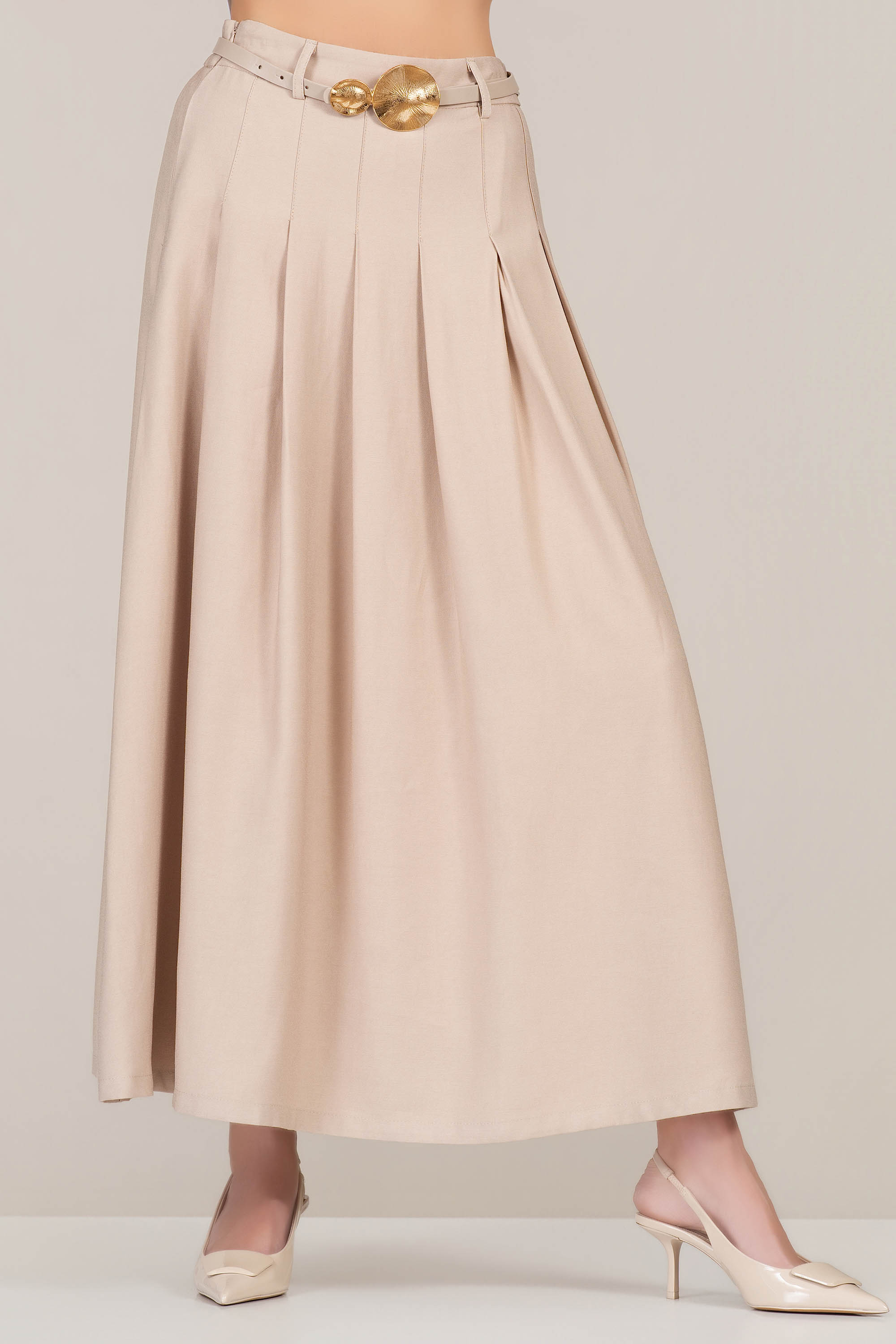 Елегантна пола в нежен бежов нюанс, която съчетава комфорт и изискан стил. Материята с високо съдържание на район и вискоза е мека, лека и приятна на допир, като осигурява красиво падаща линия. Моделът е с еластична талия и колан със златиста декоративна тока, които подчертават силуета и добавят стилен акцент. Плисетата и практичните джобове създават движение и удобство, което прави полата подходящ избор както за ежедневни визии, така и за по-елегантни поводи.