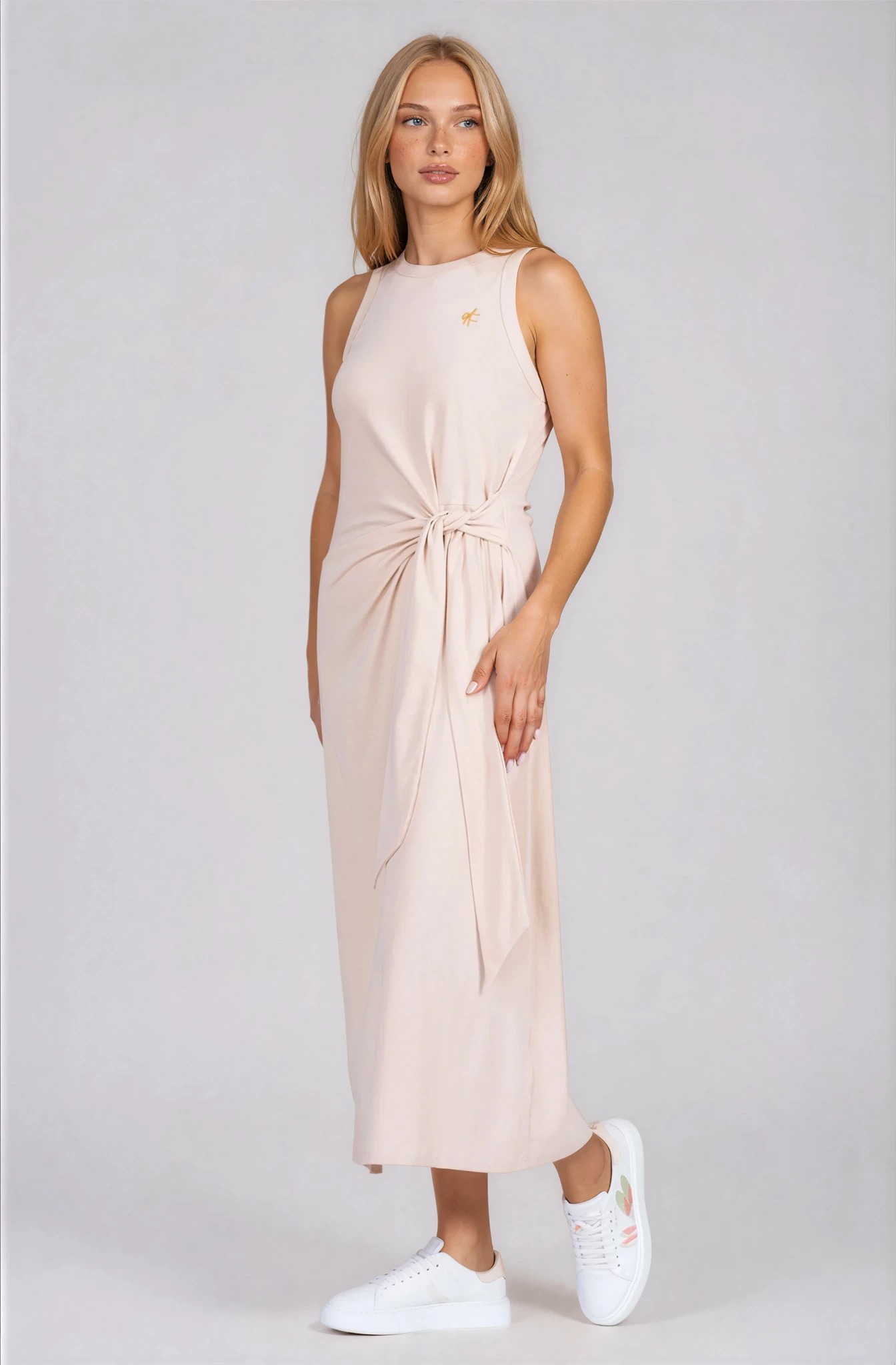 Дълга рокля "Dragonfly" от памук в бежово с ефектно завързване и бродирано лого