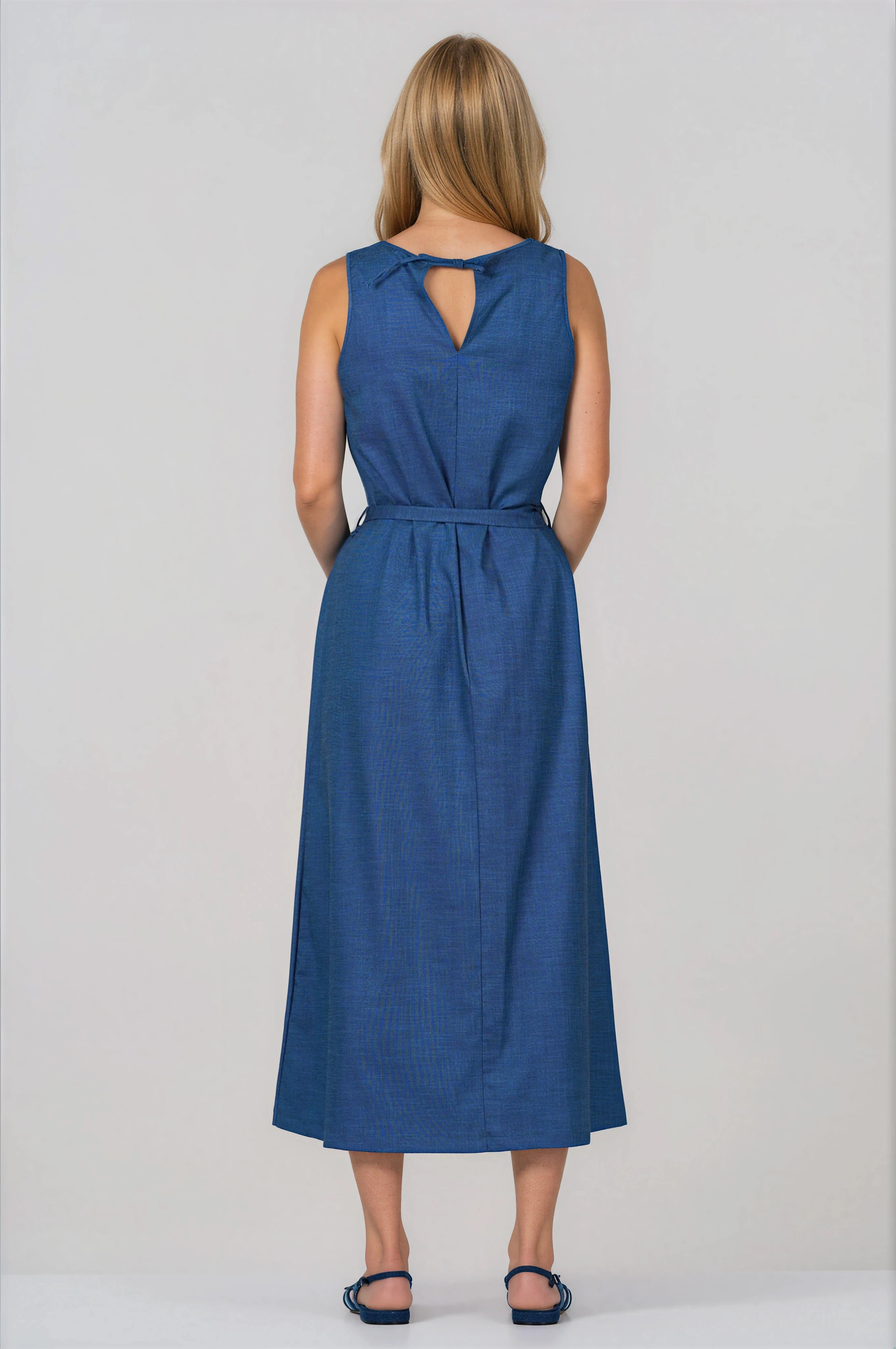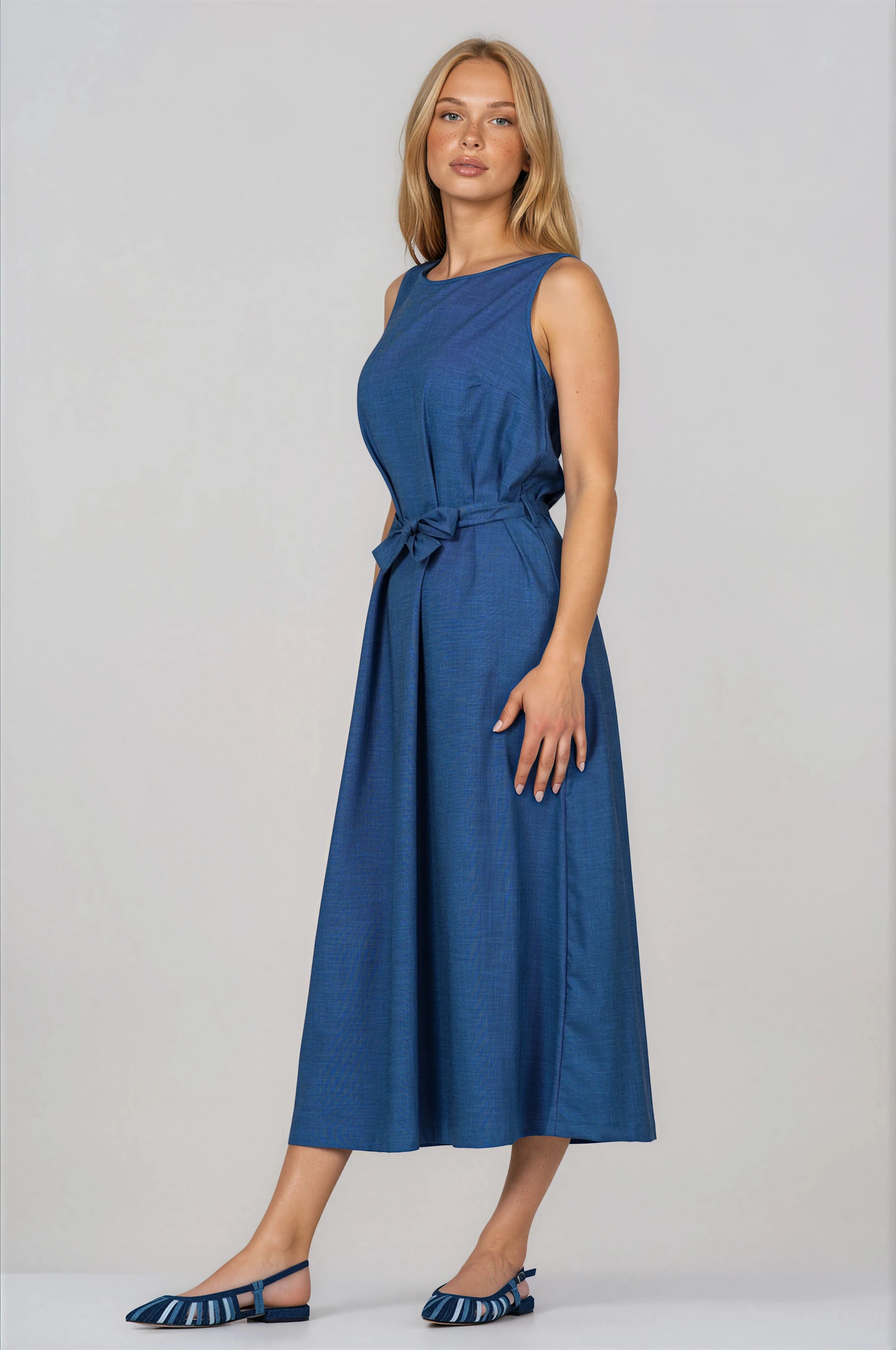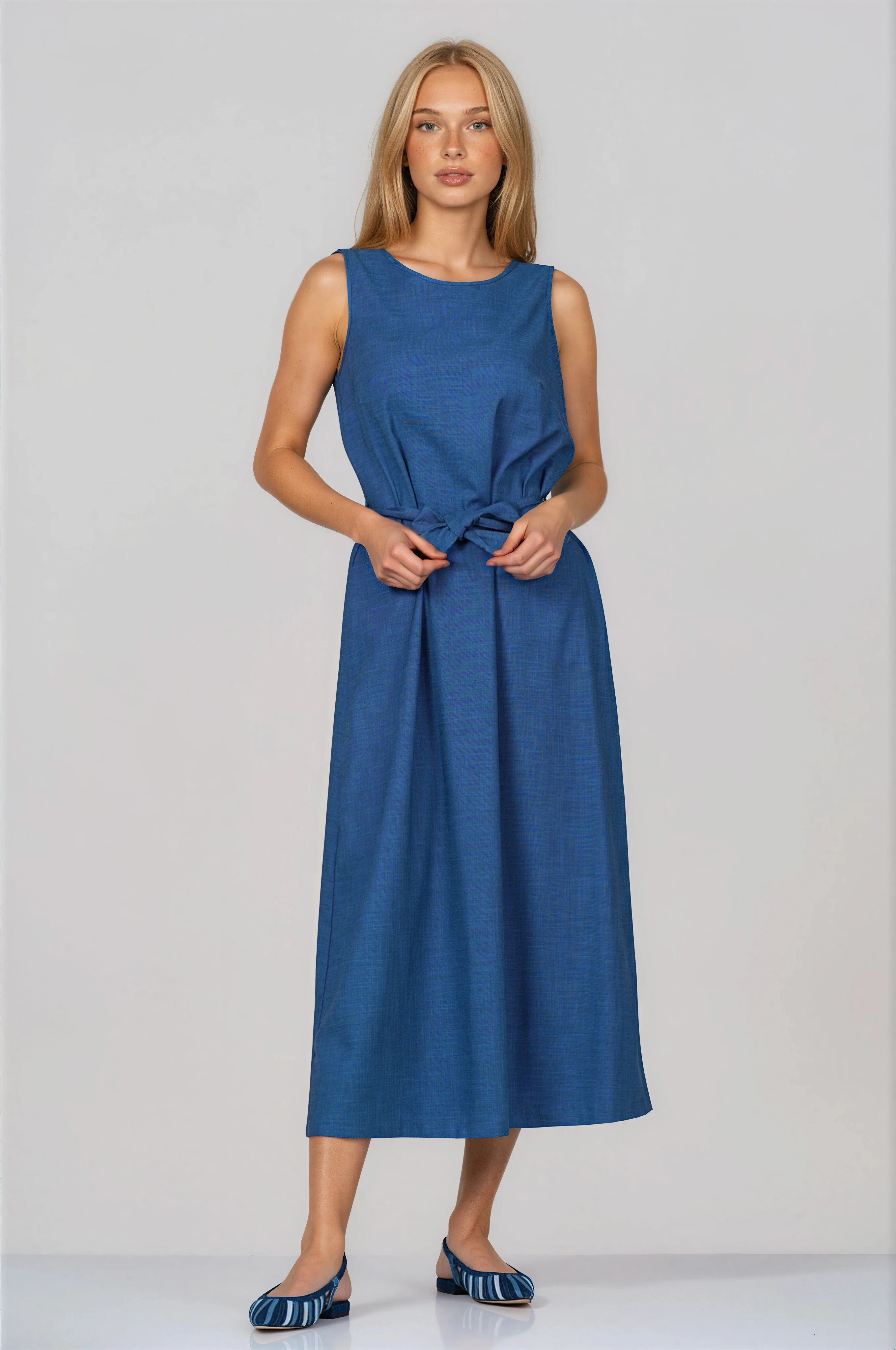 Дълга рокля от лен в синьо с връзка на гърба и колан
