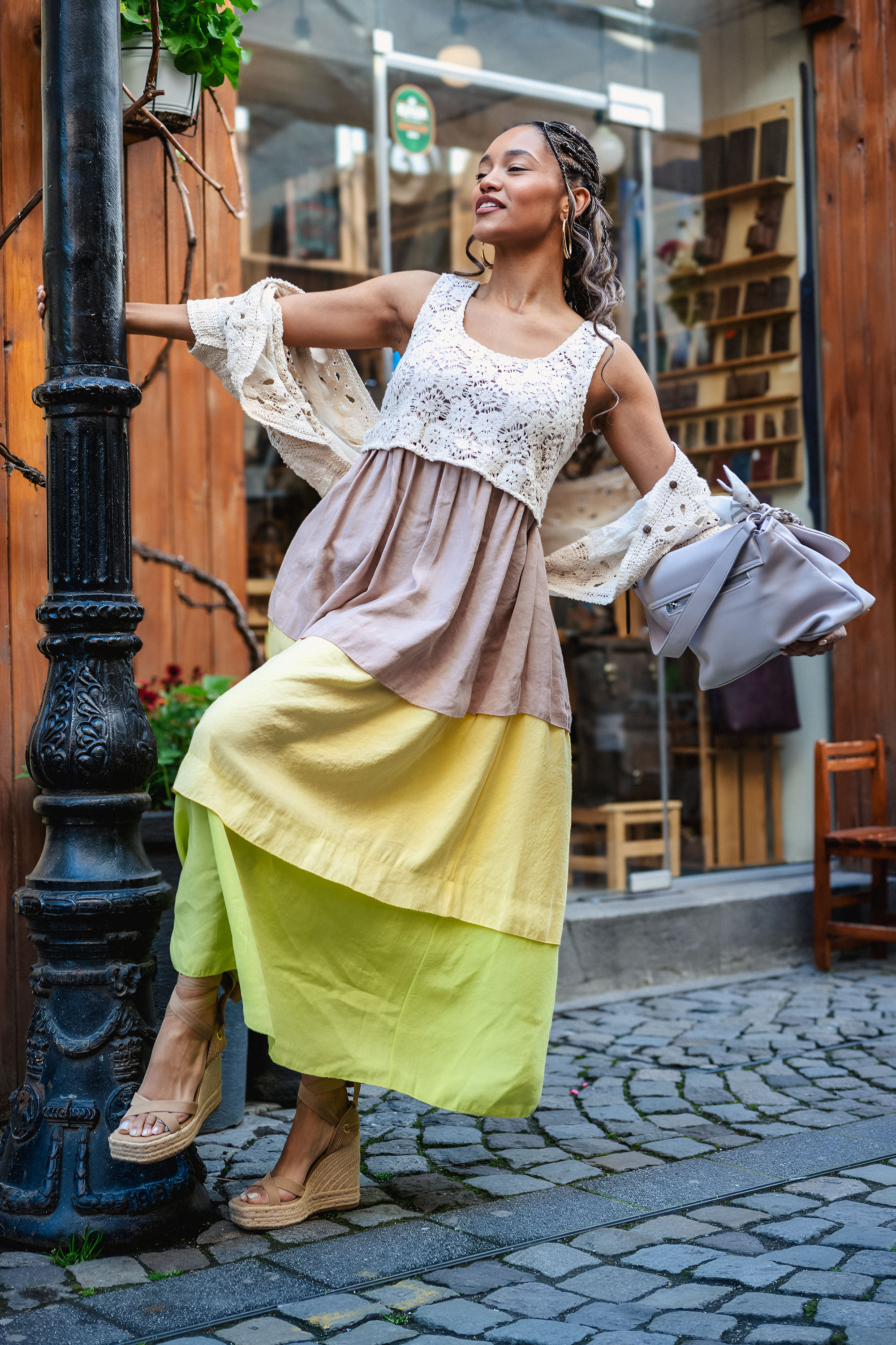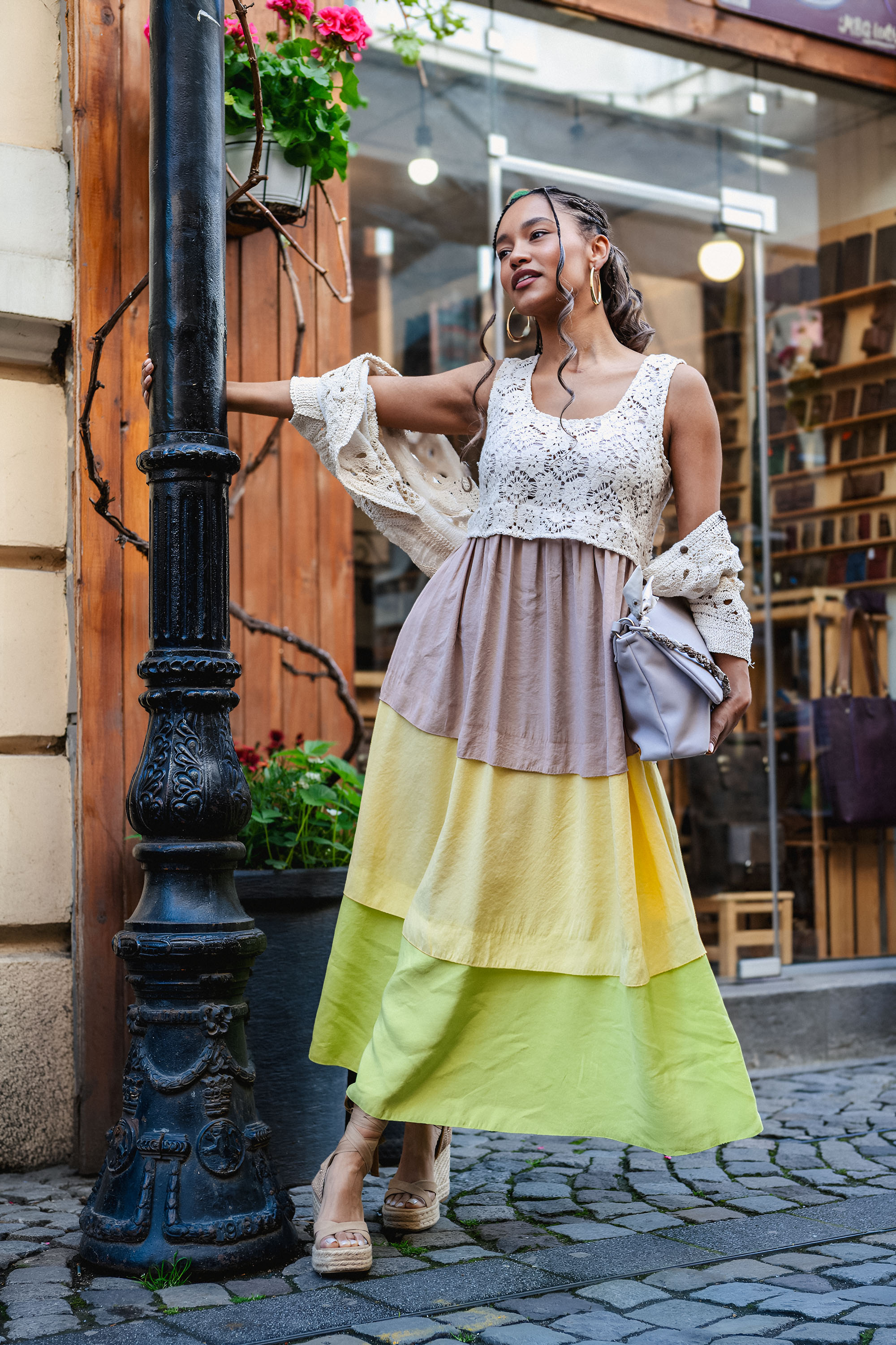 Дълга рокля, изработена от 100% тенсел – материя, известна със своята мекота и естествена проветривост. Горната част е с плетка тип бродерия и създава деликатен акцент, докато многослойната долна част в нюанси на бежово, жълто и зелено придава динамика и свежест. Свободната кройка осигурява комфорт и елегантно движение при всяка стъпка. Подходящ модел за топлите дни, съчетаващ стил и лекота.
