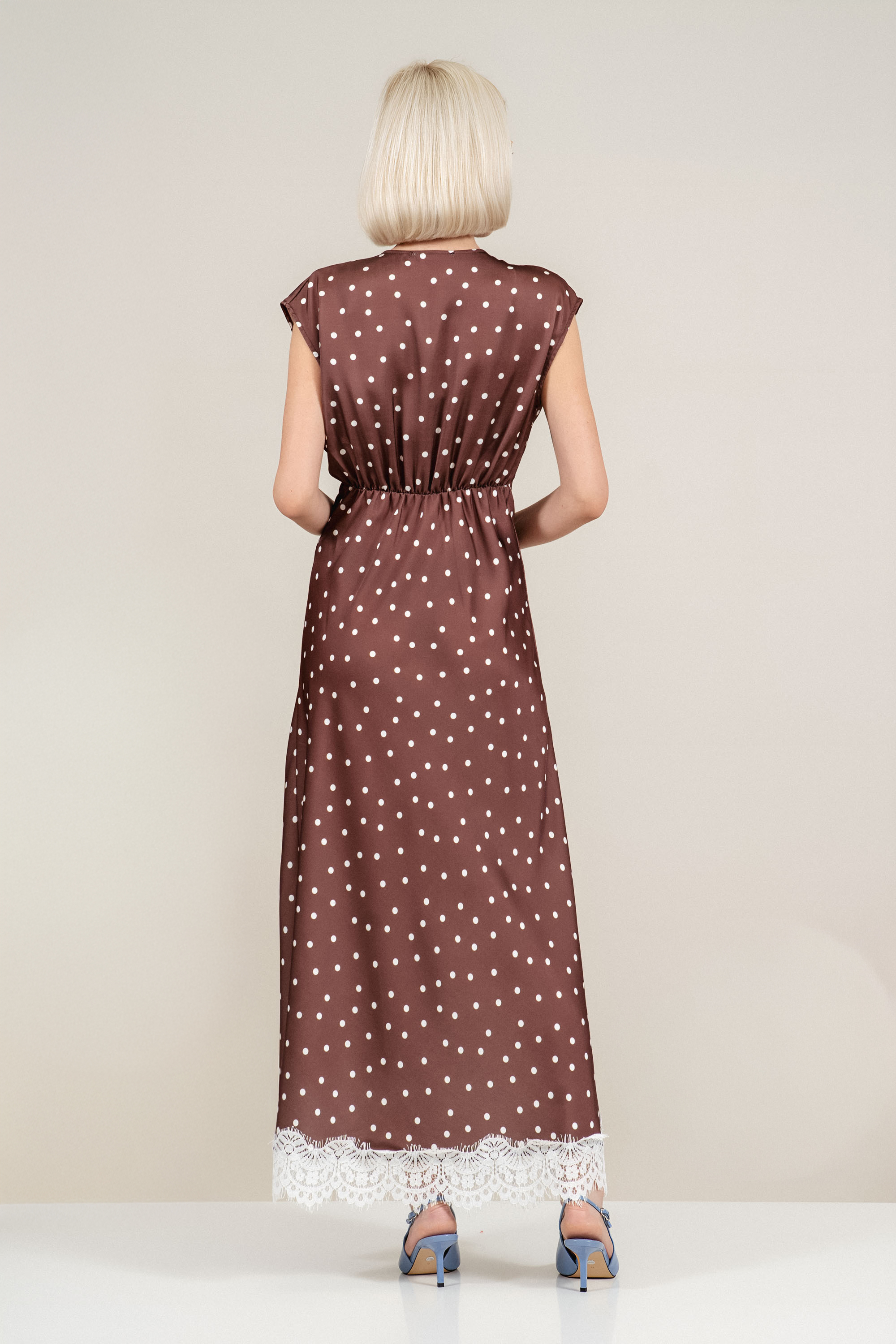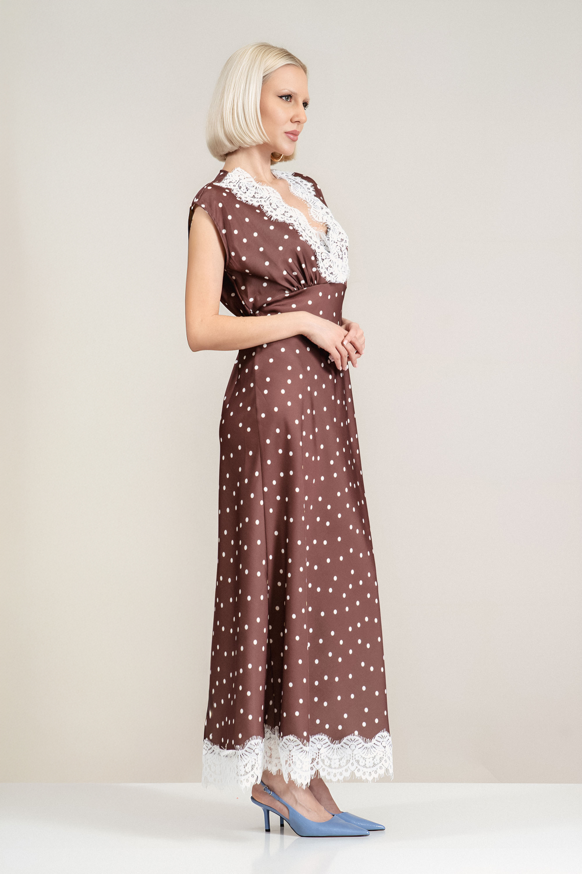 Дълга сатенирана рокля в кафяво с принт бели топки и дантела по деколтето