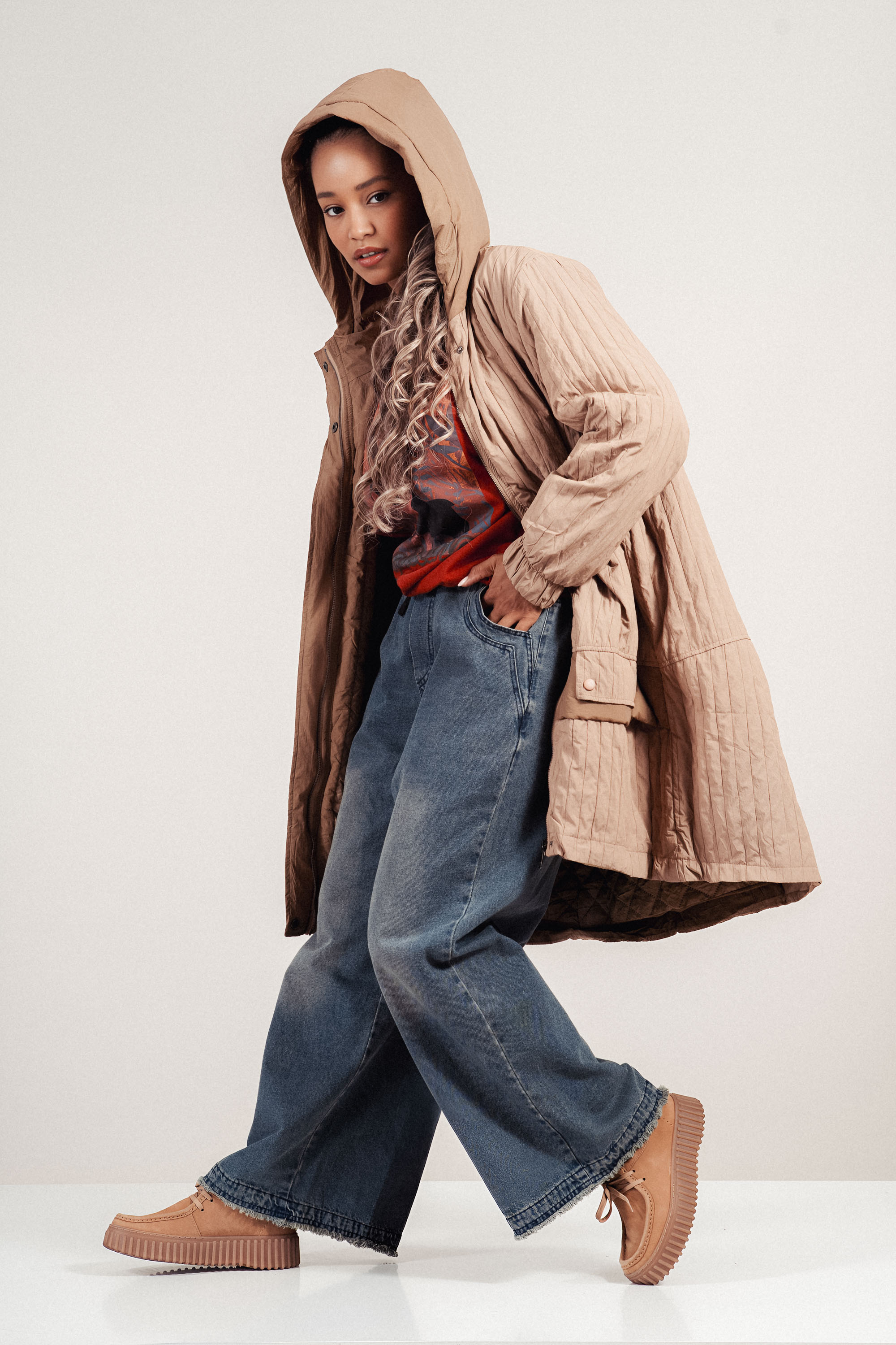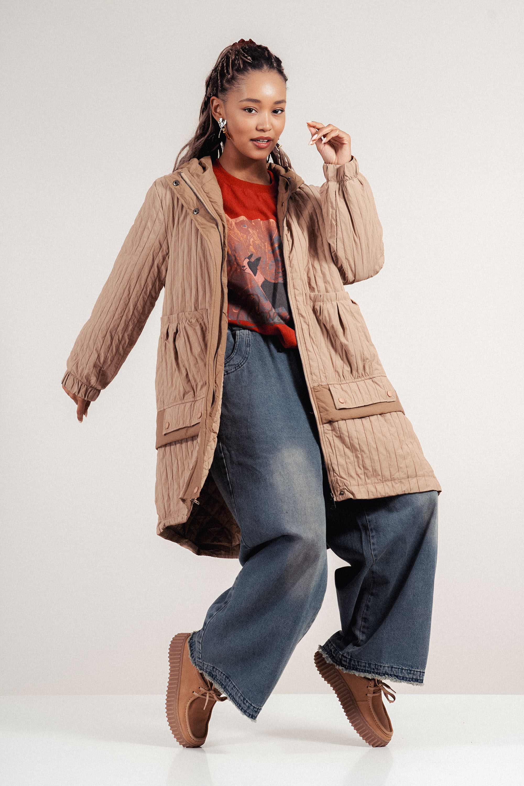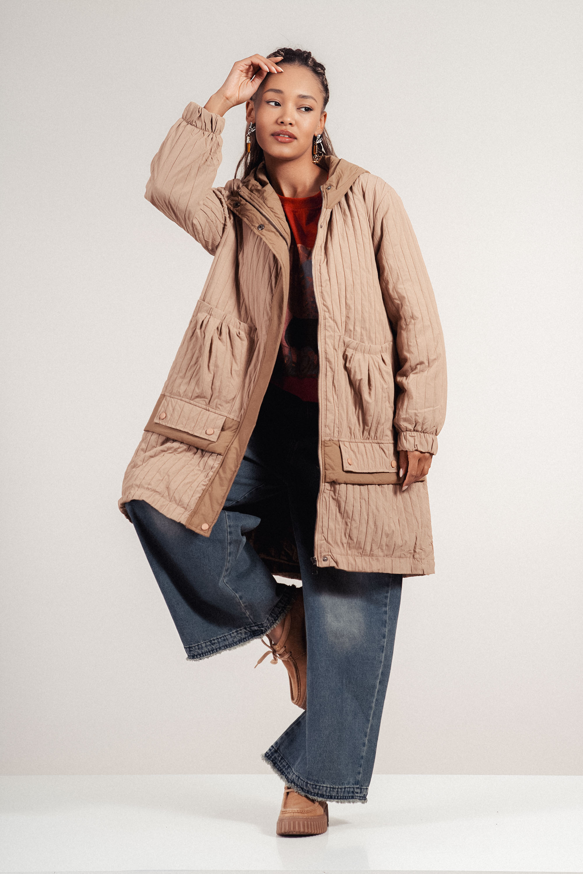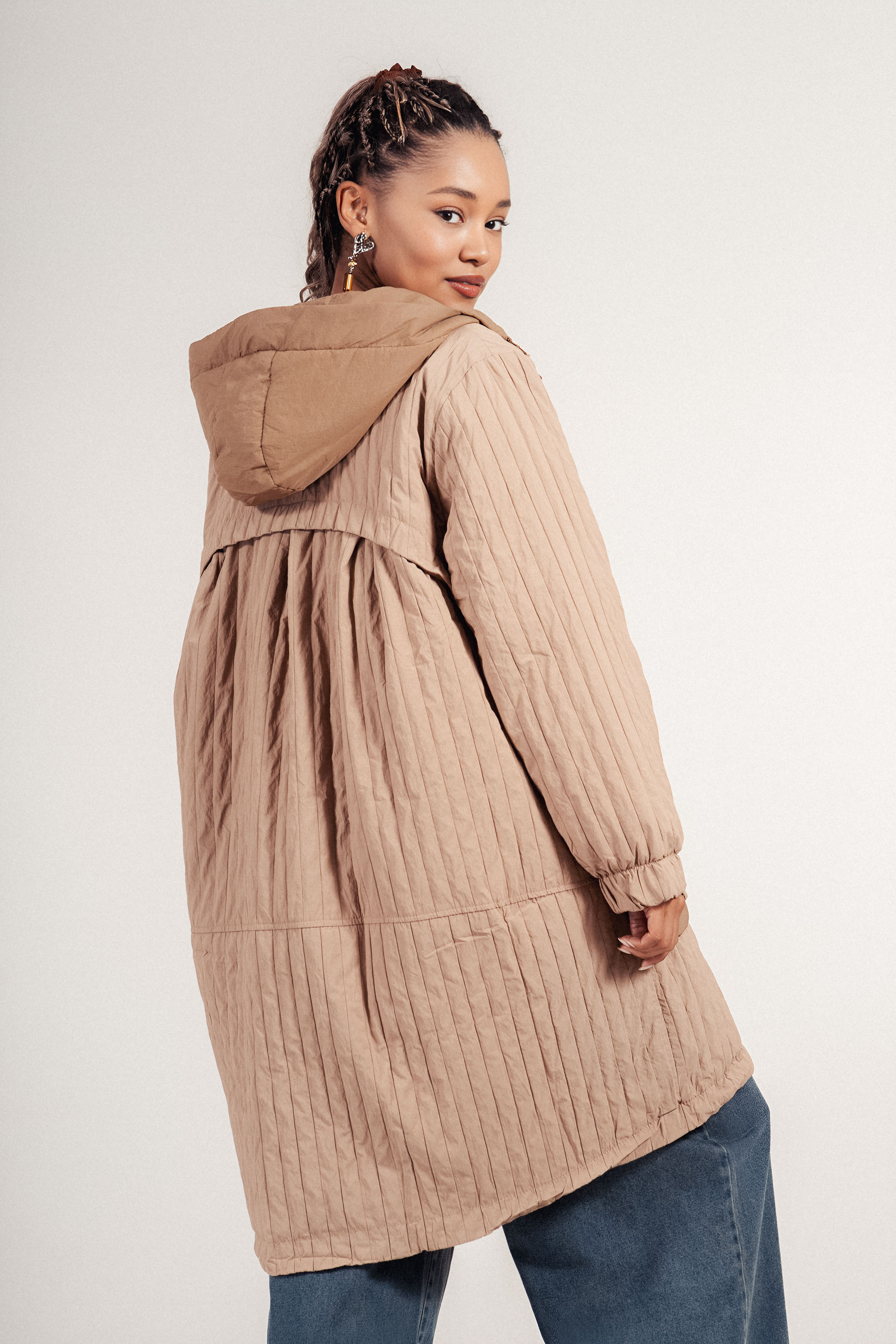 Дълго тънко яке в бежово с качулка и вертикални релефни елементи