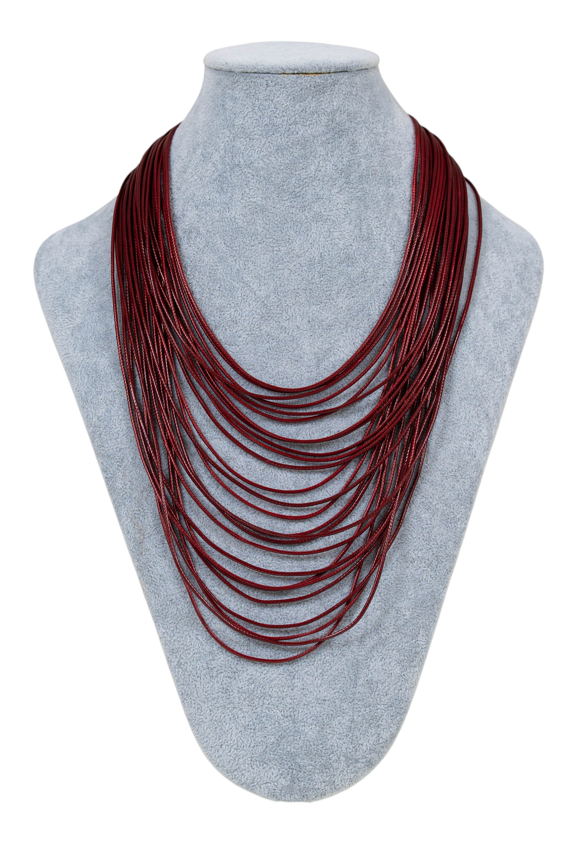 Модерно и атрактивно колие с интересен дизайн за смели и дръзки жени. Многопластов дизайн от еко кожа в цвят бордо и магнитно закопчаване. Може да бъде прекрасен подарък, с който да зарадвате любимата жена.