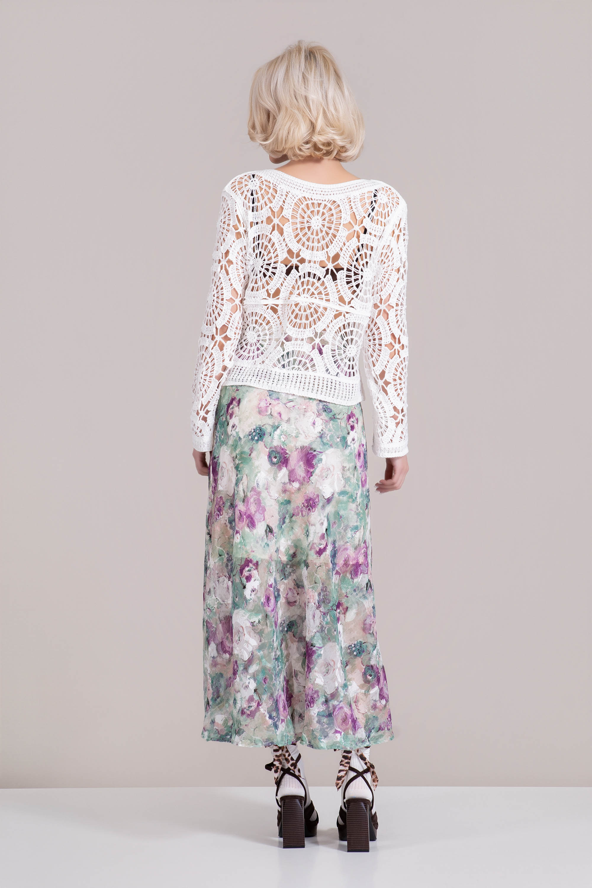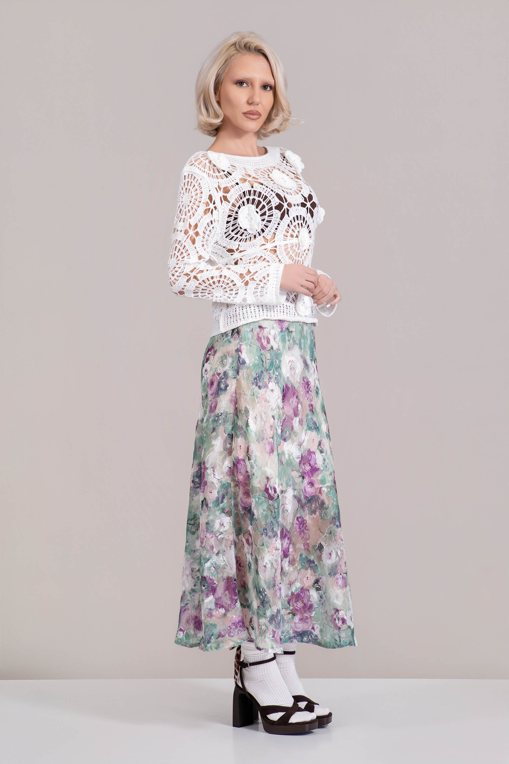 Средно-дълга пола с ефирна горна част и подплата с художествен акварелен принт в лилаво и зелено. Ефирната материя създава плавен силует, а ластичната талия гарантира комфорт и лесно комбиниране с различни топове. Подходяща за пролетно-летния сезон и стилни ежедневни визии.