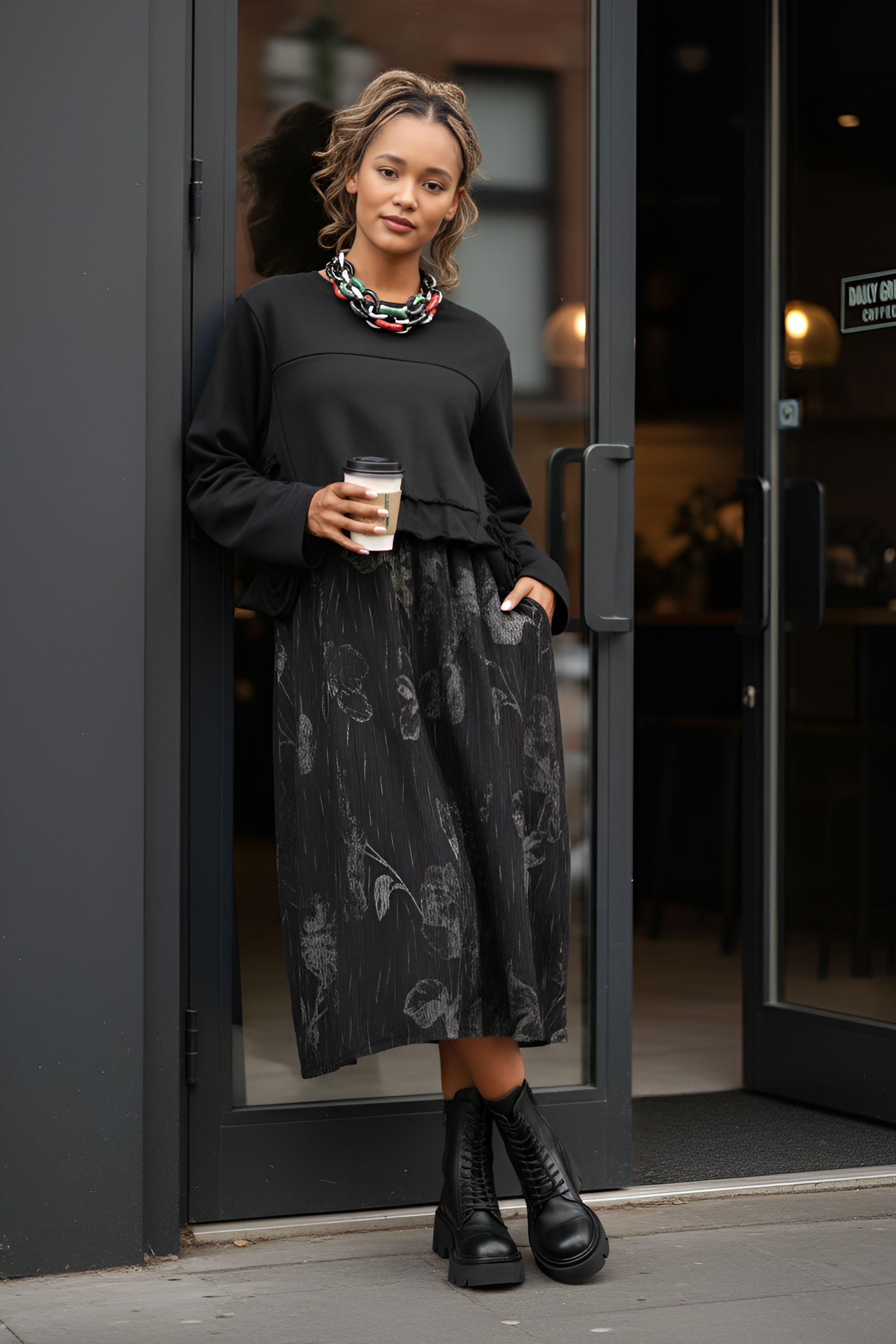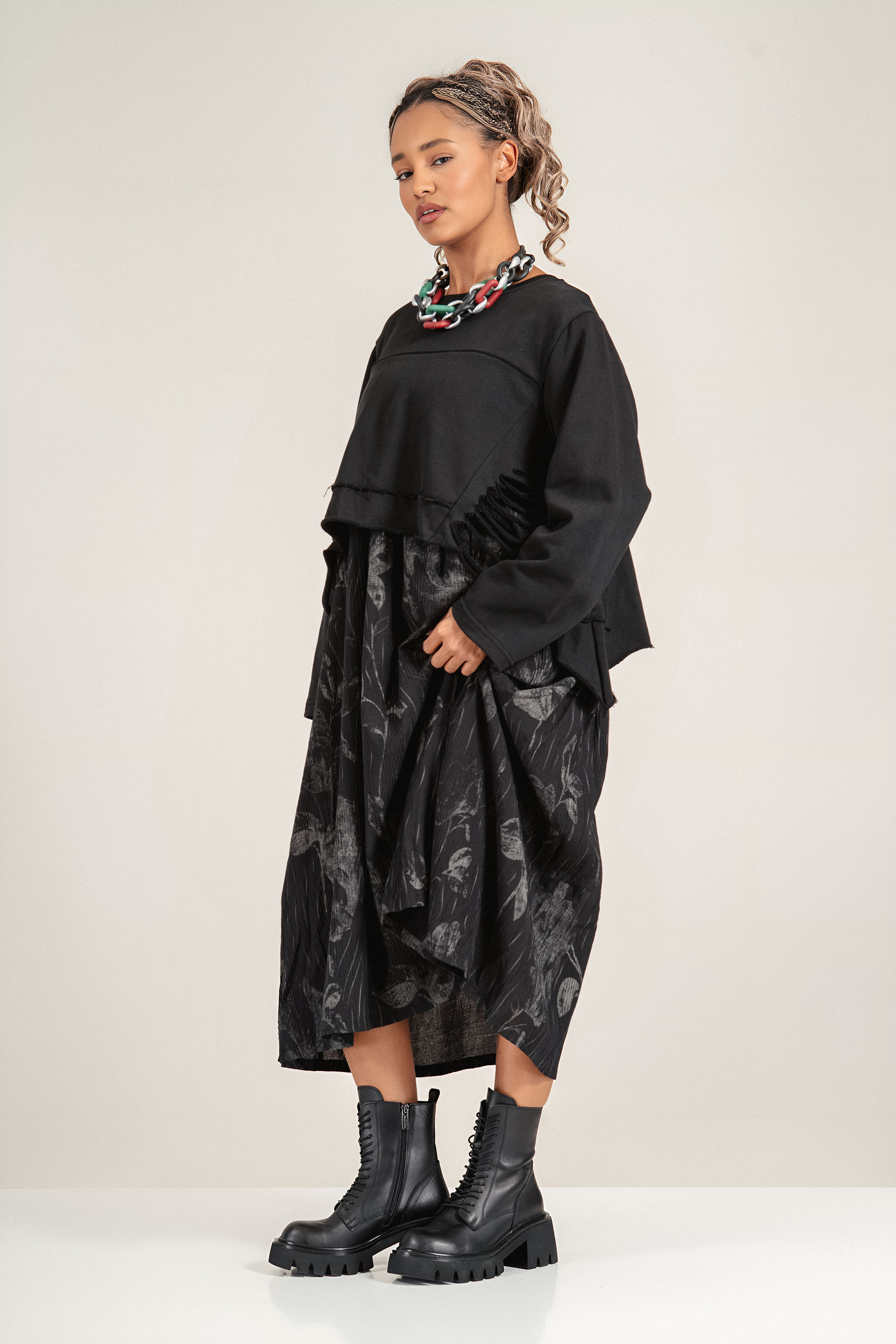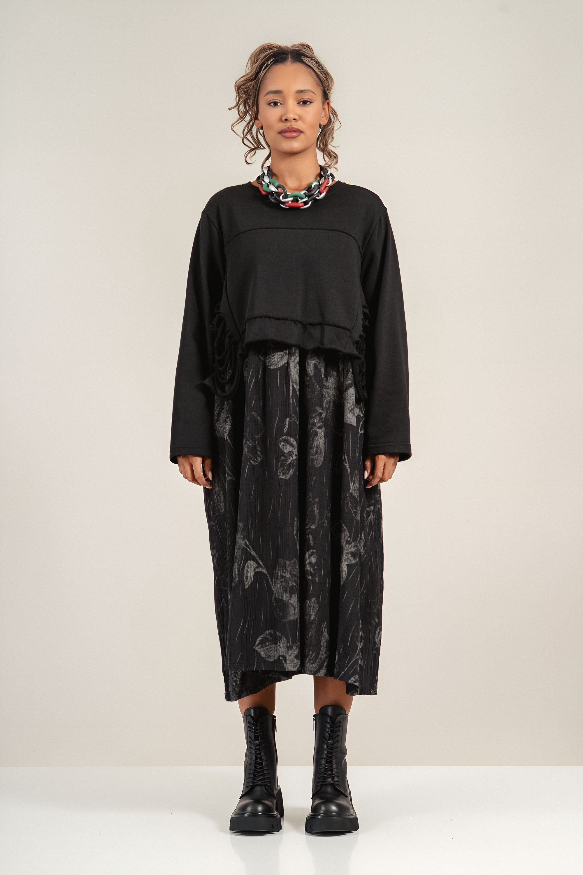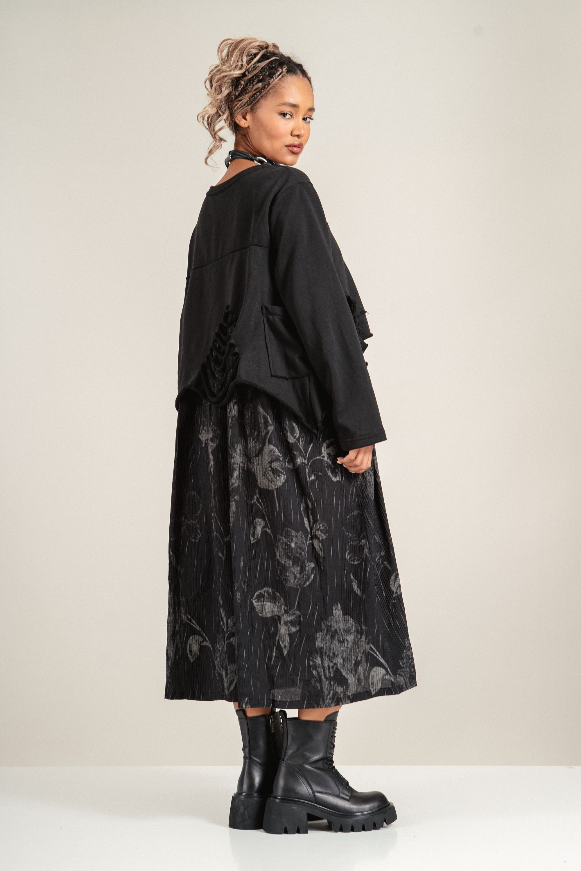 Екставагантна рокля от меко трико, която комбинира комфорт и стил. Горната част е с обло деколте и леко вталена линия, която подчертава силуета. Долната част е с флорален принт, който придава артистичен акцент. Подходяща за ежедневието или по-небрежни вечерни излизания.