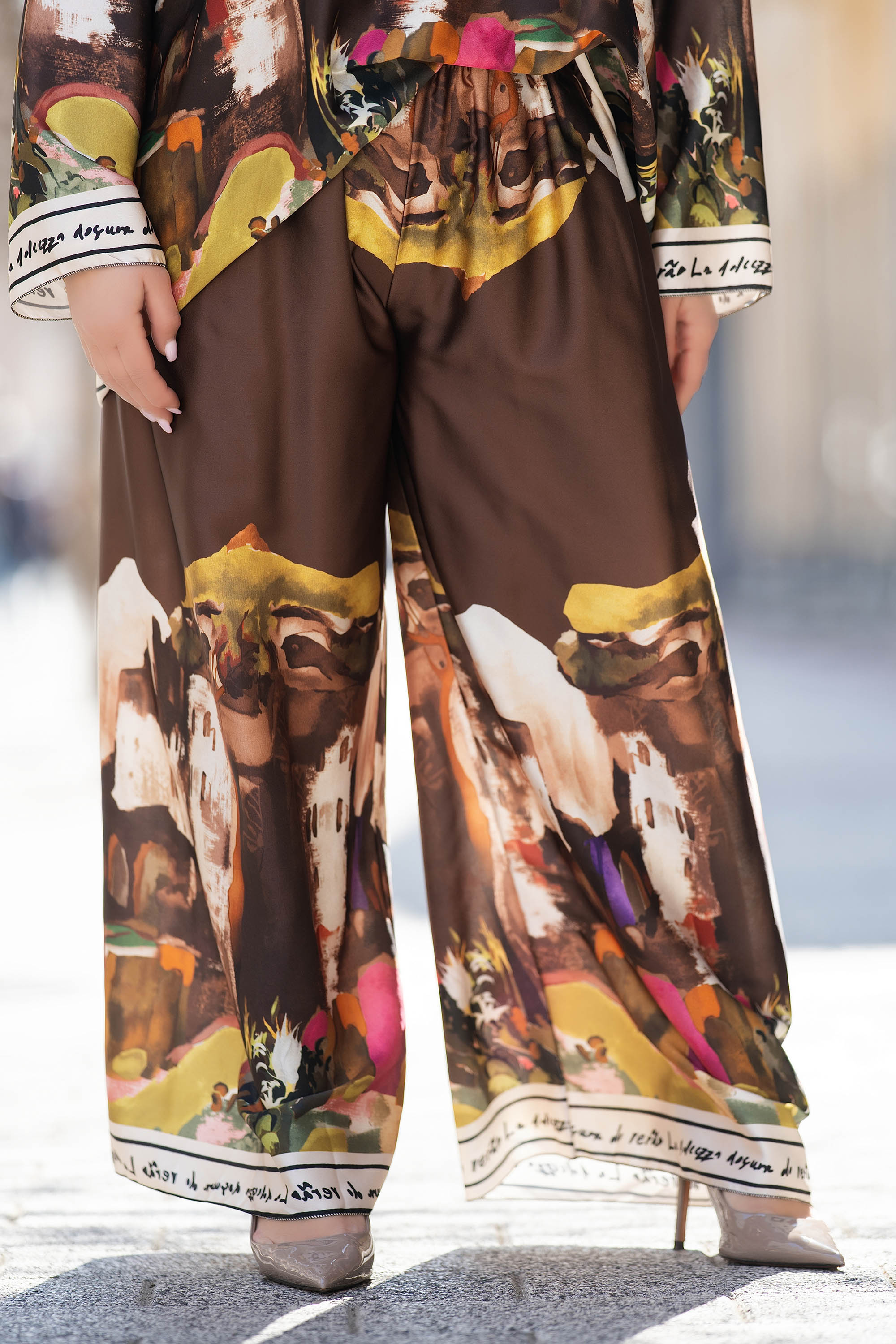 Макси сатениран комплект в кафяво с артистиччен принти свободна кройка