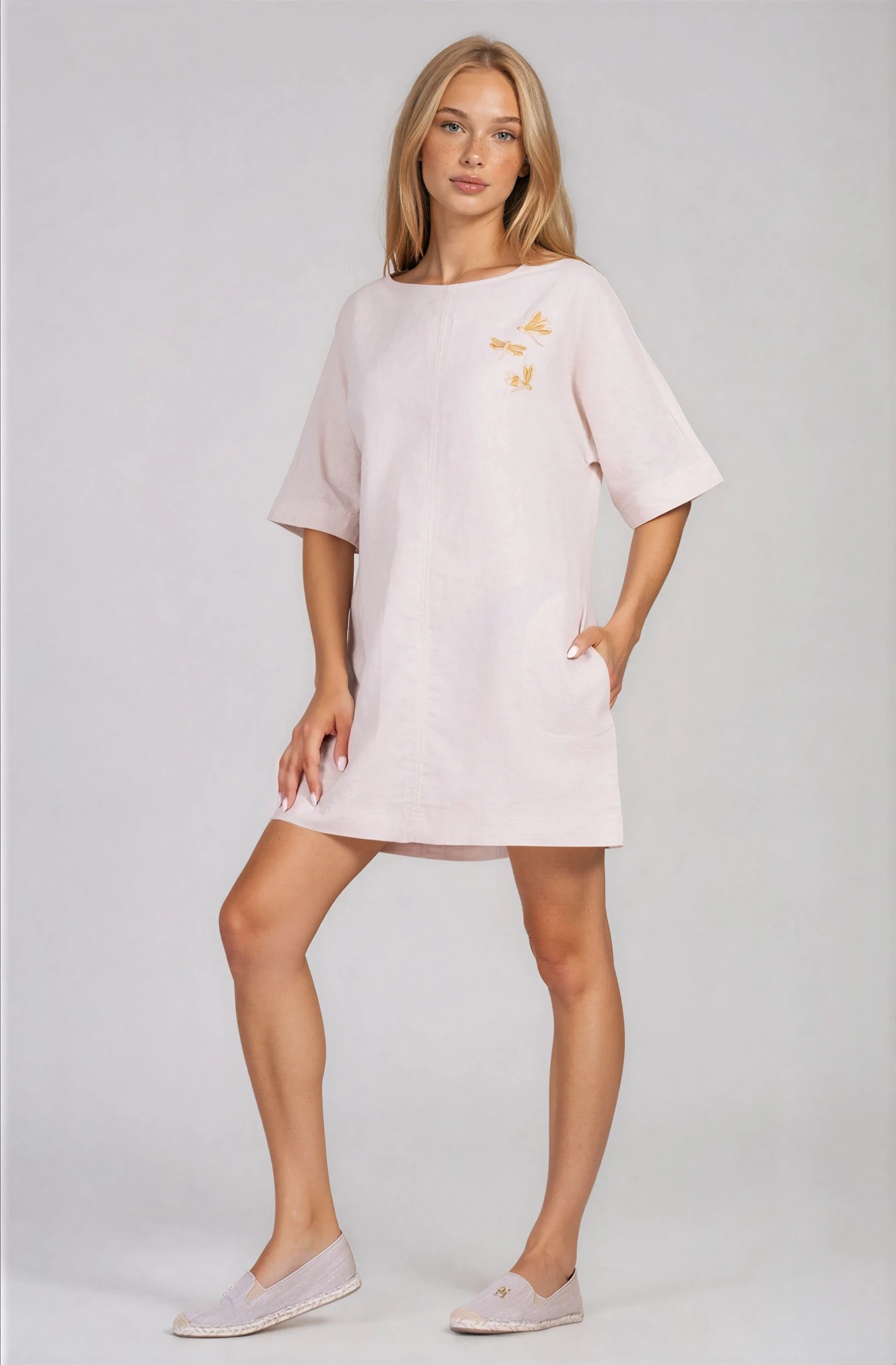 Рокля със съвременно излъчване от естествена материя и изчистеният силует. Непринуден чар на този модел от колекция ''Dragonfly'' подчертава фигурата, а фините бродирани водни кончета създават артистично излъчване. Роклята е с къси ръкави и удобни джобове. Подходяща както за градска разходка, така и за неформални събития в летните месеци. Тази рокля е от серията ''Устойчива мода" , произведен специално за "GANG" с внимание към всеки детайл.