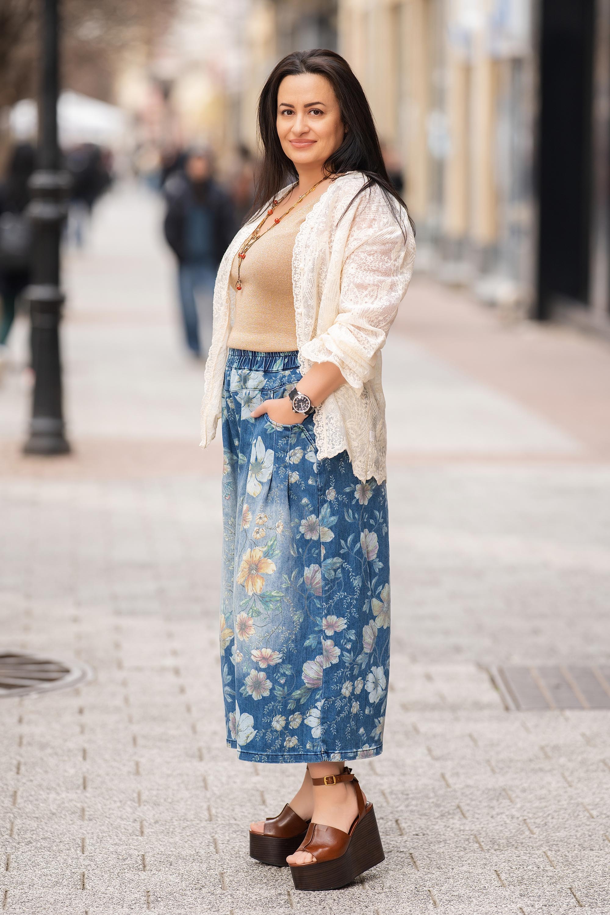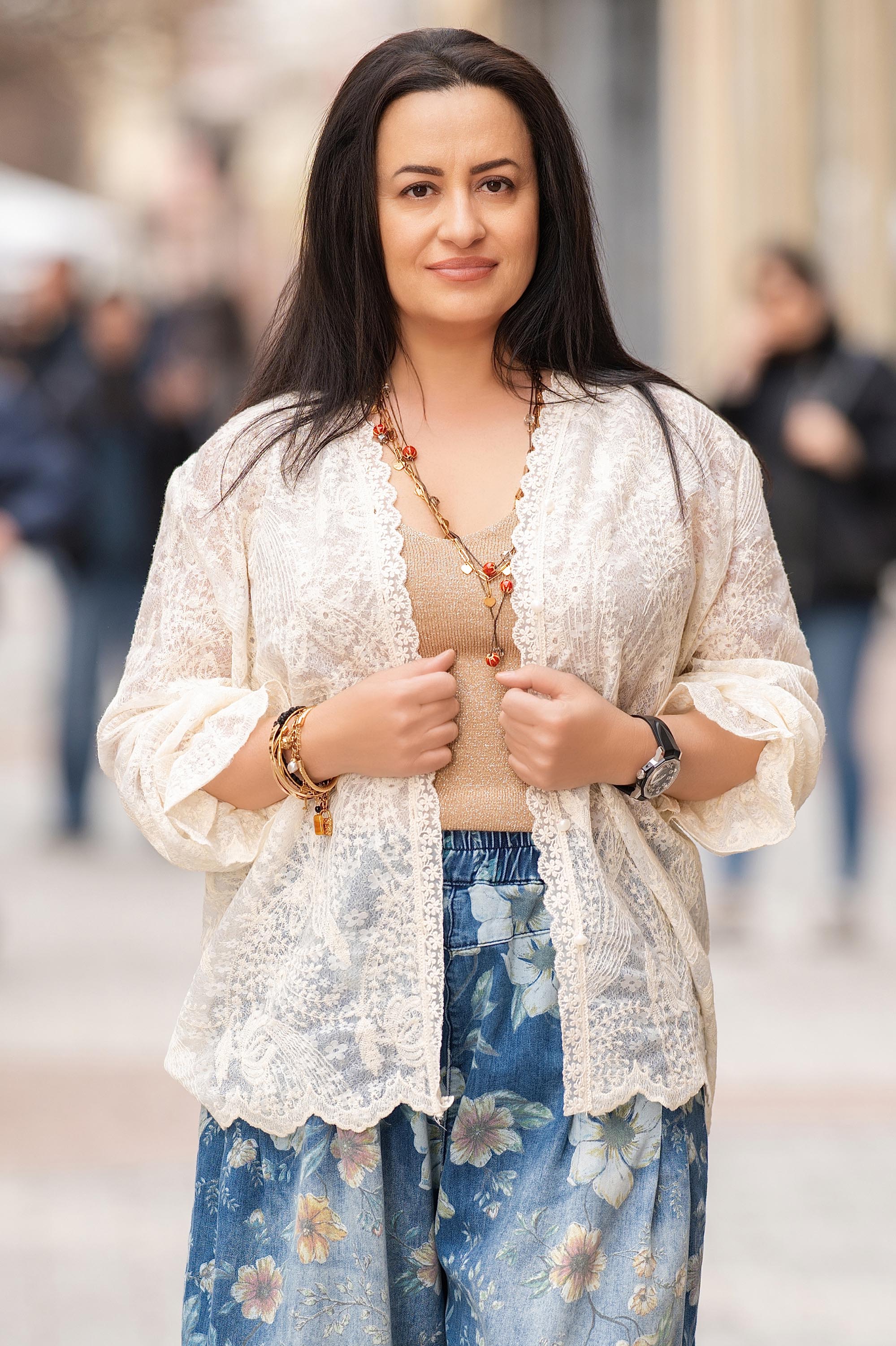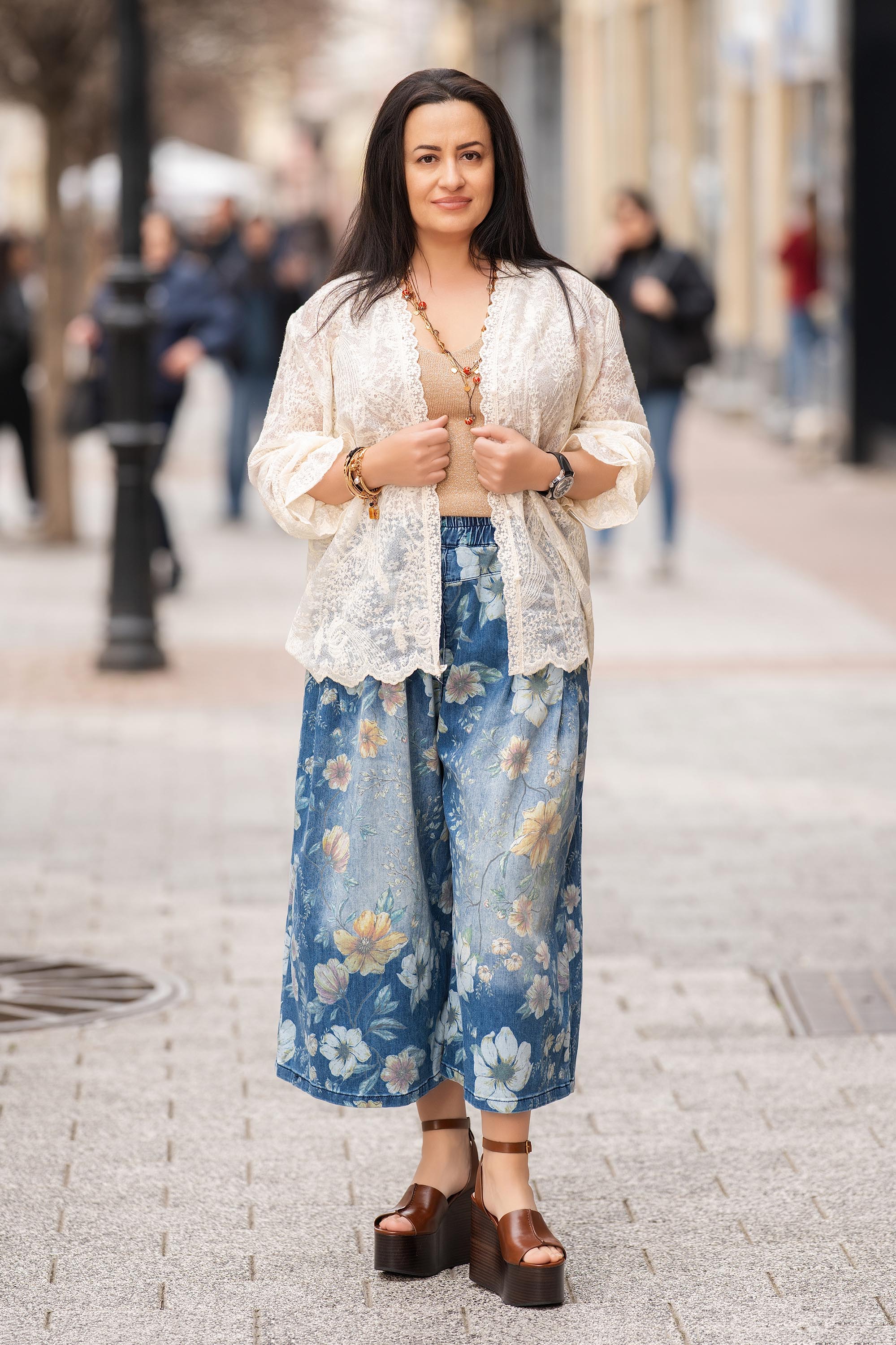 Елегантен модел с деликатно романтично излъчване. Леката материя е приятна на допир и подходяща за преходни сезони и по-топли дни. Правата линия стои балансирано върху фигурата, а острата яка добавя изчистен силует. Фината дантела и бродерията на цветя придават женствен акцент и отличават визията. Подходящ избор за наслояване върху топ или рокля.