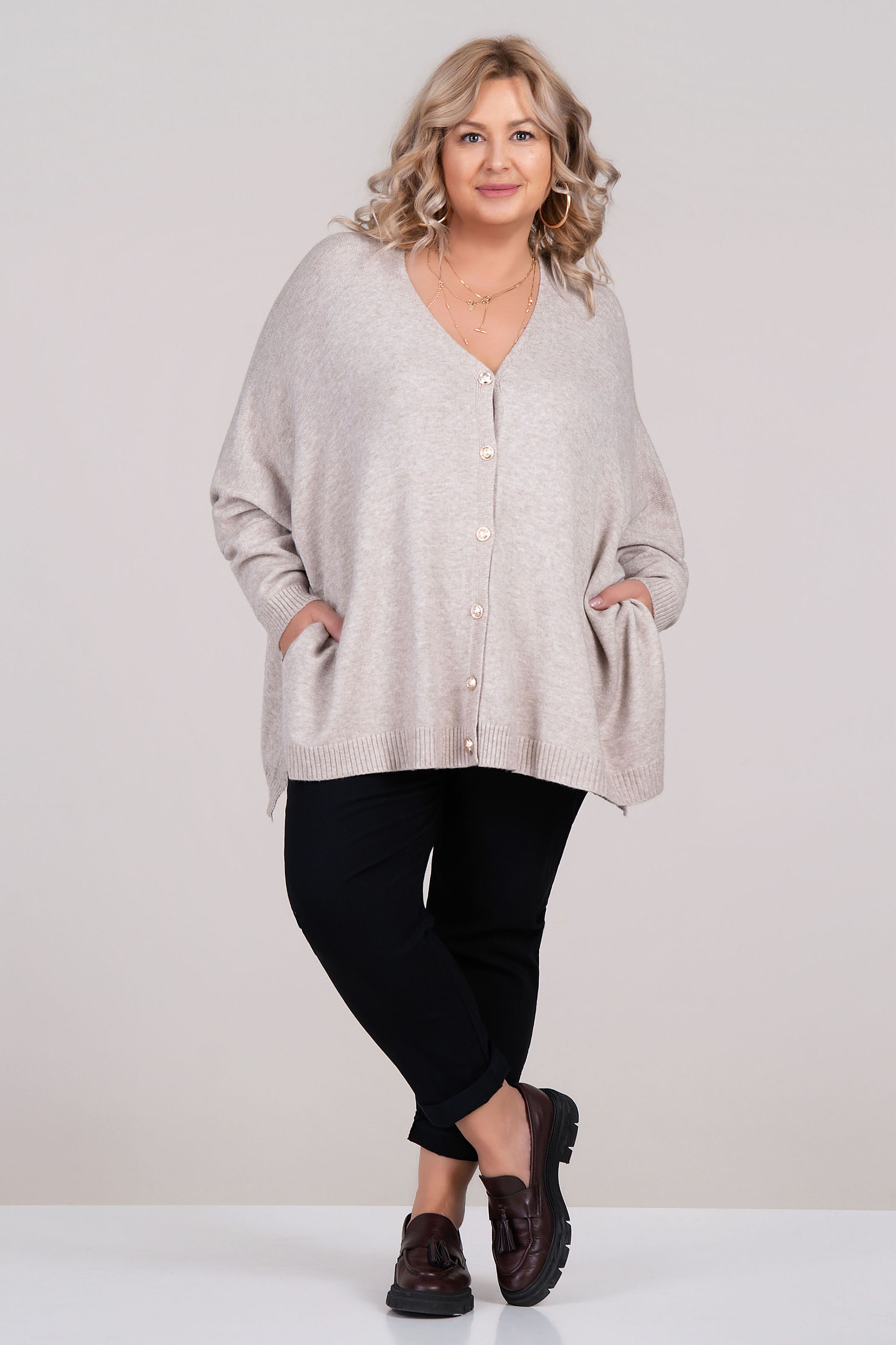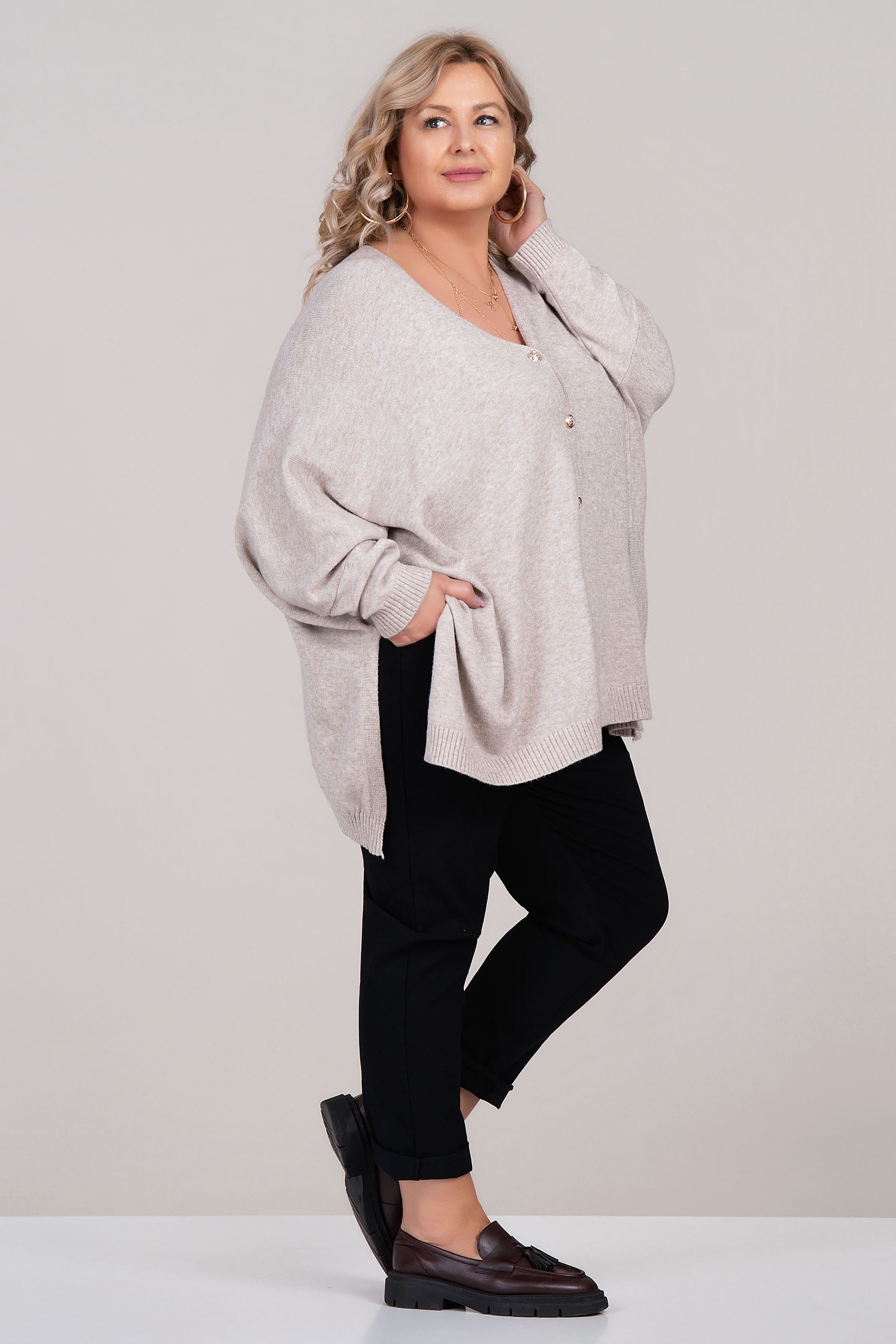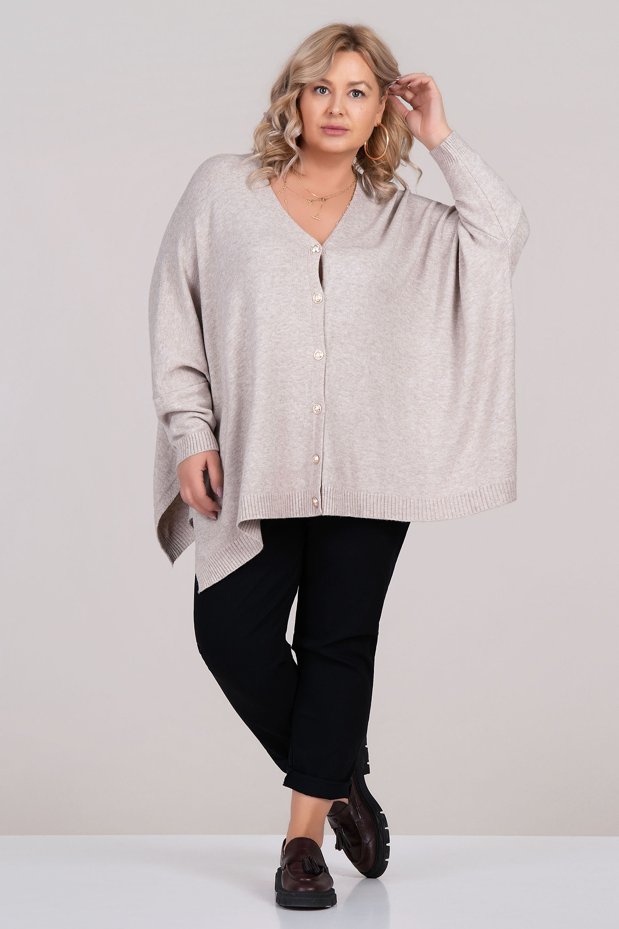 Свежа и стилна – тази макси жилетка в бежов нюанс съчетава комфортна дължина и модерен асиметричен силует. Златистите копчета добавят акцент, а меката плетена материя е идеална за есенните дни. Чудесна за наслояване върху ризи или тениски.