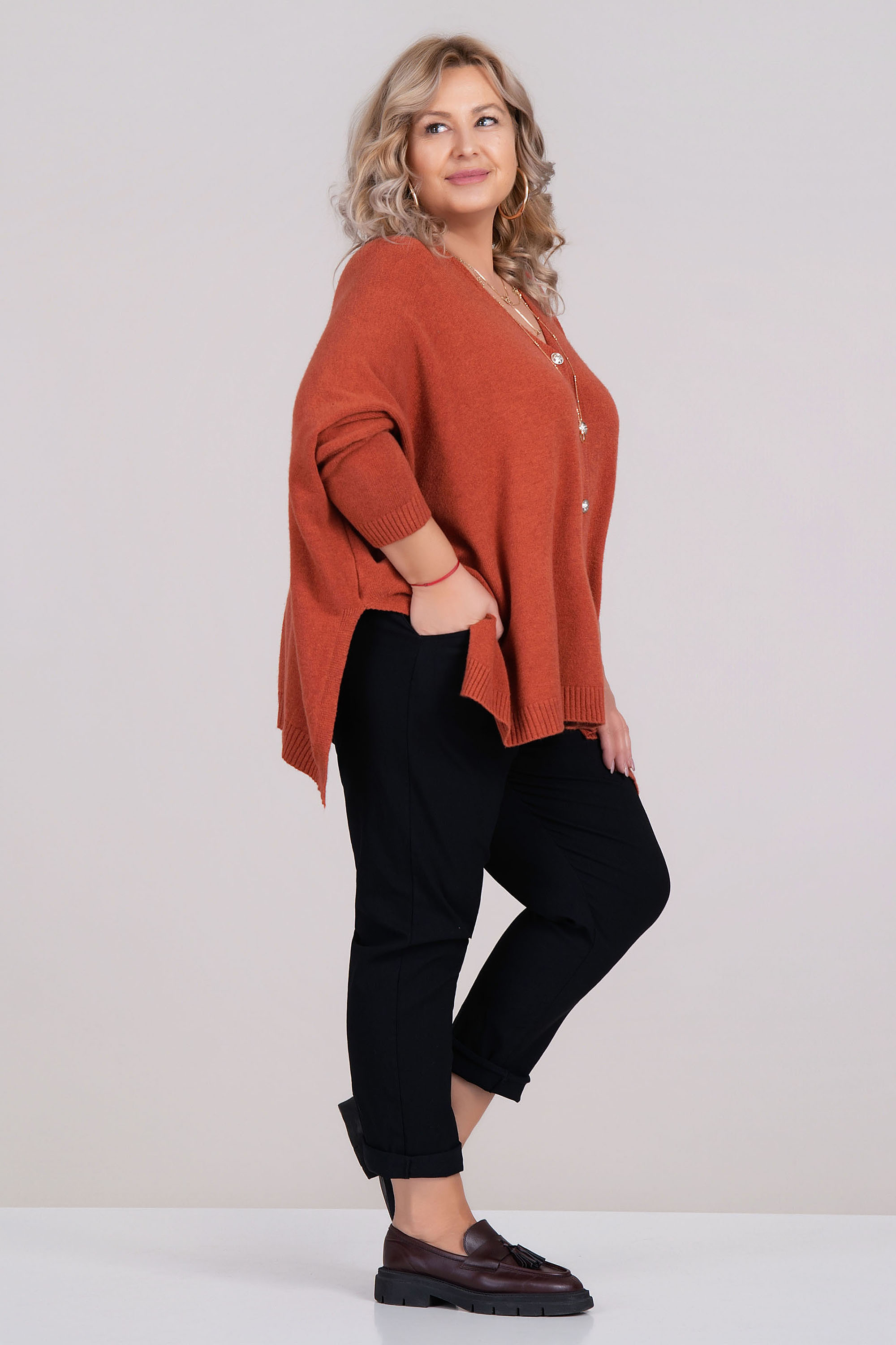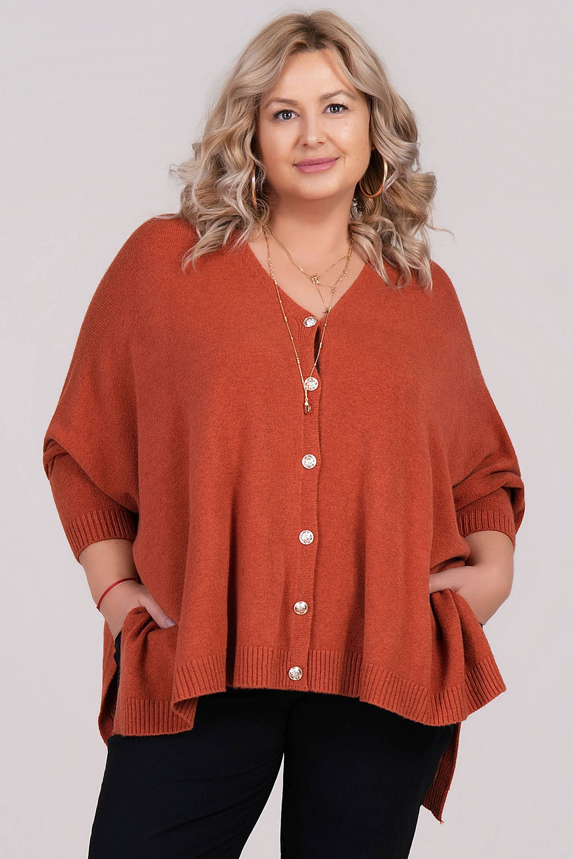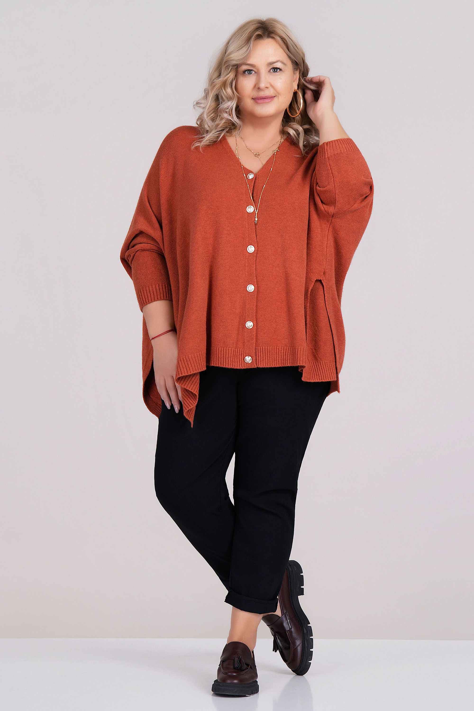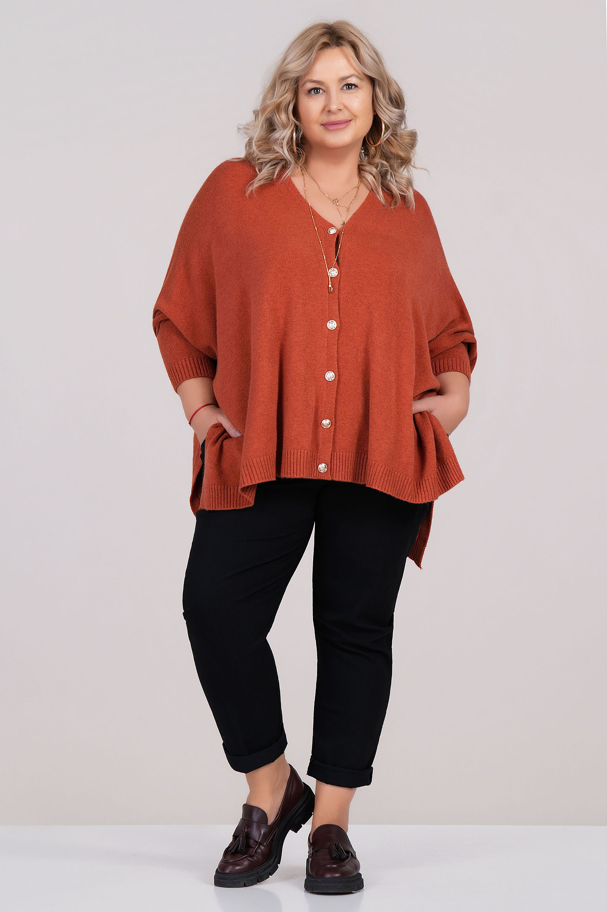 Свежа и стилна – тази макси жилетка в топъл оранжев нюанс съчетава комфортна дължина и модерен асиметричен силует. Златистите копчета добавят акцент, а меката плетена материя е идеална за есенните дни. Чудесна за наслояване върху ризи или тениски.