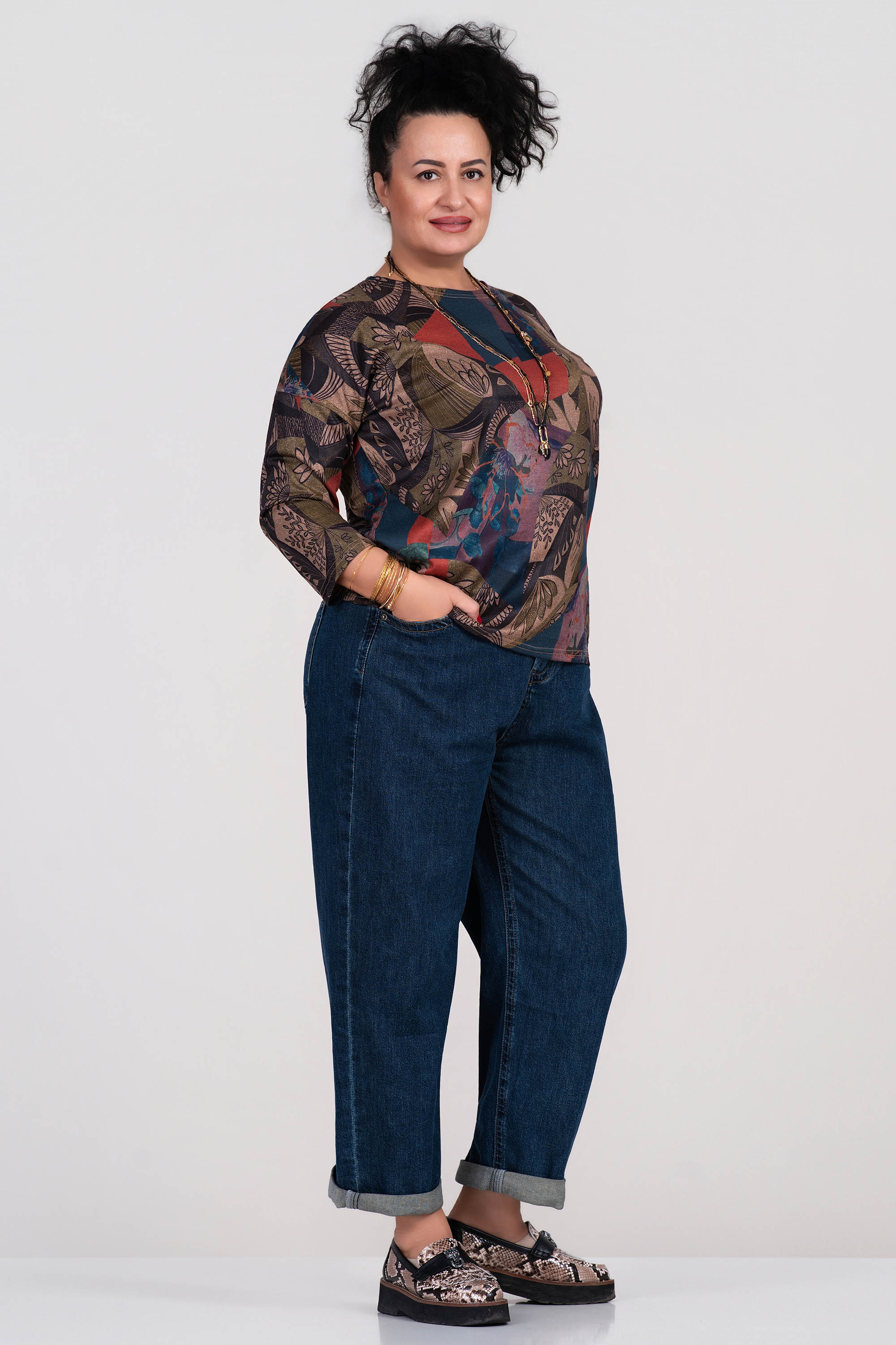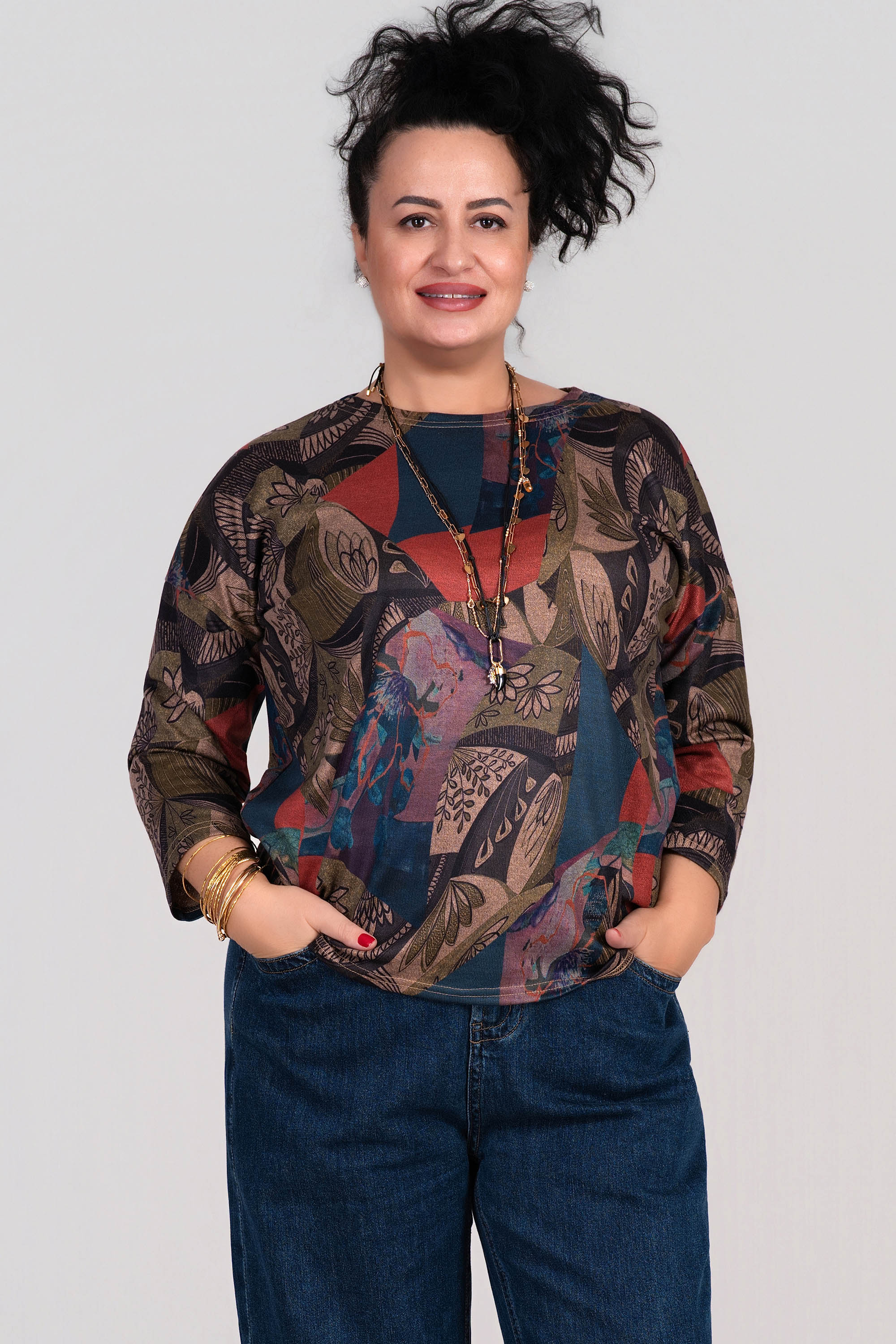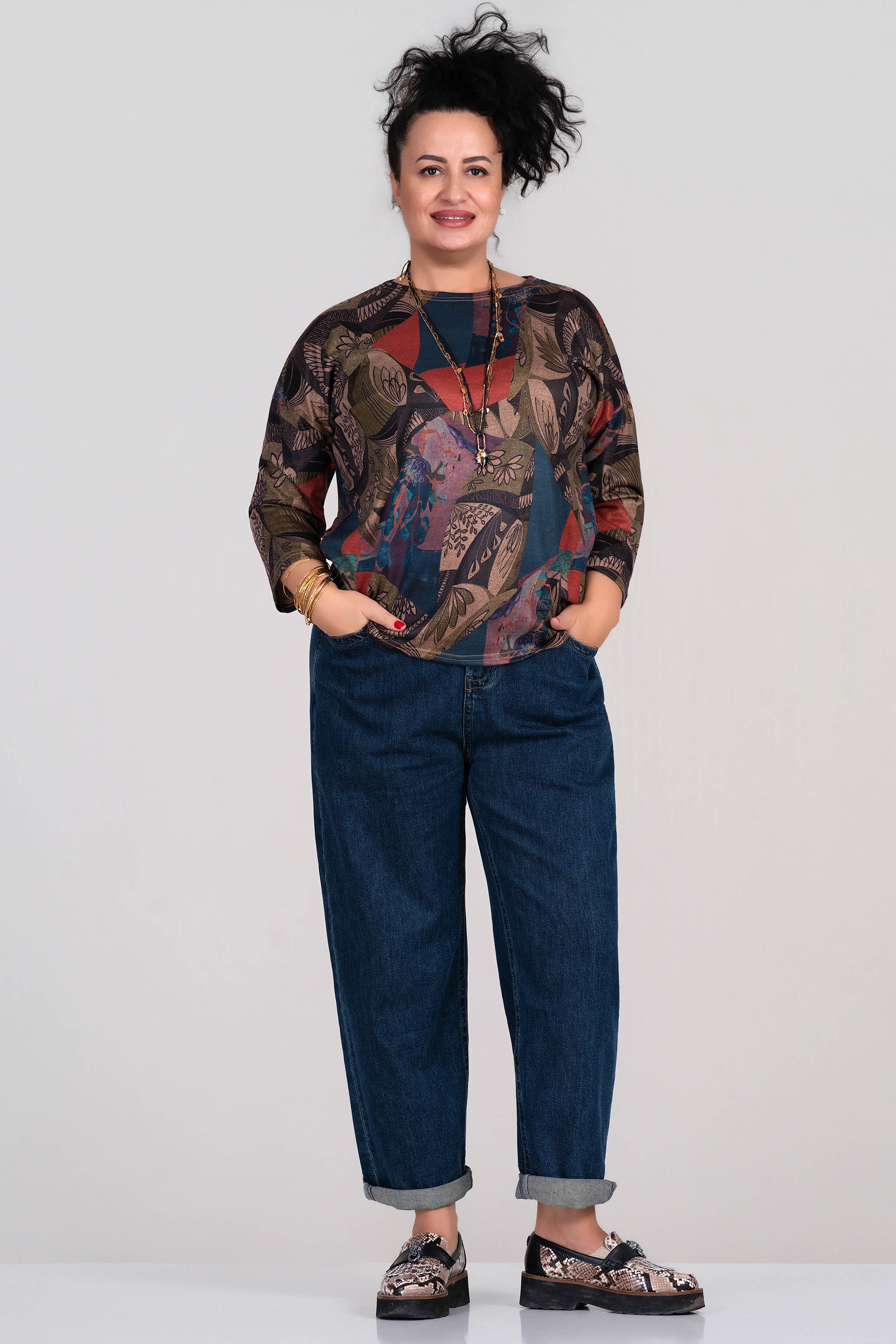 Макси блуза с изразителен десен в наситени цветове и артистичен стил. Моделът е с удобна свободна кройка, обло деколте и ръкав 3/4 – подходящ за сезонен преход. Материята е еластична и лека, създаваща усещане за комфорт през целия ден. Идеален избор за ежедневно облекло с индивидуално излъчване.