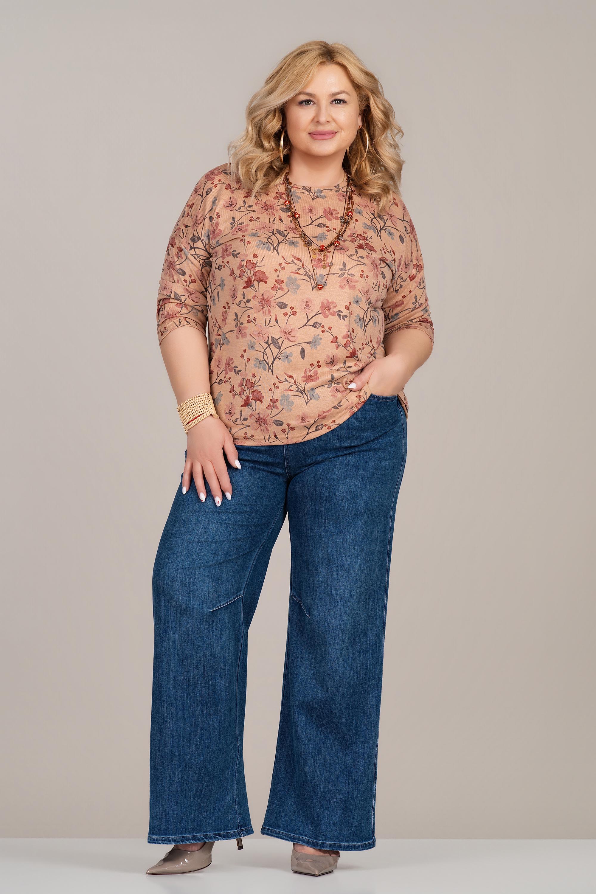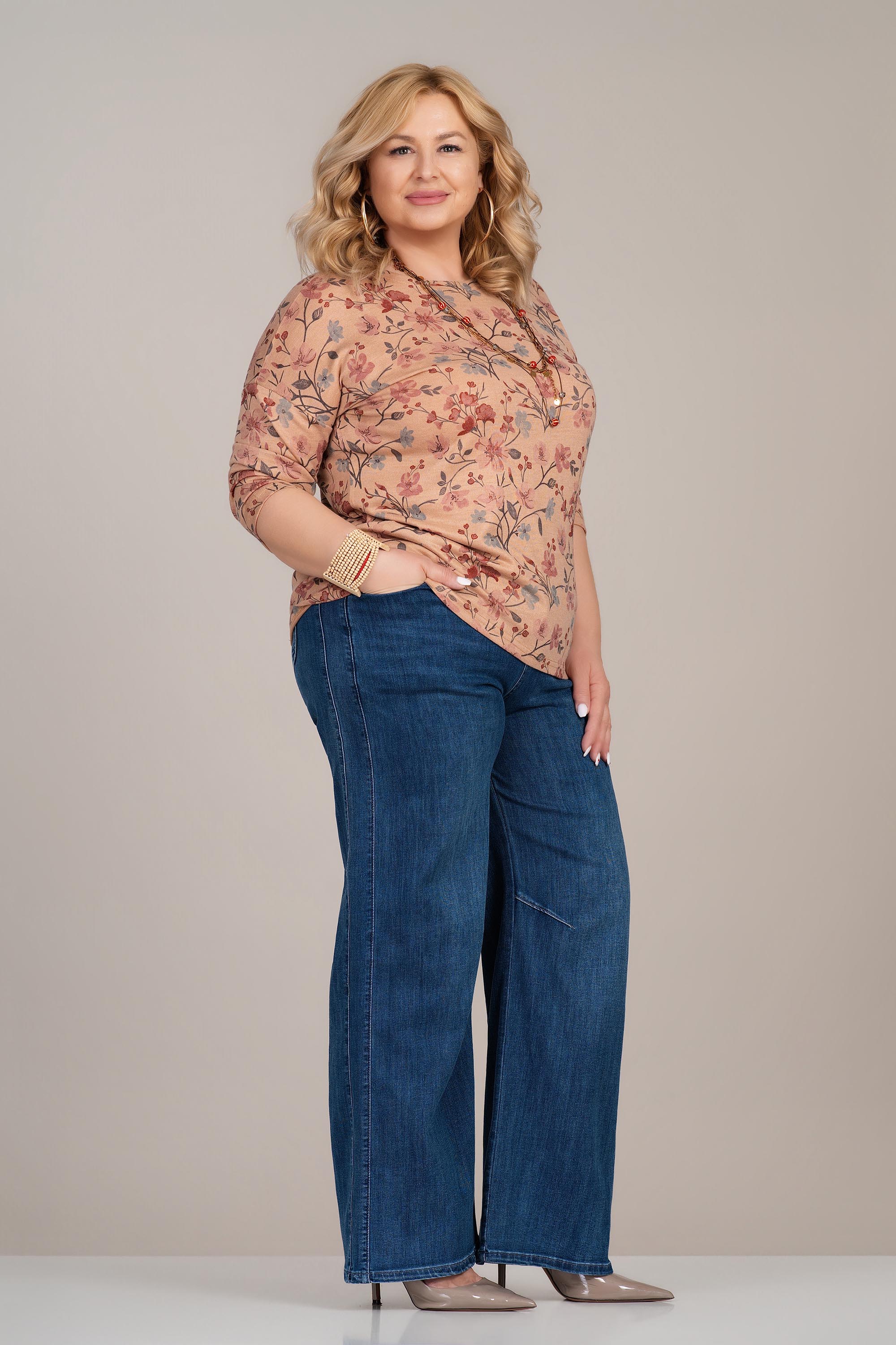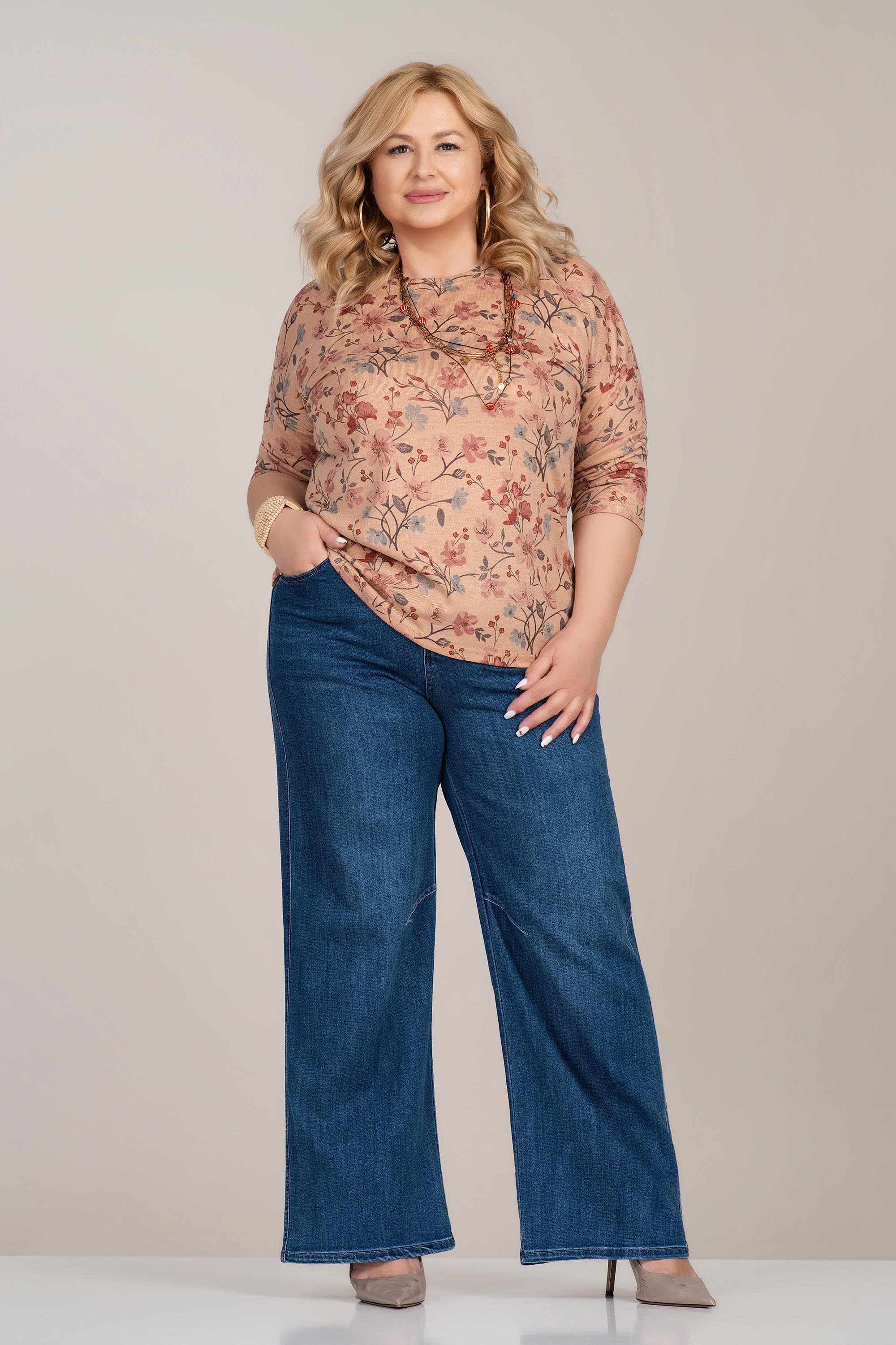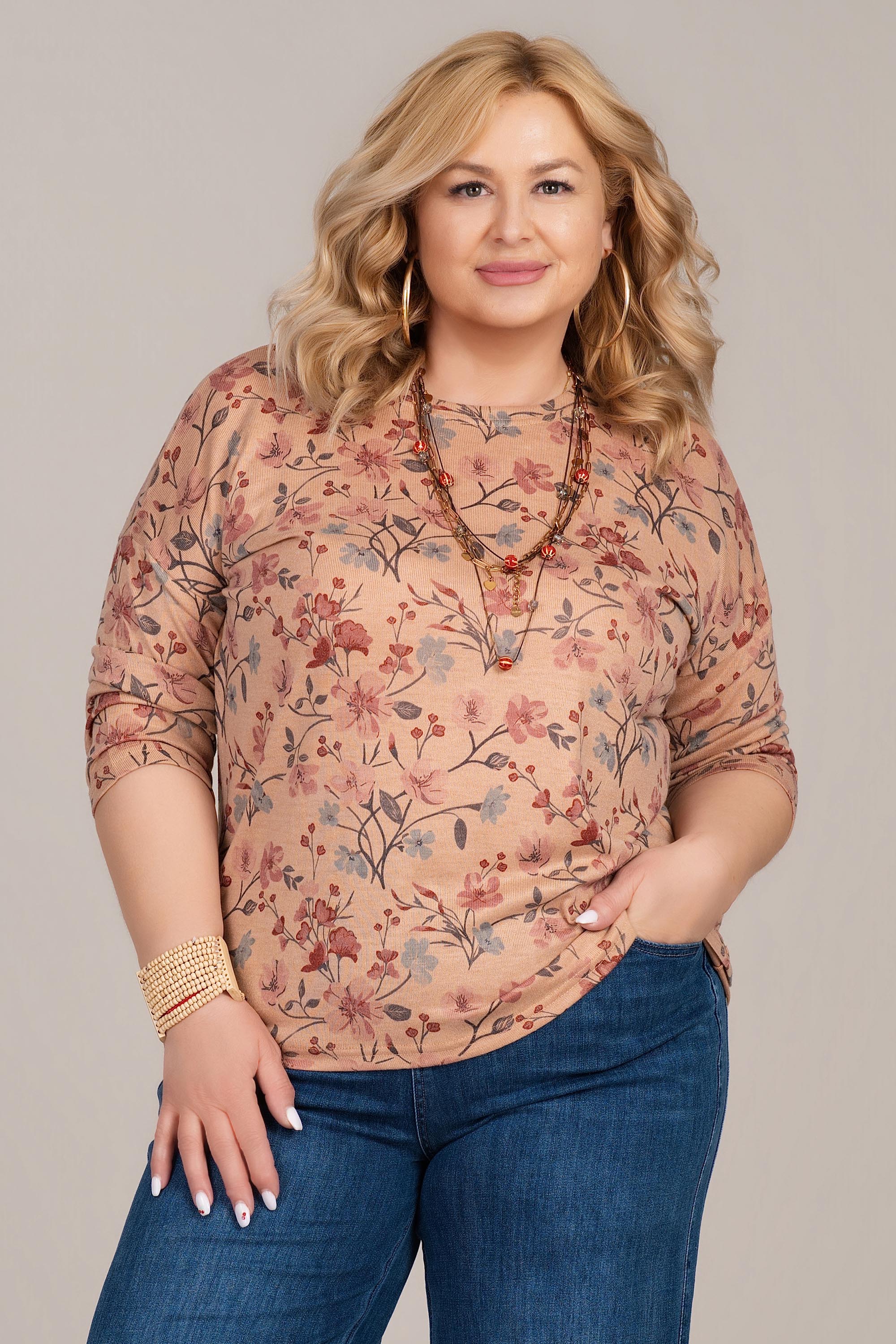 Лека макси блуза с женствено излъчване и отличен комфорт. Фината плетена материя е мека и еластична, което осигурява свобода на движение и приятно усещане през целия ден. Флоралният принт в топли тонове придава свежест и стил, а 3/4 ръкавът я прави практичен избор за различни сезони. Моделът е подходящ както за ежедневие, така и за по-елегантни комбинации.