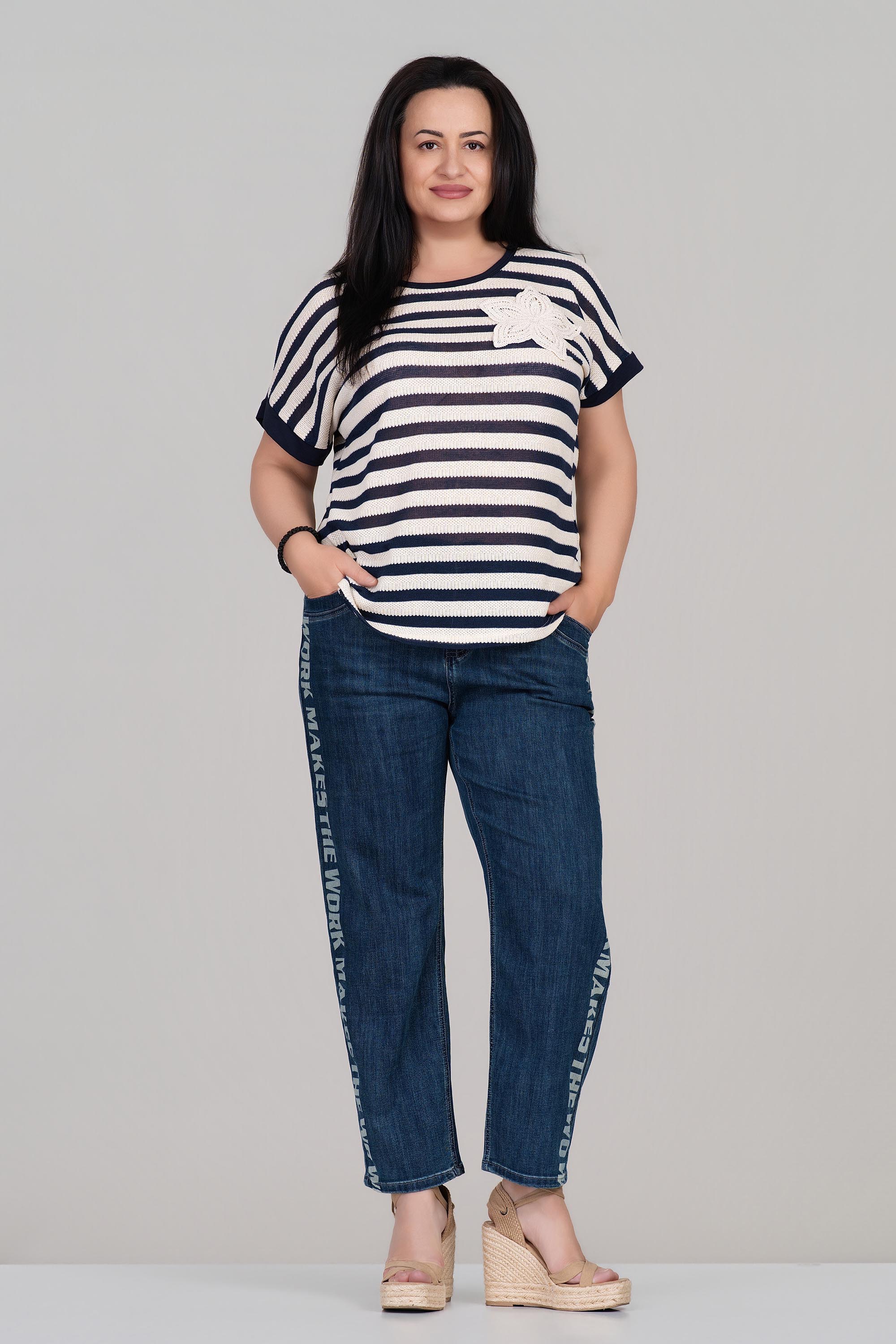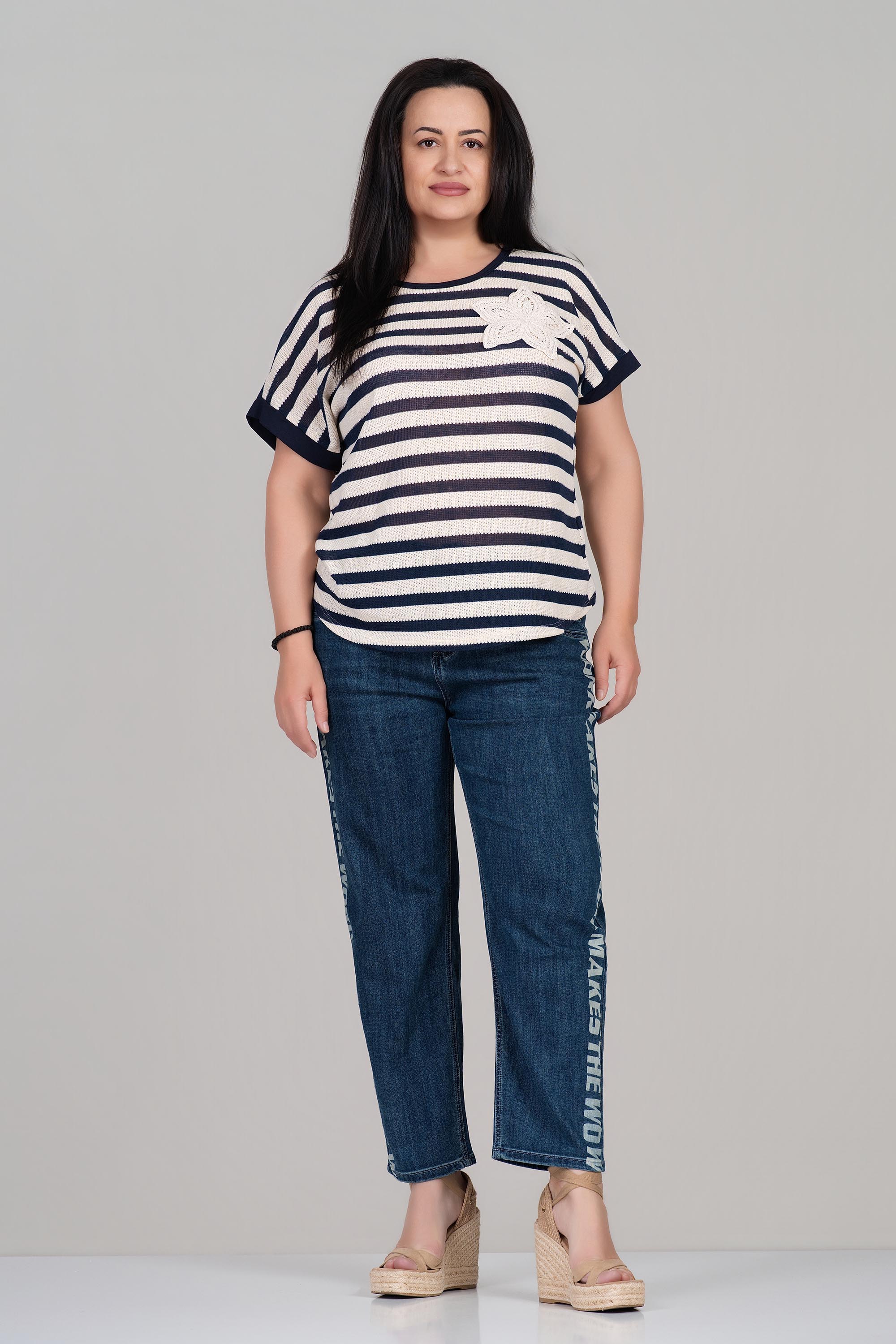 МАКСИ блуза от фино плетиво в черно райе със свободна кройка и бродирано цвете