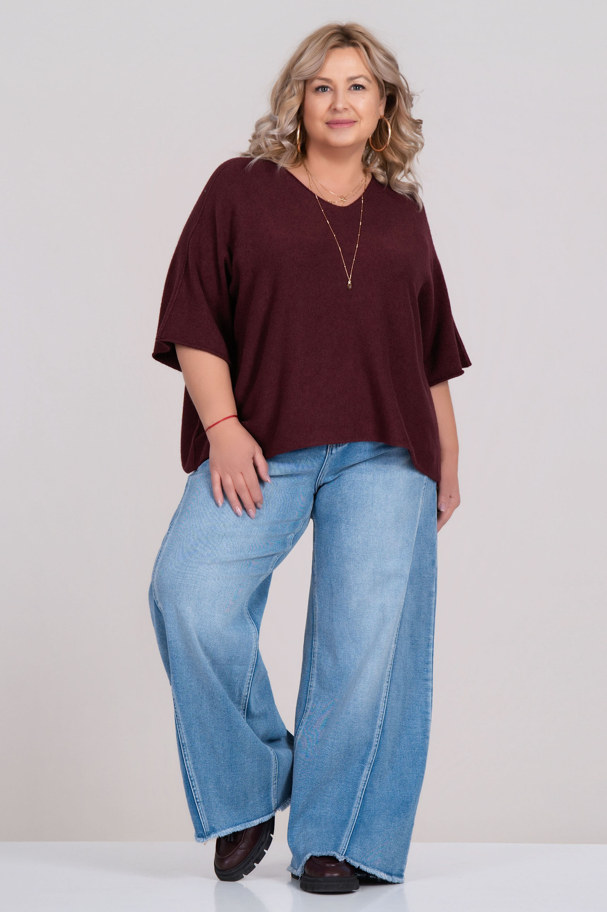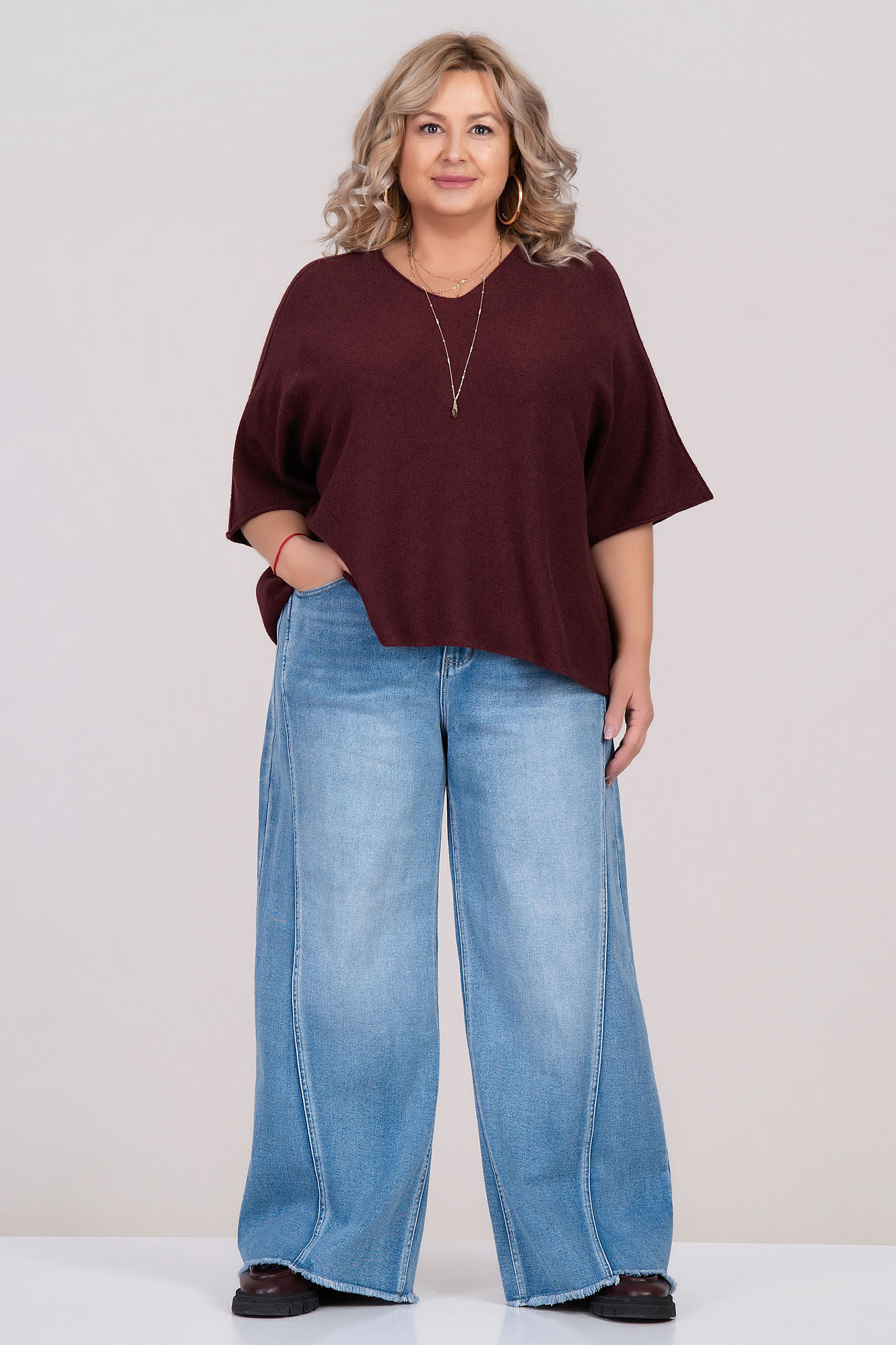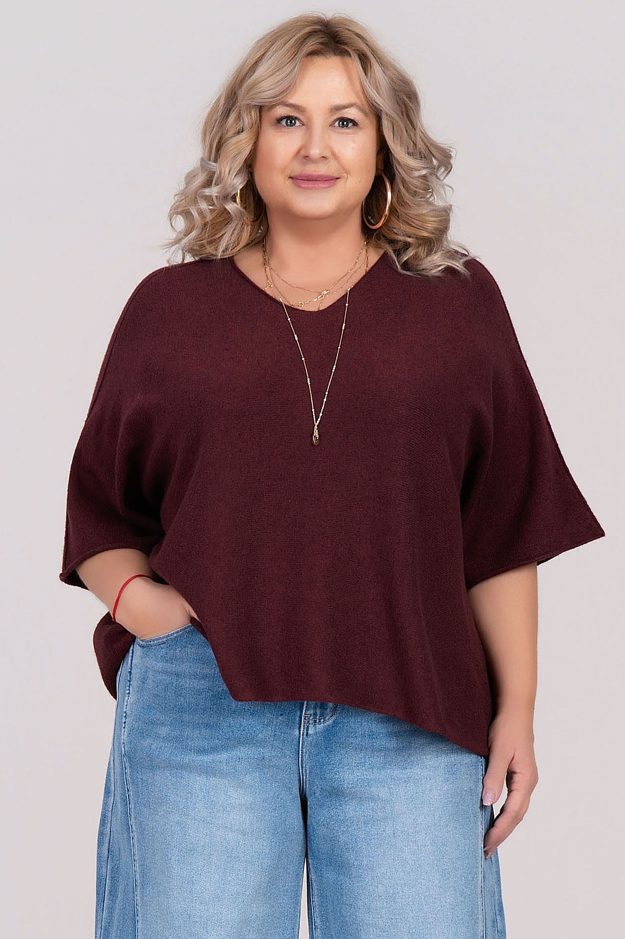 Тази лека и приятна на допир блуза е отличен избор за комфортно и стилно ежедневие. Изработена от фино италианско плетиво, моделът е с паднало рамо, свободна кройка и овално деколте. Универсалният лилав цвят и изчистената линия я правят лесна за съчетаване с дънки или панталон.