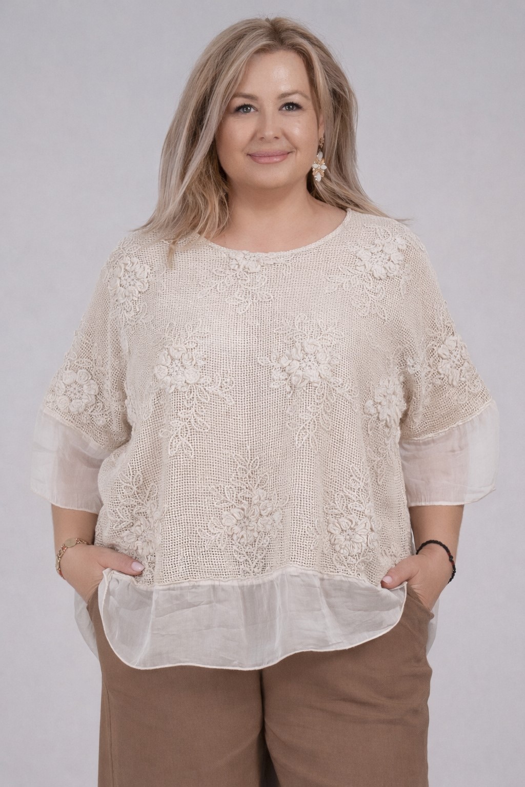 Тази бежова макси блуза съчетава елегантност и удобство. Изработена е от мек памук с 7/8 ръкав и обло деколте, допълнена от мрежеста платка с фини бродирани цветя. Подплатата осигурява комфорт и непрозрачност, а свободната кройка я прави подходяща за ежедневие и по-специални поводи.