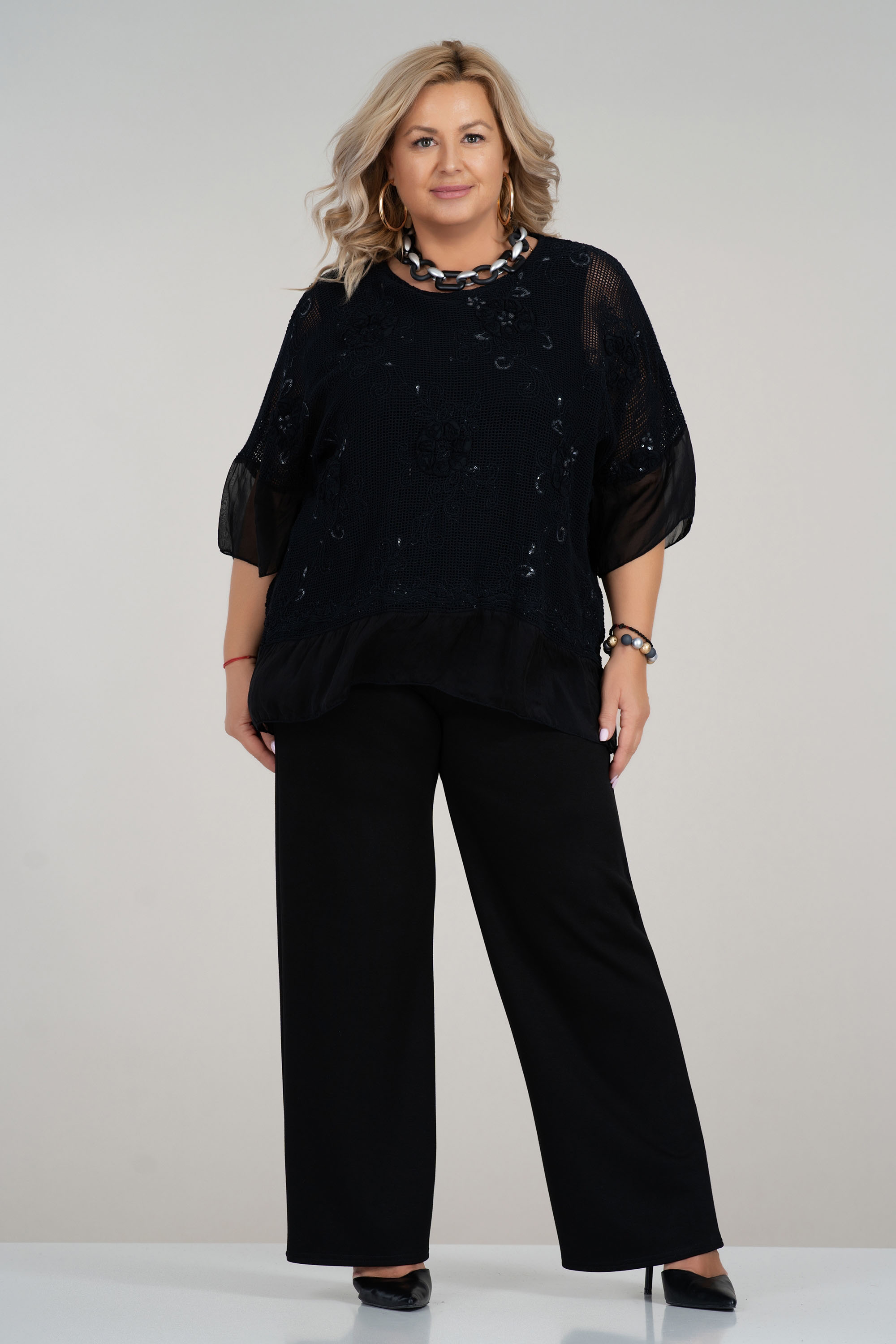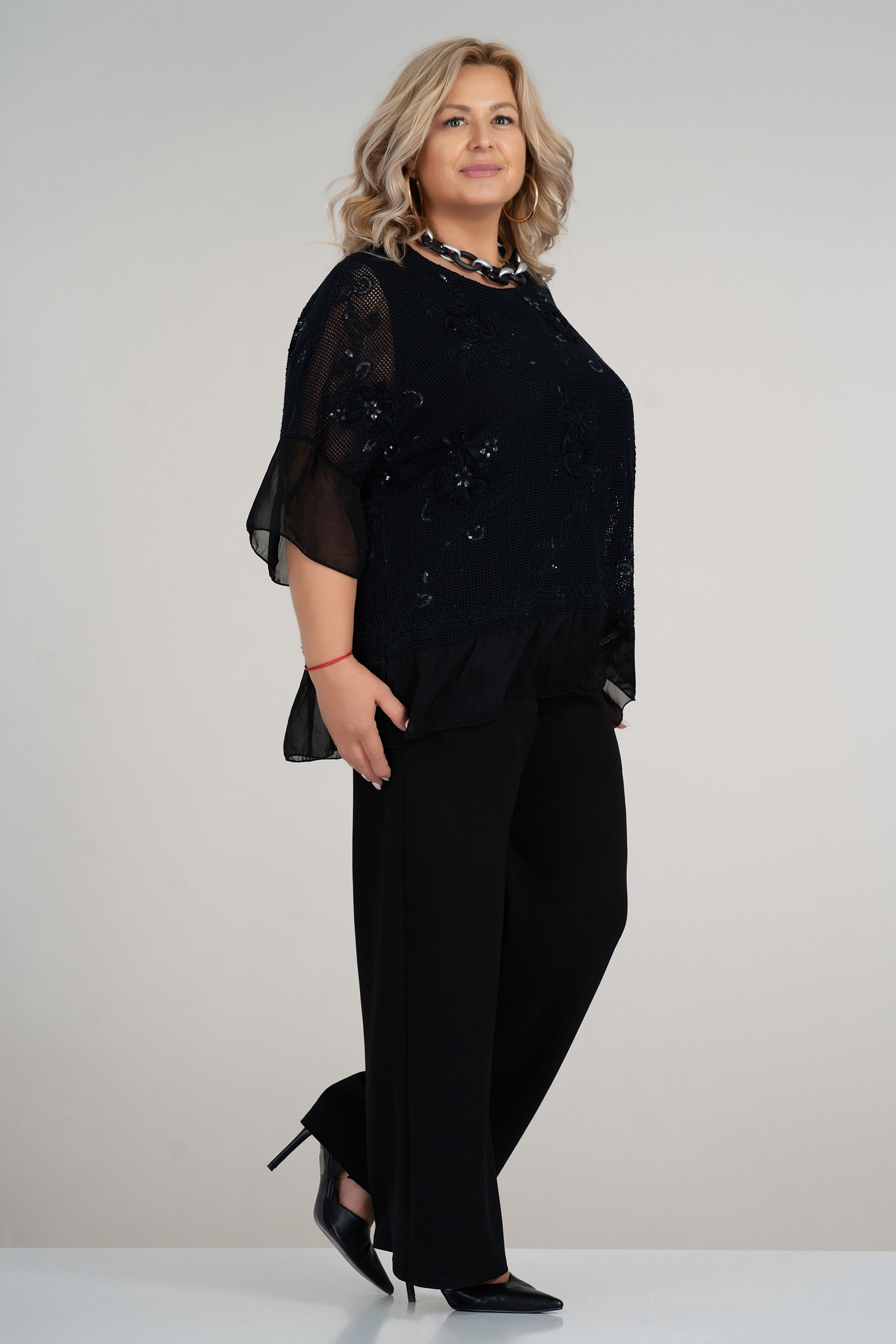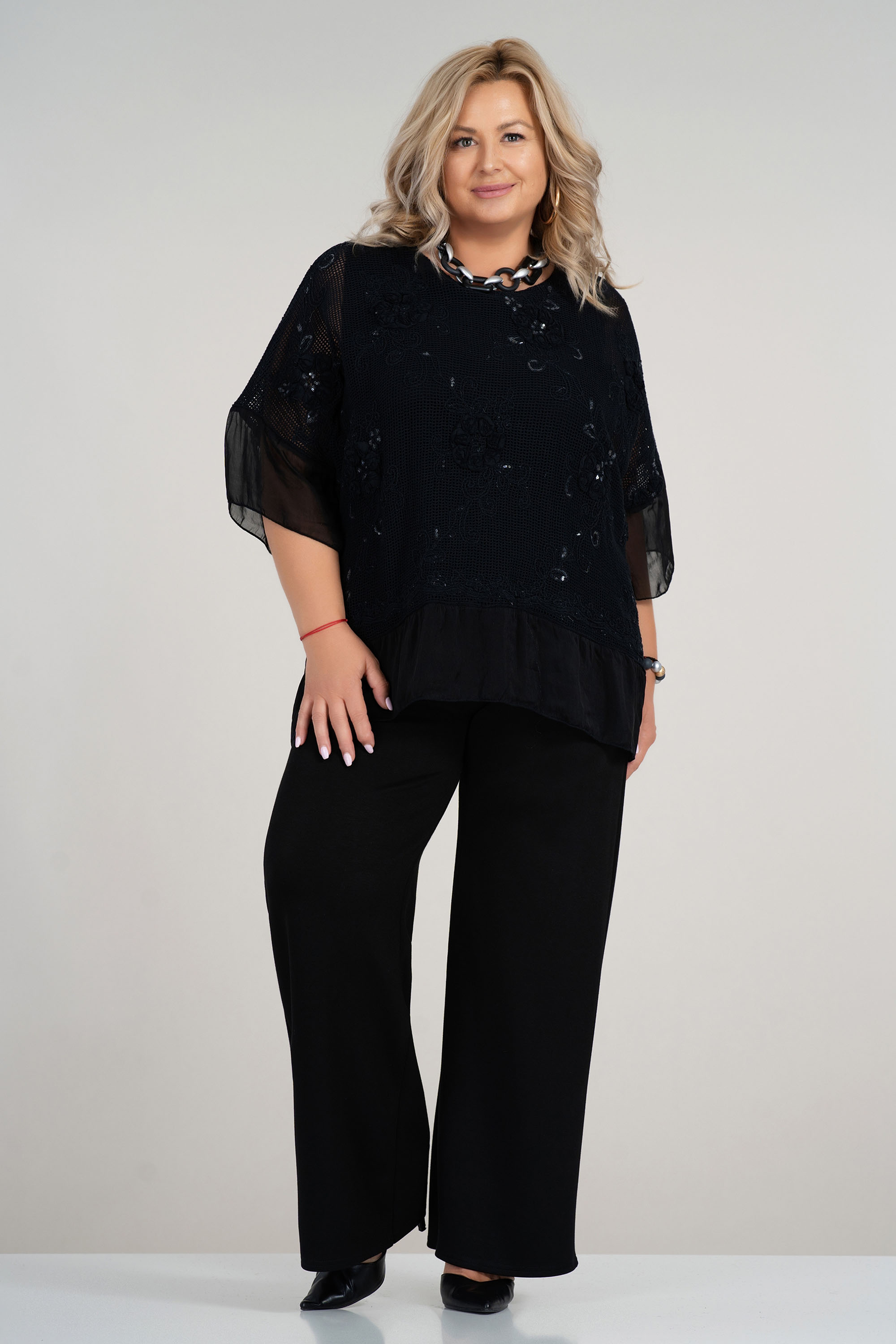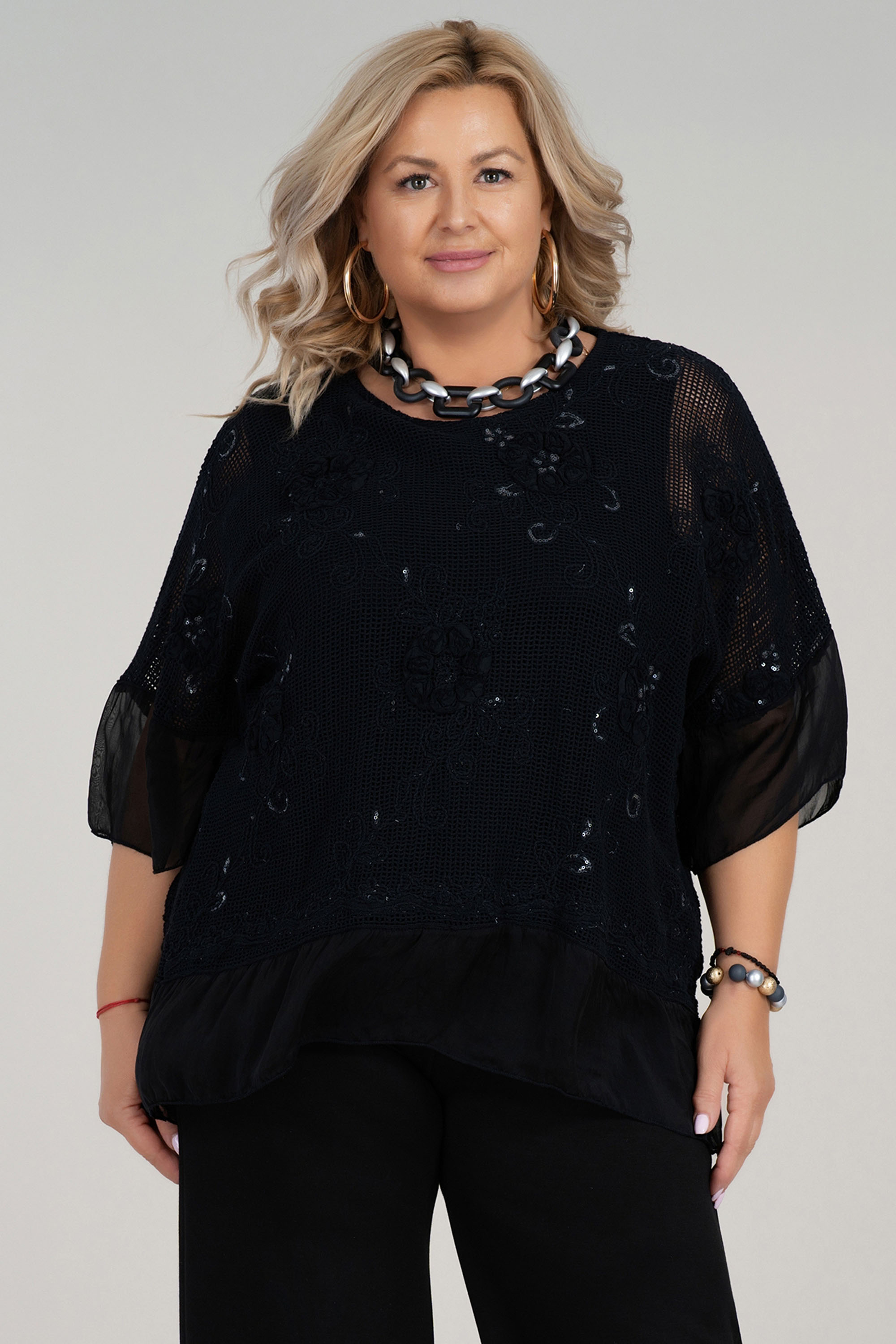 Макси блуза от памук и коприна в черно с бродирана мрежеста платка