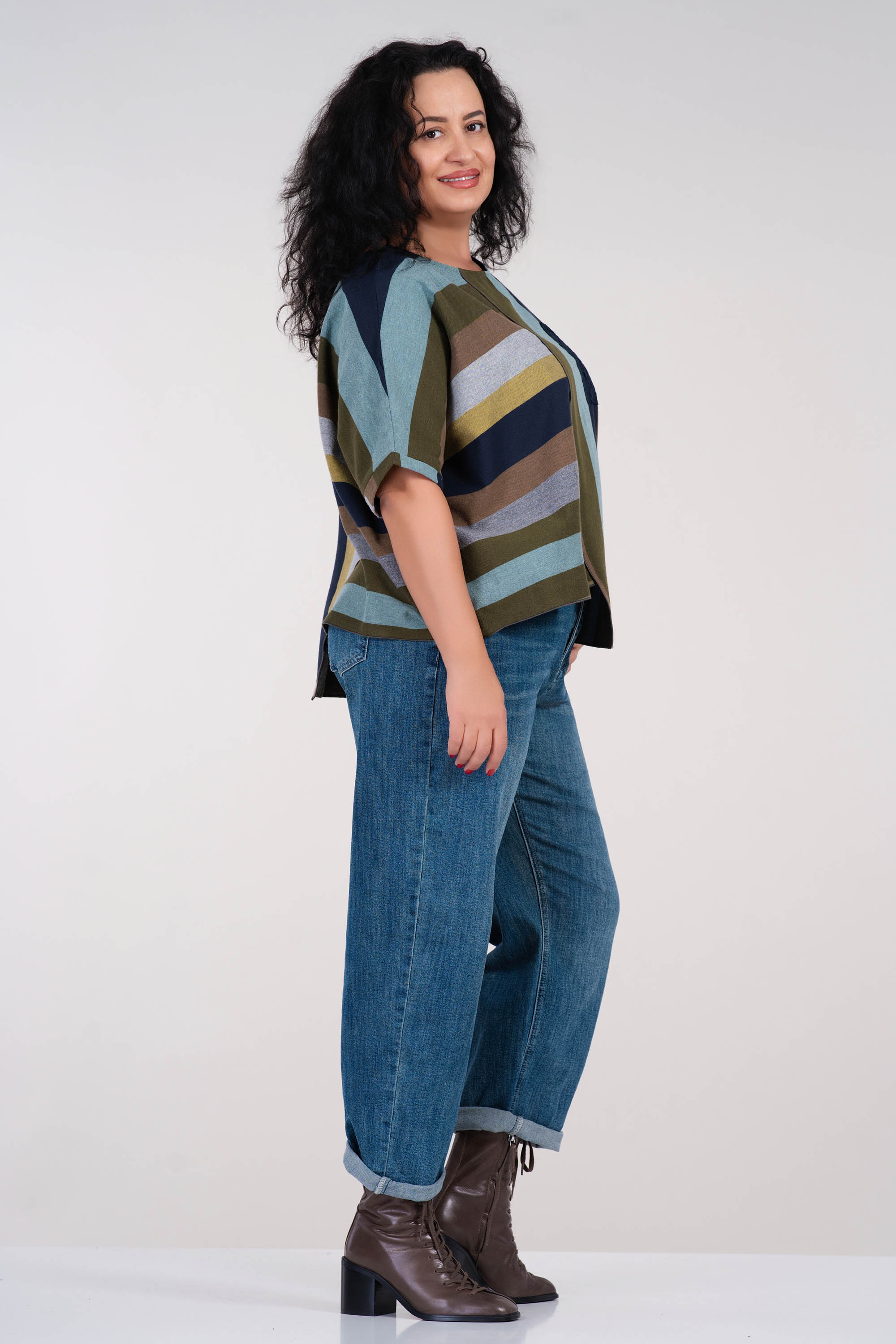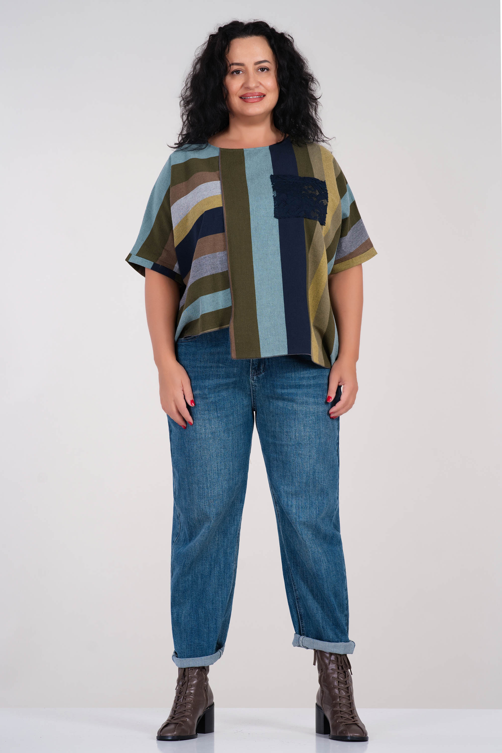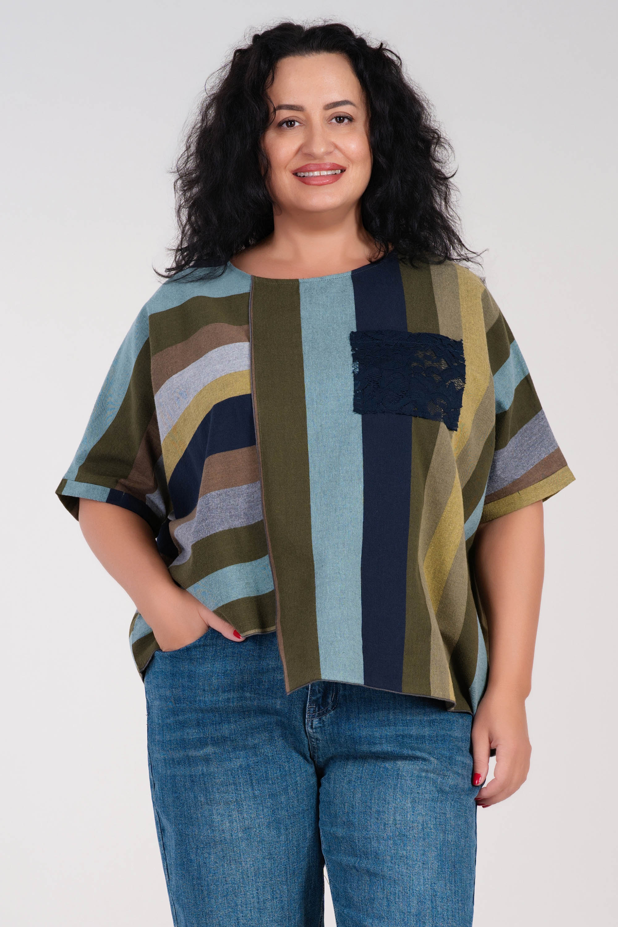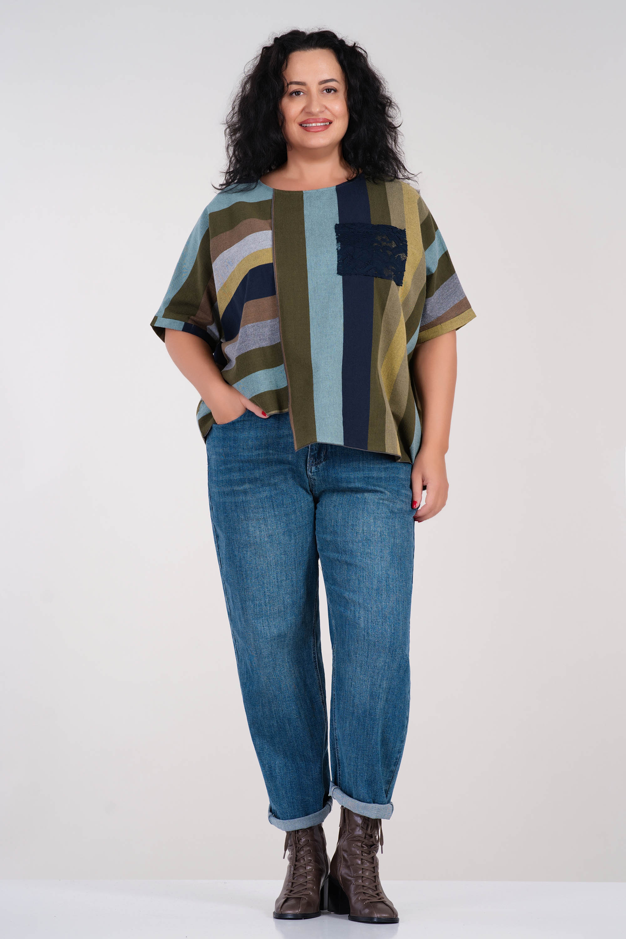 Тази ефектна макси блуза е изработена от чист памук и впечатлява с артистична комбинация от вертикални ленти в зелено, синьо, охра и сиво. Асиметричната кройка с обло деколте и ръкав тип прилеп създават свобода и визуален интерес. Декоративният дантелен джоб в тъмносиньо добавя неочакван, но стилен акцент. Подходяща за ежедневни визии с дънки или панталон.