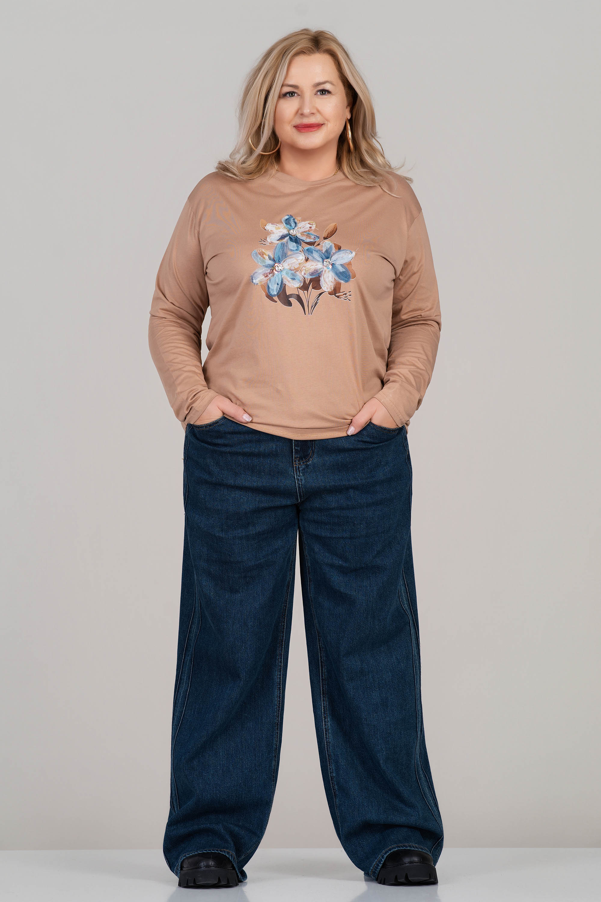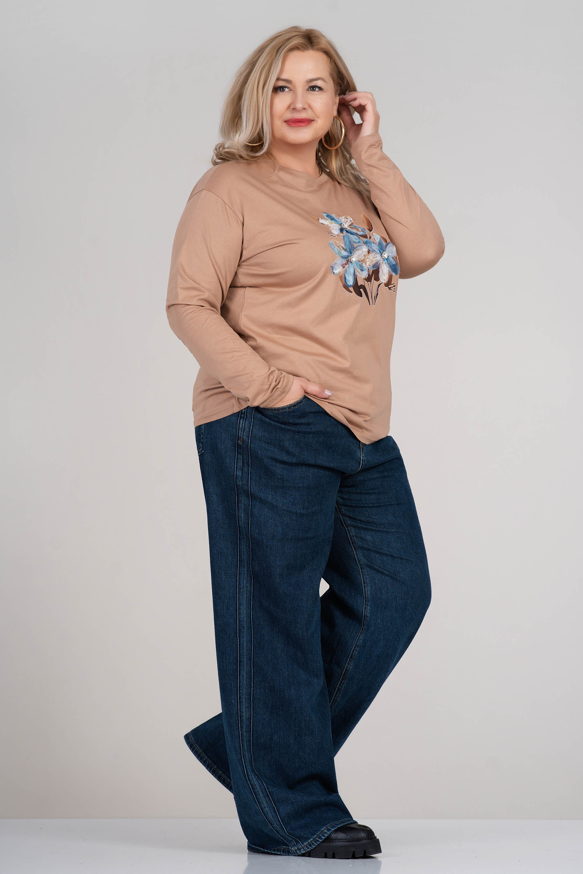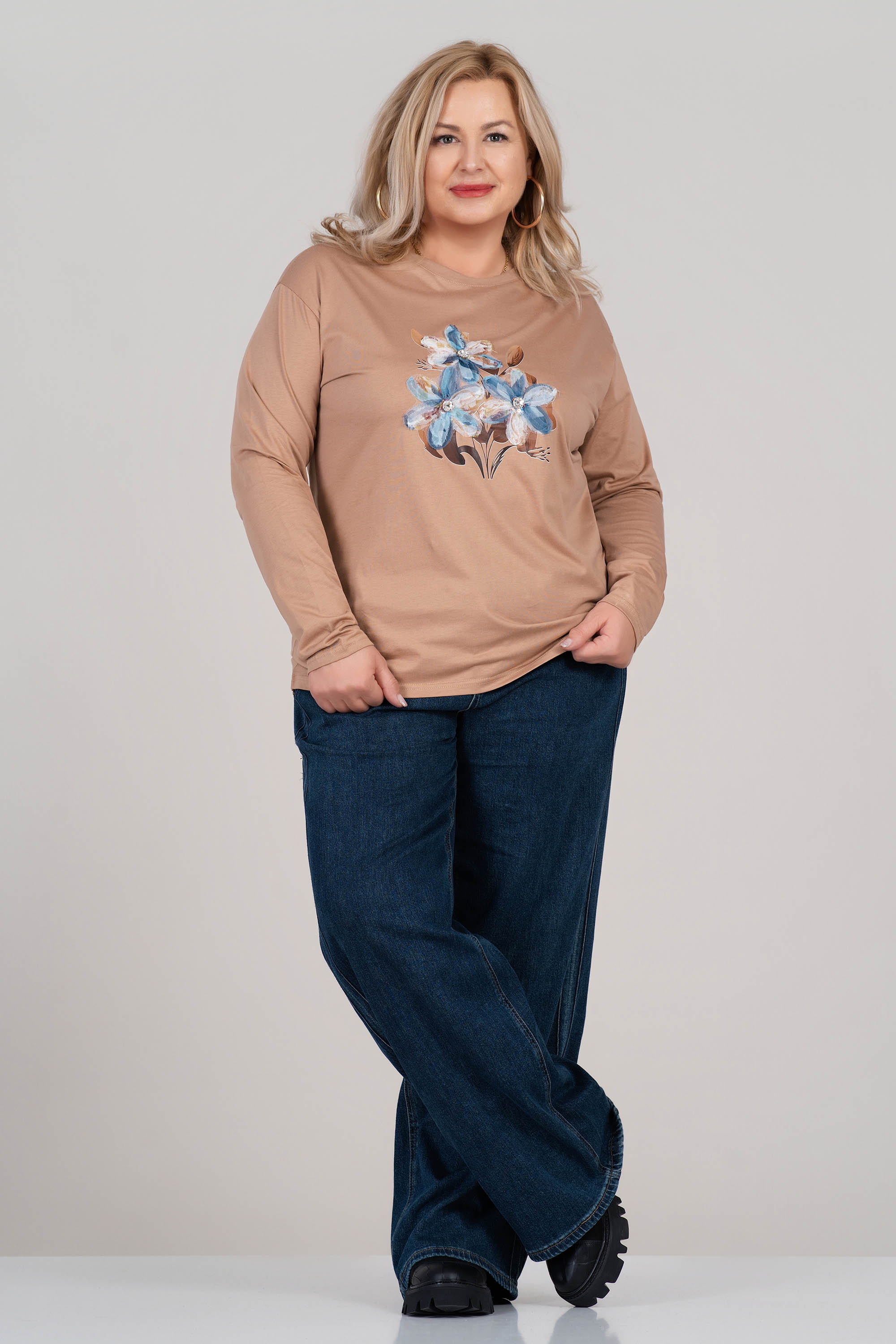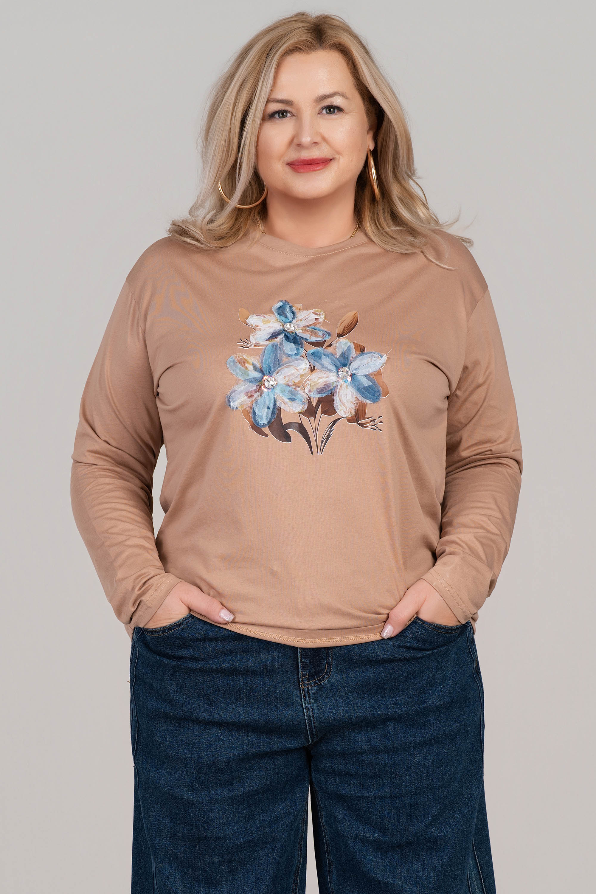 Макси блуза от меко трико в бежов цвят с впечатляващ флорален 3D принт отпред. Моделът е с дълги ръкави и класическо обло деколте, осигуряващ удобство и свобода на движение. Еластичната материя с високо съдържание на памук допринася за естествено усещане при допир. Подходяща за ежедневието и моментите на отдих.