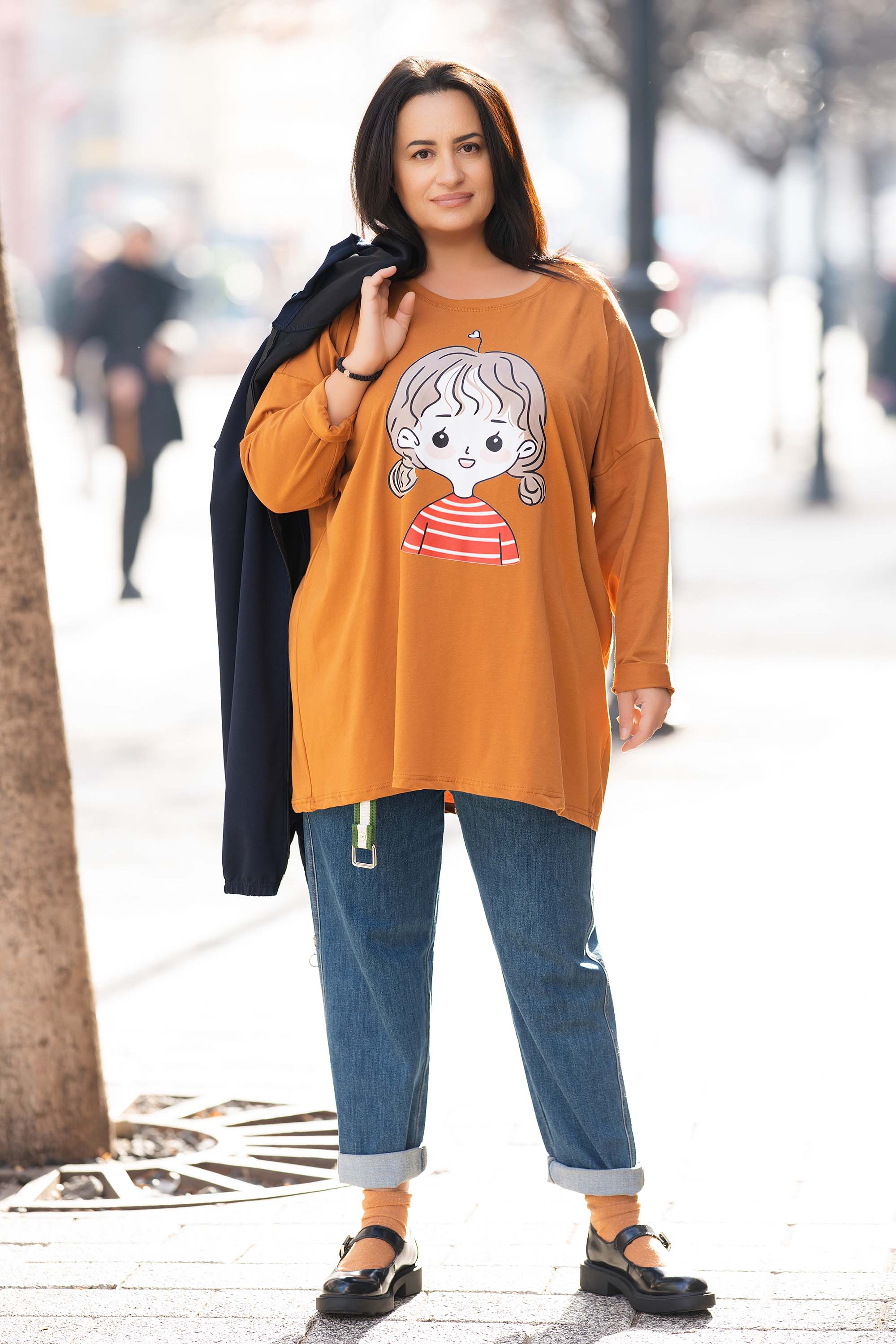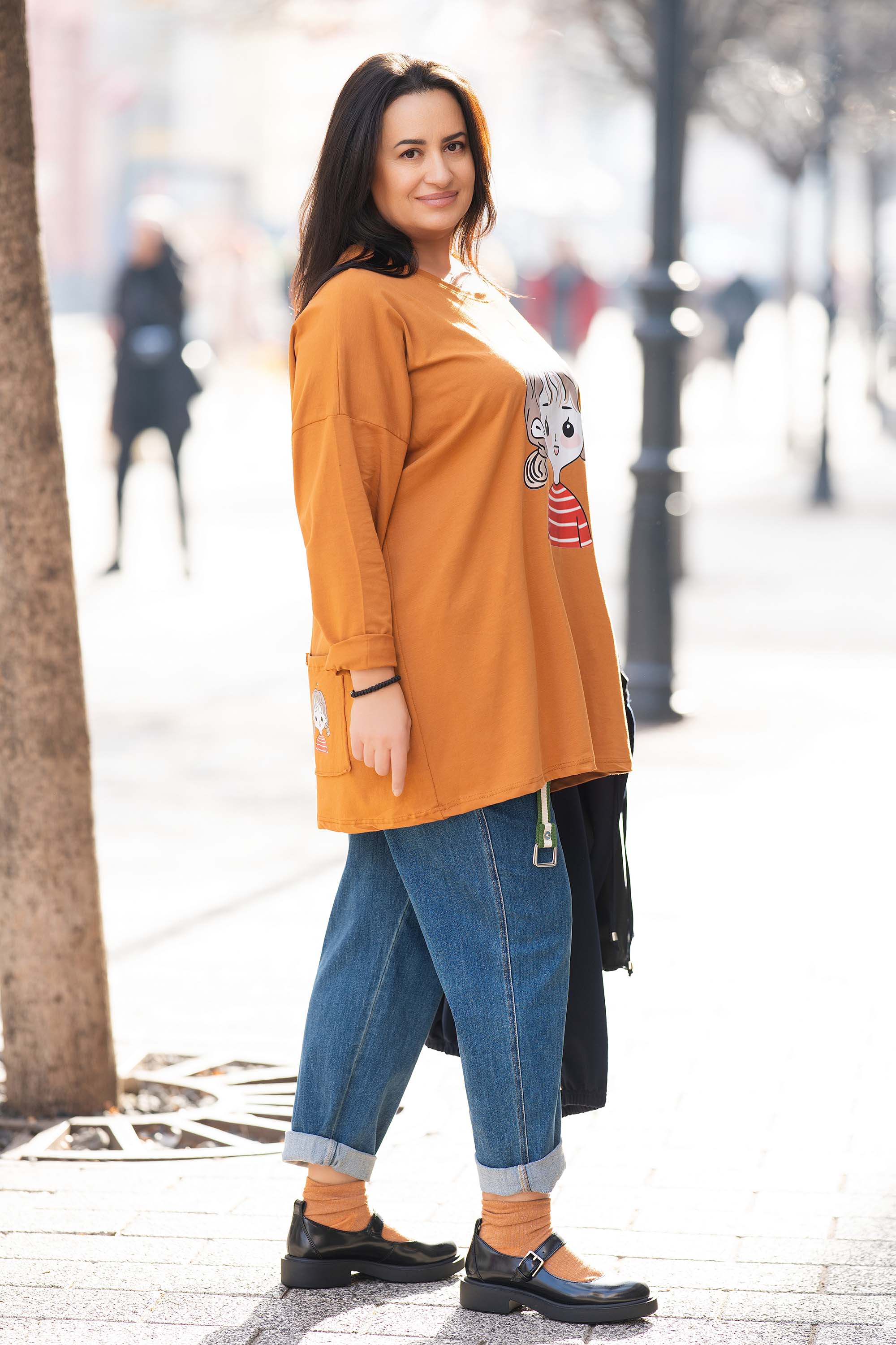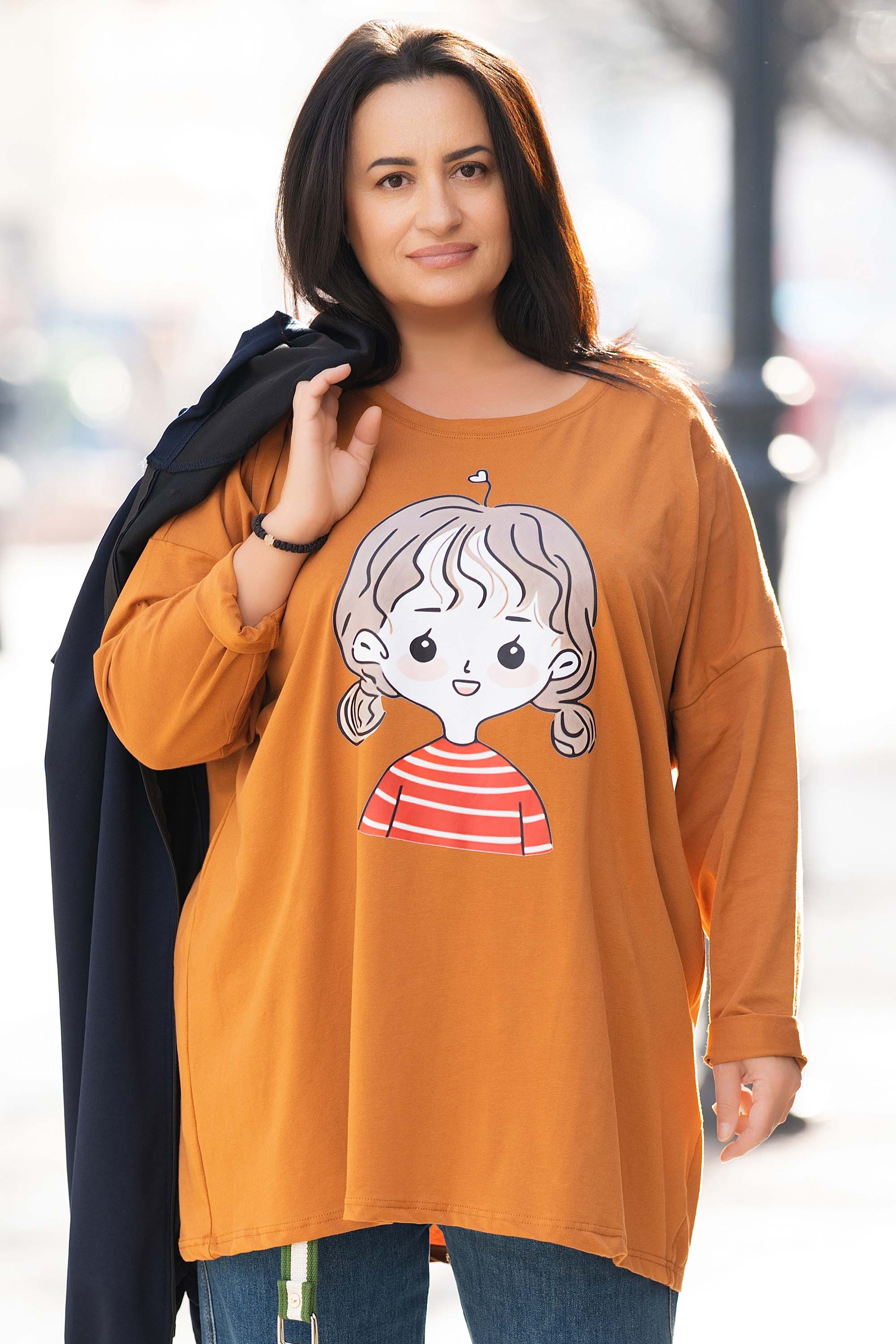 МАКСИ блуза от памук в цвят карамел с щампа анимирано момиче и заден джоб