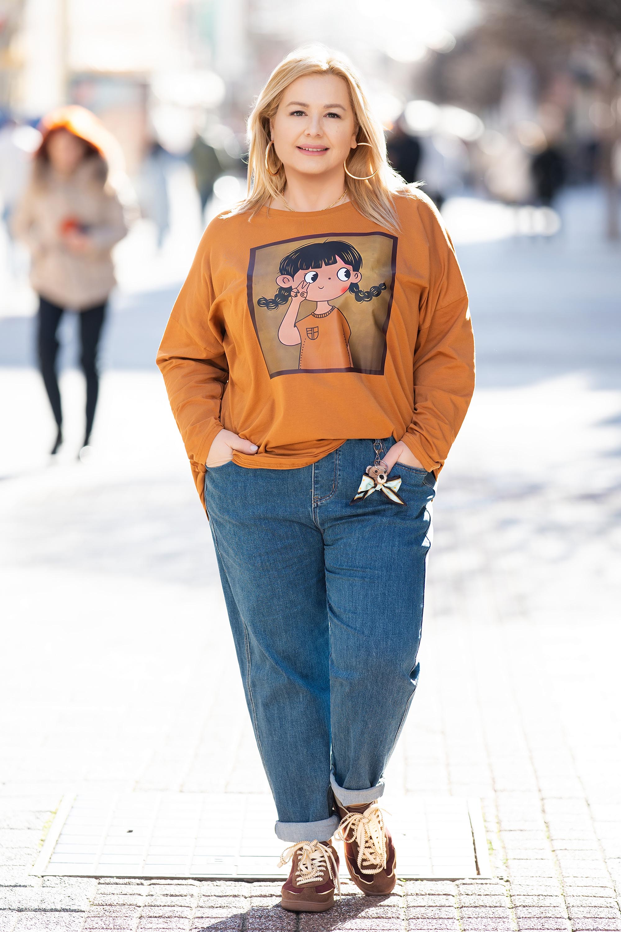 Тази макси блуза е създадена за жени, които ценят удобството и изразителния стил. Изработена е от висококачествен памук с добавен еластан за мекота и леко разтягане. Карамеленият цвят е свеж цвят за сезона, а илюстрацията с момиченце придава артистичен акцент. Моделът е с паднало рамо и свободна линия, подходящ за сезон пролет-есен.