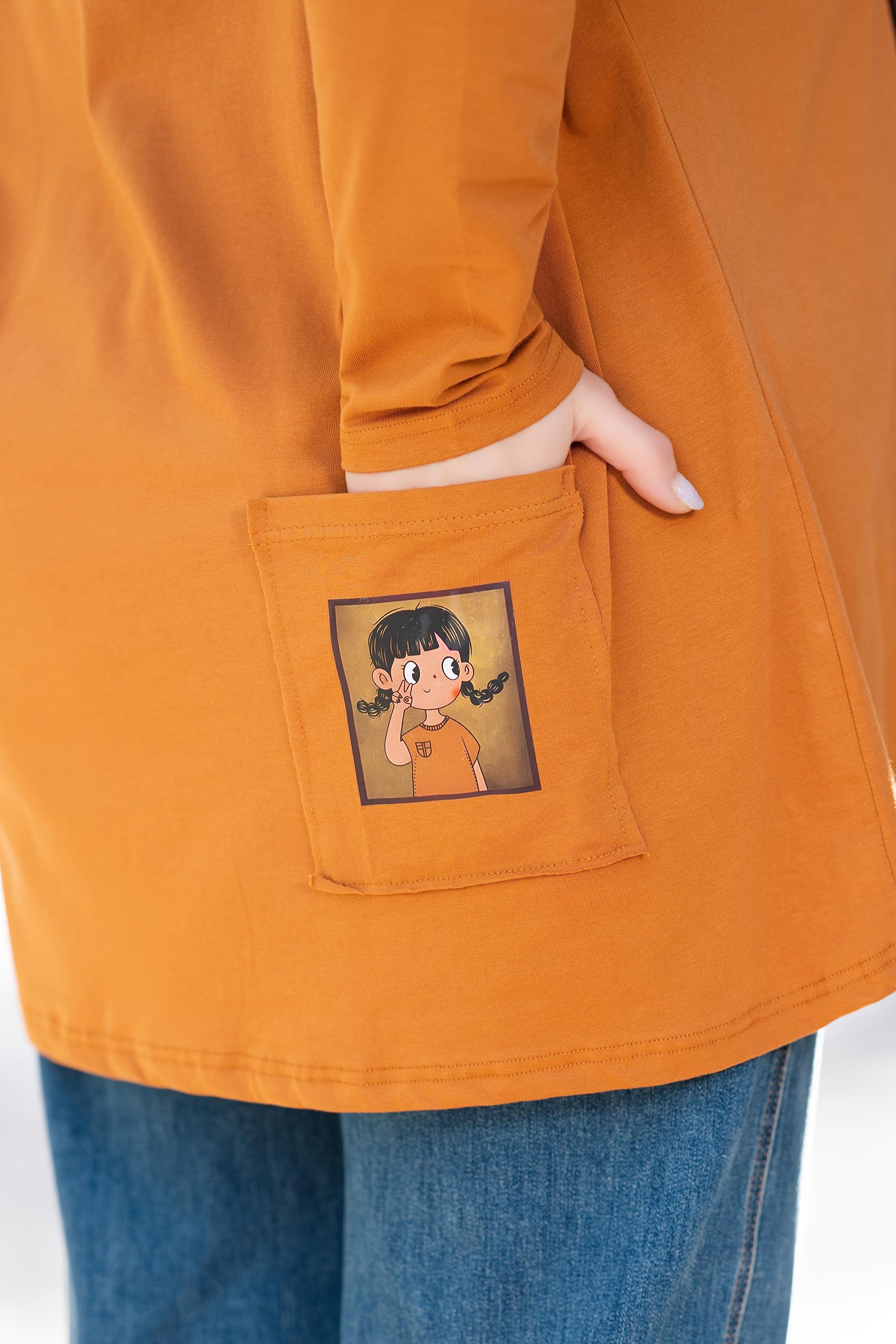 МАКСИ блуза от памук в цвят карамел с щампа момиче с две плитки и заден джоб