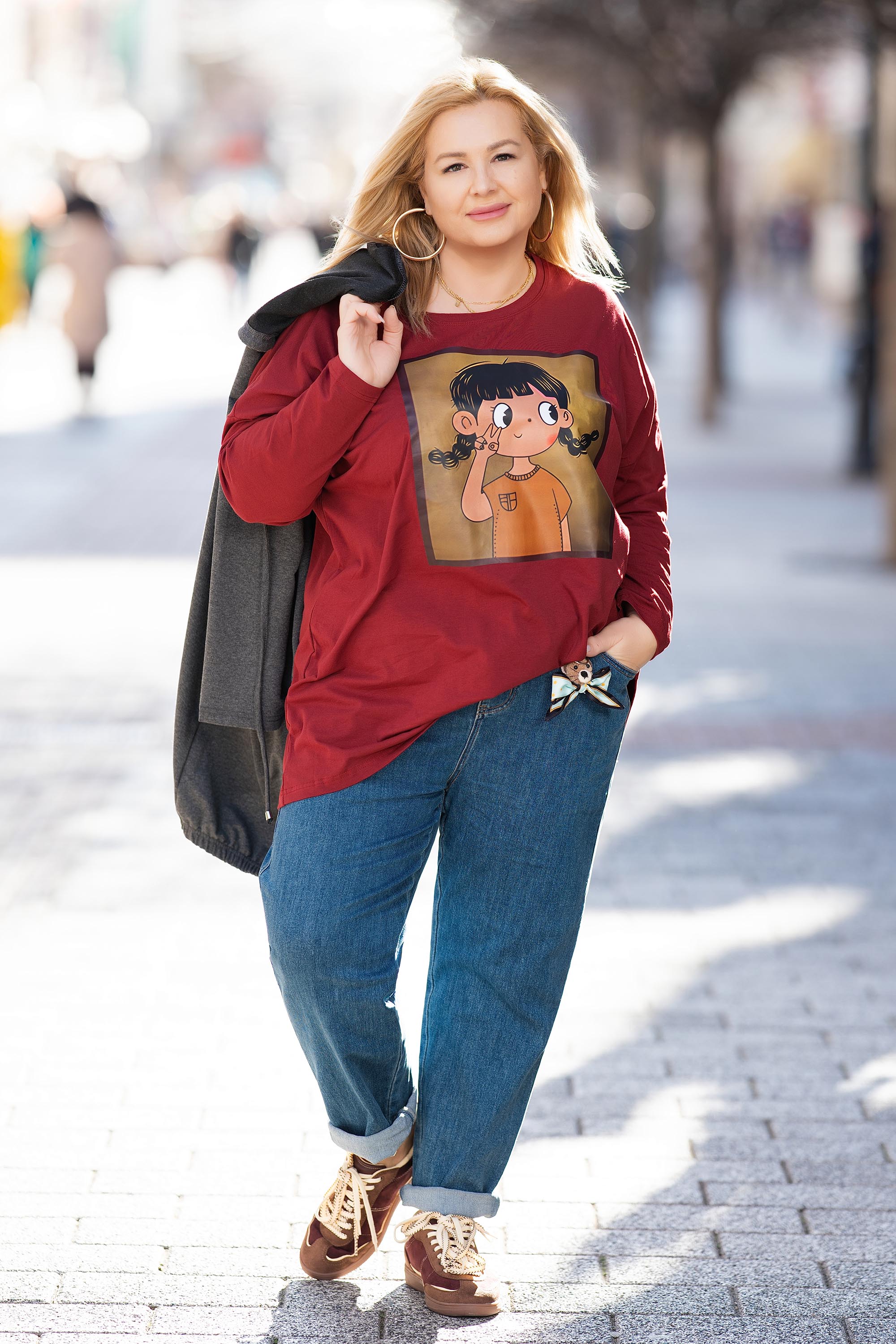 МАКСИ блуза от памук в цвят марсала с щампа момиче с две плитки и заден джоб
