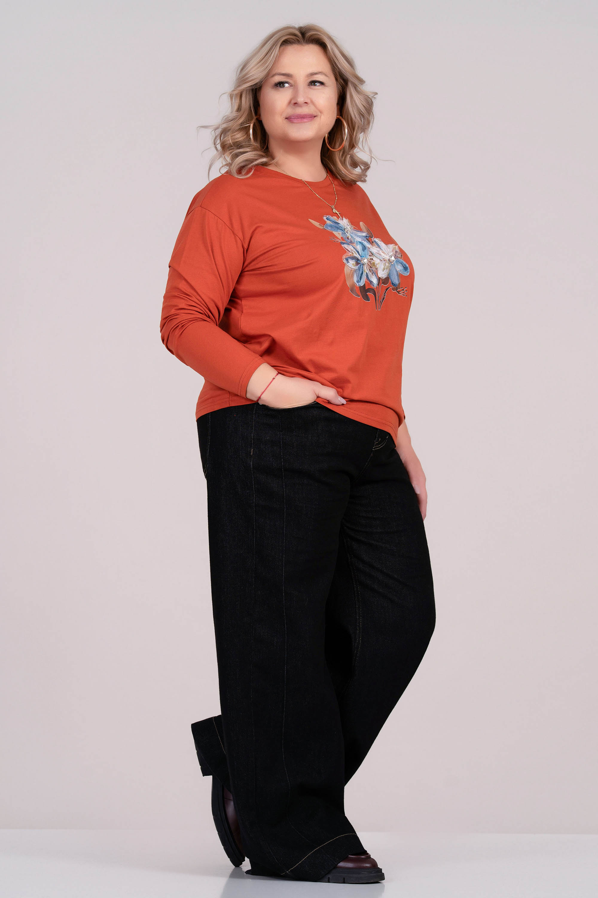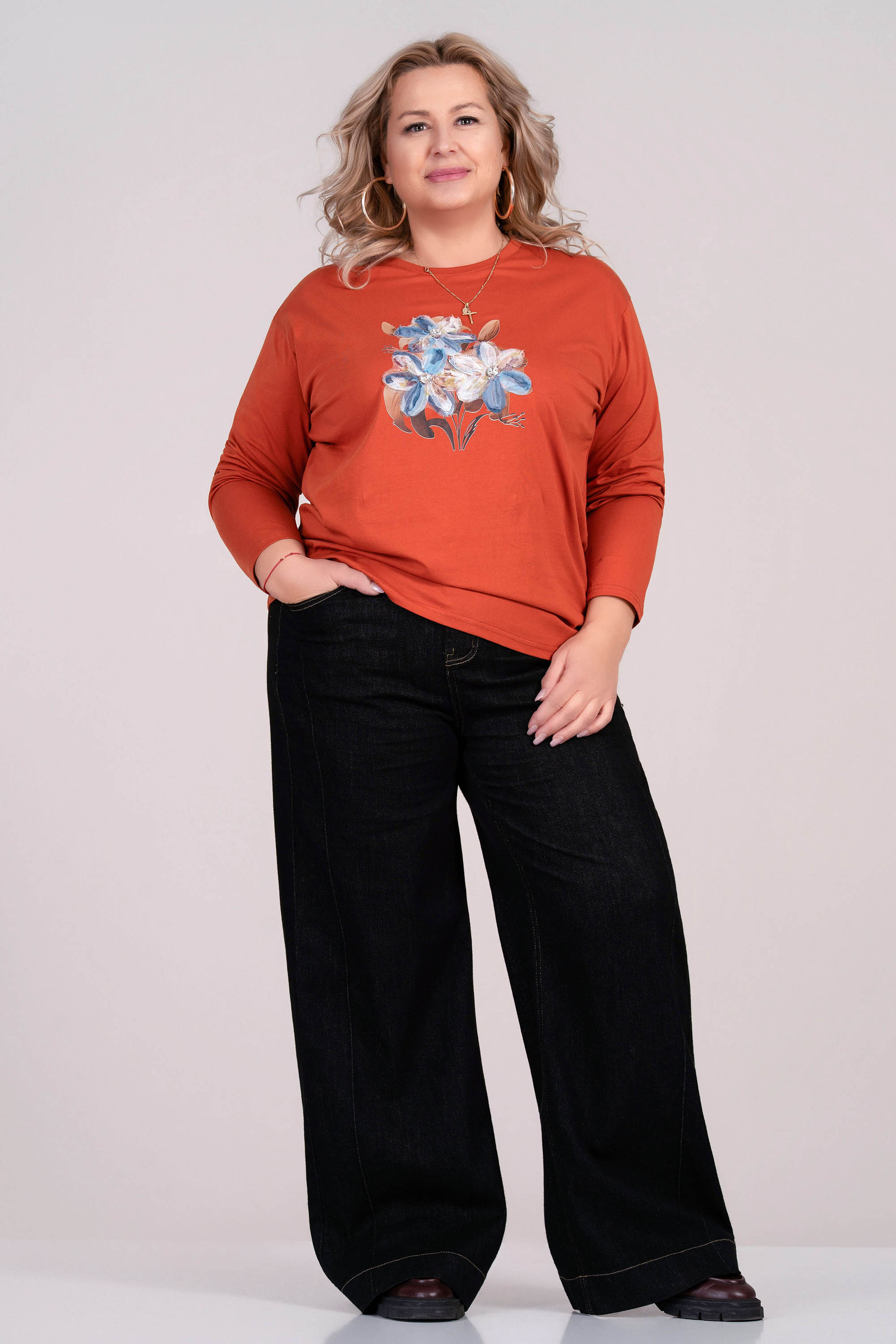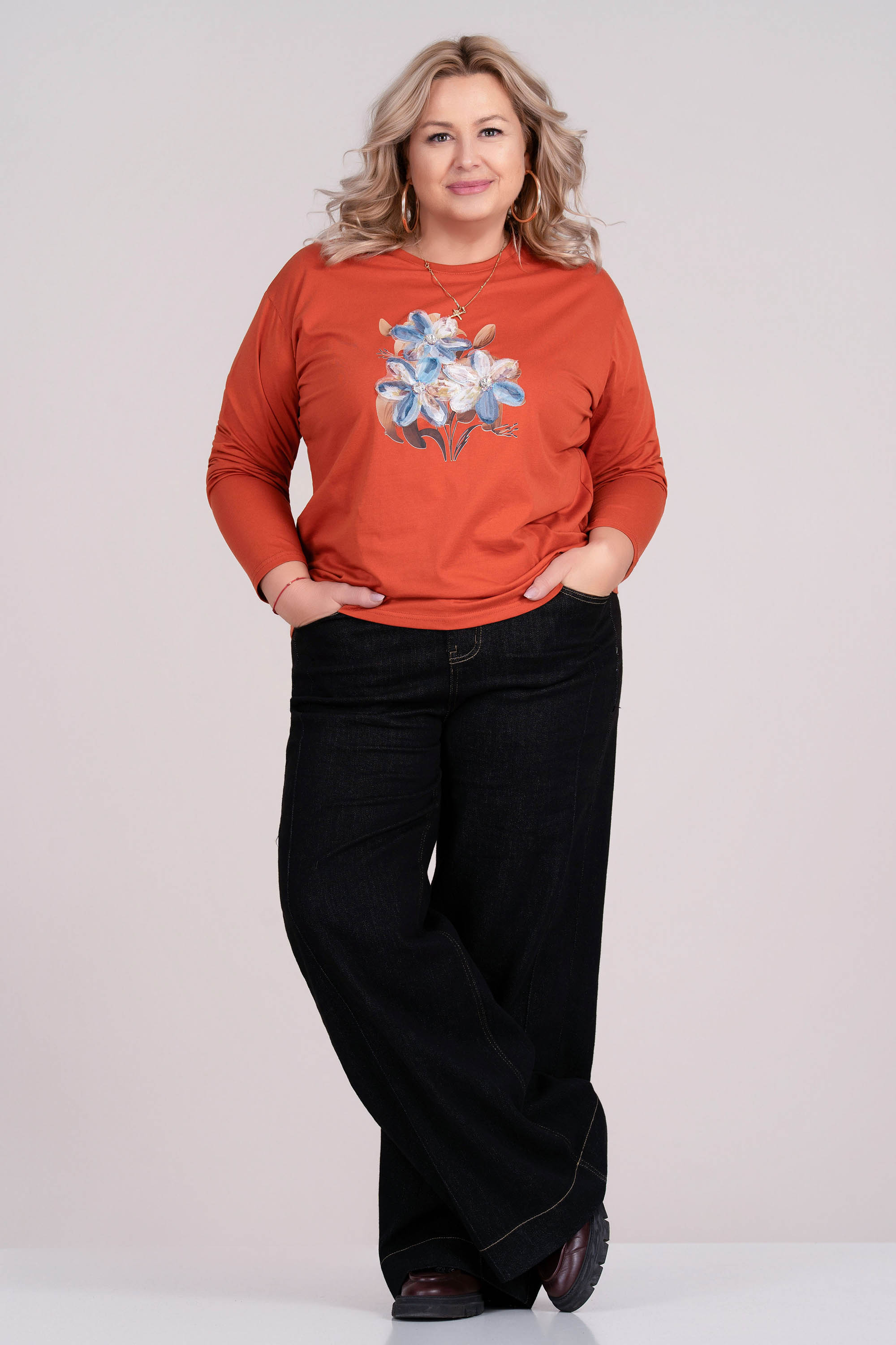 Макси блуза от меко трико в наситен оранжев цвят с впечатляващ флорален 3D принт отпред. Моделът е с дълги ръкави и класическо обло деколте, осигуряващ удобство и свобода на движение. Еластичната материя с високо съдържание на памук допринася за естествено усещане при допир. Подходяща за ежедневието и моментите на отдих.
