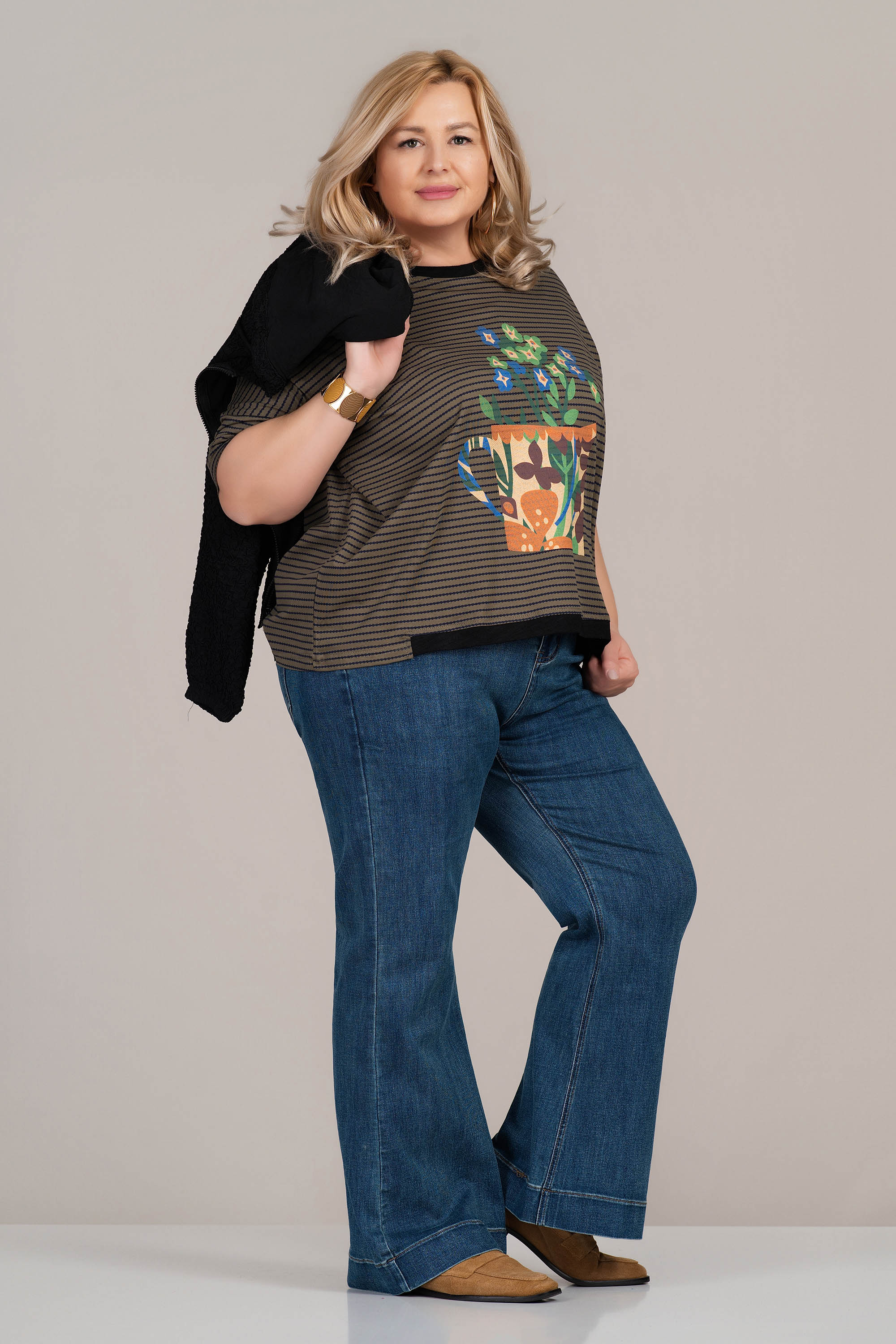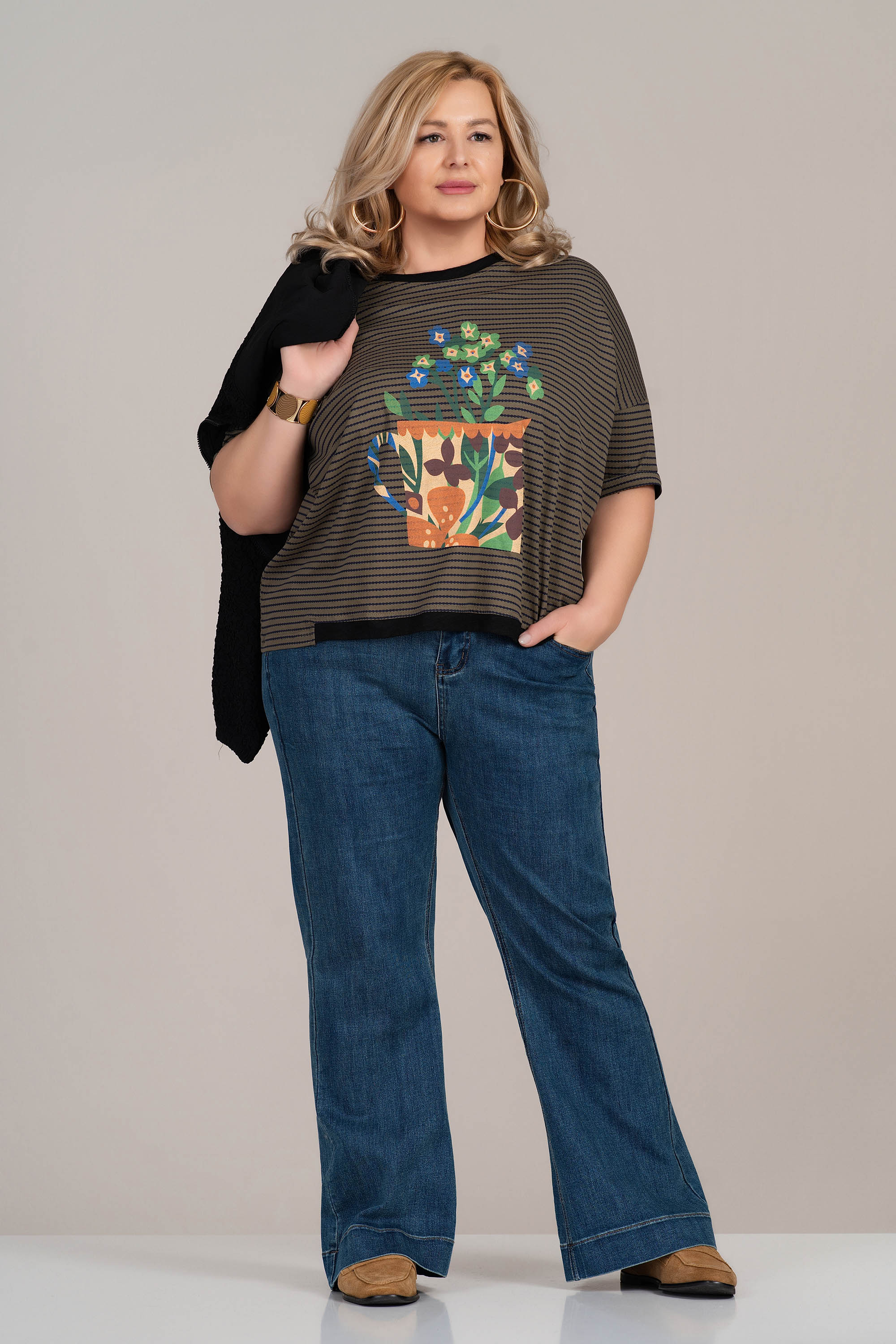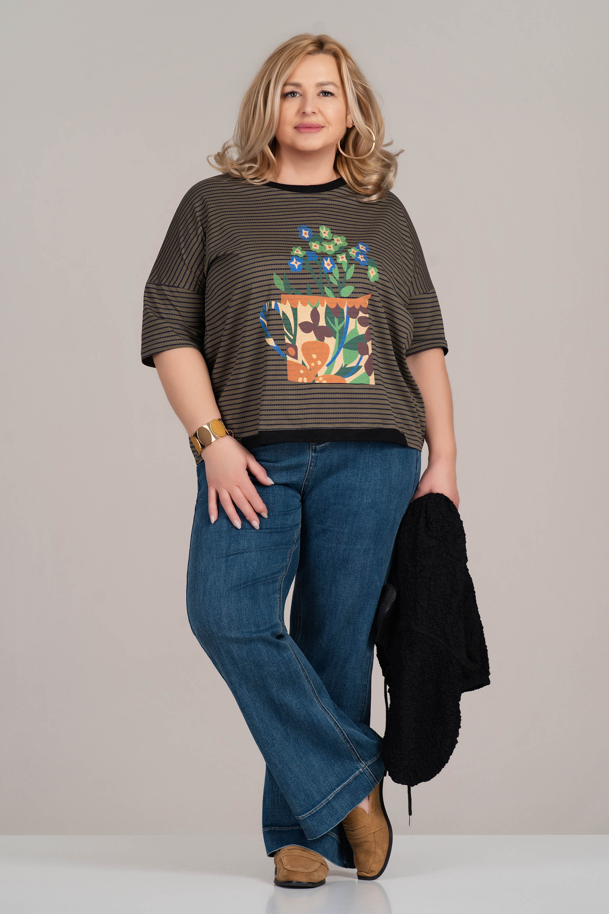 Тази макси блуза от трико впечатлява с артистичен принт – шарена ваза с цветя – и фон от фино хоризонтално райе. Естествената памучна материя осигурява комфорт през целия ден, а свободната кройка с обло деколте и ръкави до лакът я прави практична за ежедневно носене. Идеална за съчетание с дънки или спортен панталон.