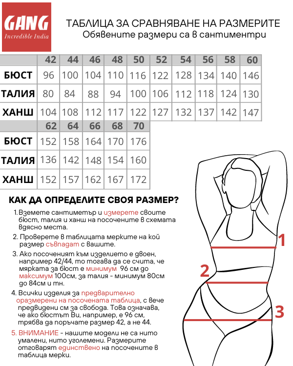 Към всеки артикул в онлайн магазин GANG има приложена таблица с размери. Ако имате нужда от допълнителни указания, наш консултант ще се радва да ви съдейства на телефони 0892257459, 0886122276.