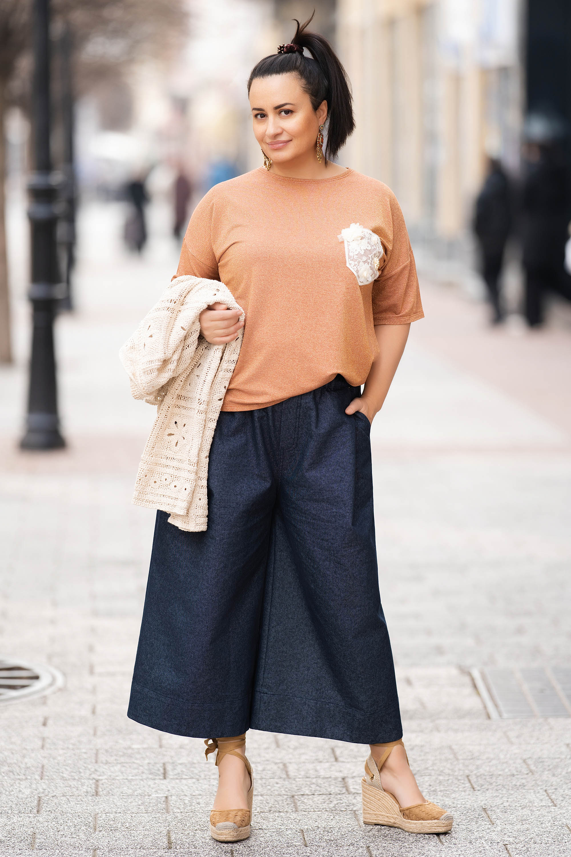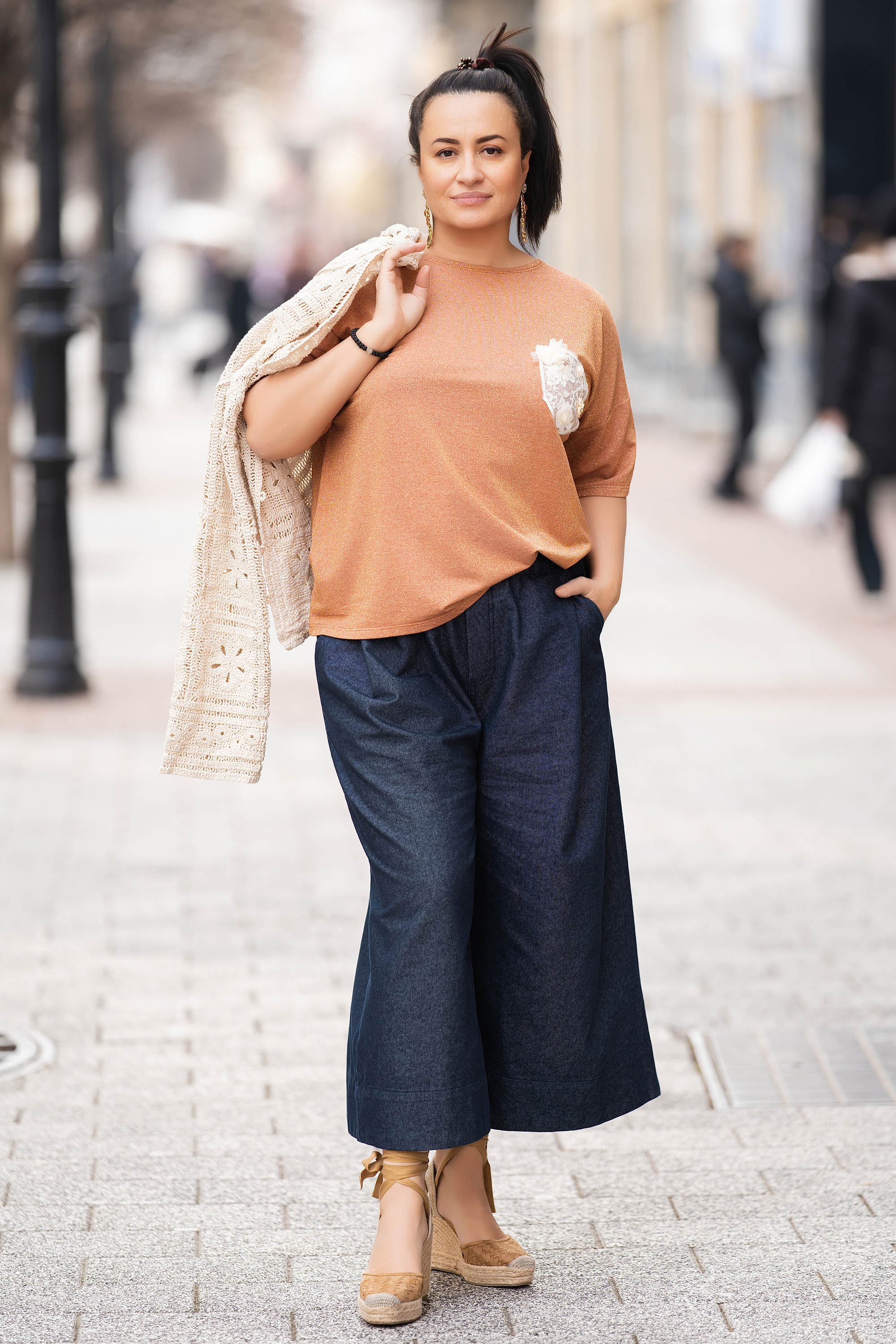 Тази блуза съчетава блясък и удобство в един елегантен силует. Изработена от мека материя с фина еластичност и ламе ефект, тя приляга свободно и комфортно към тялото. Облото деколте и ръкавите 3/4 допълват визията, а декоративният джоб от плетена дантела придава романтичен акцент. Подходяща за ежедневието или специални поводи, придаващ нотка стил.