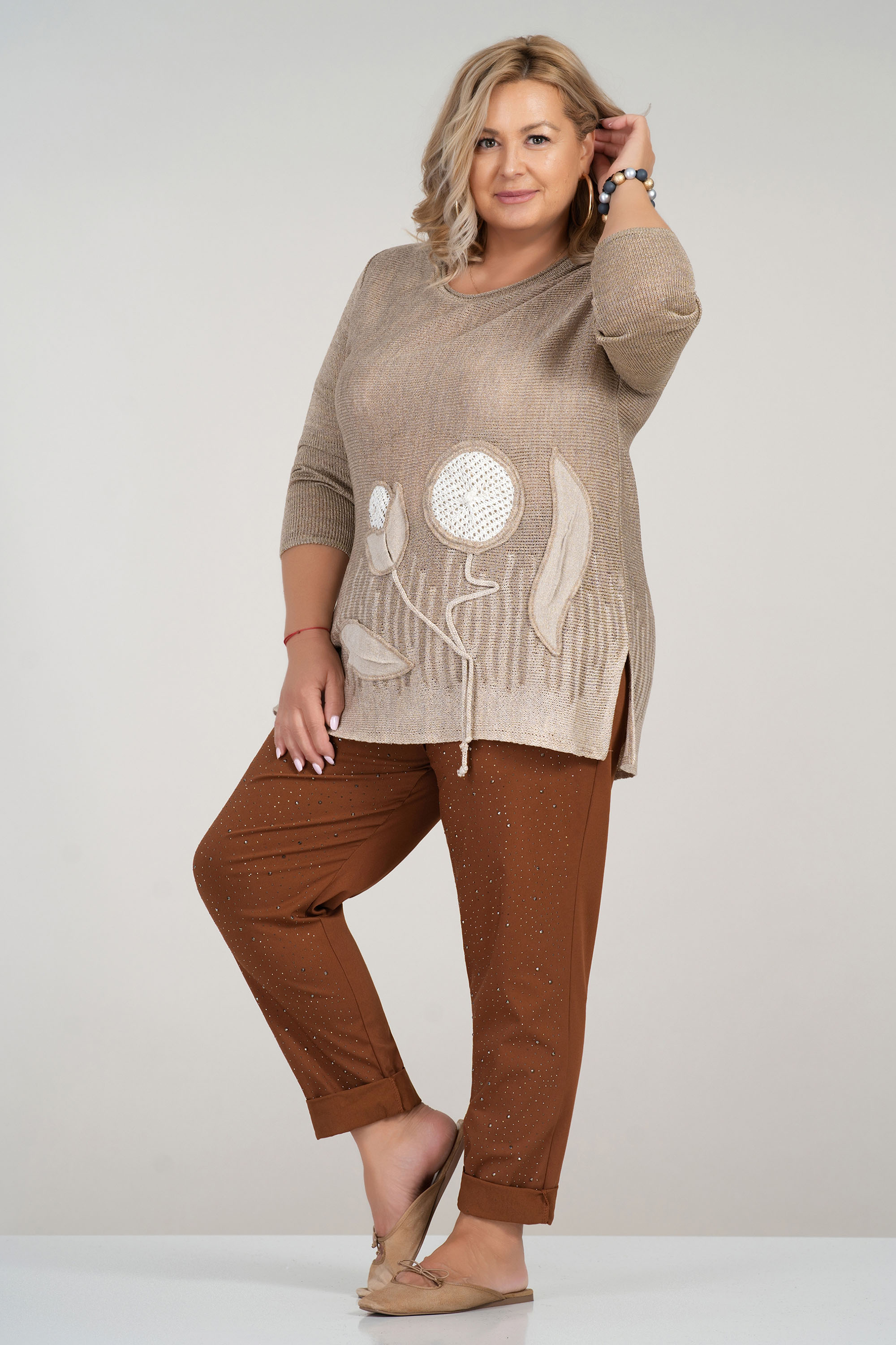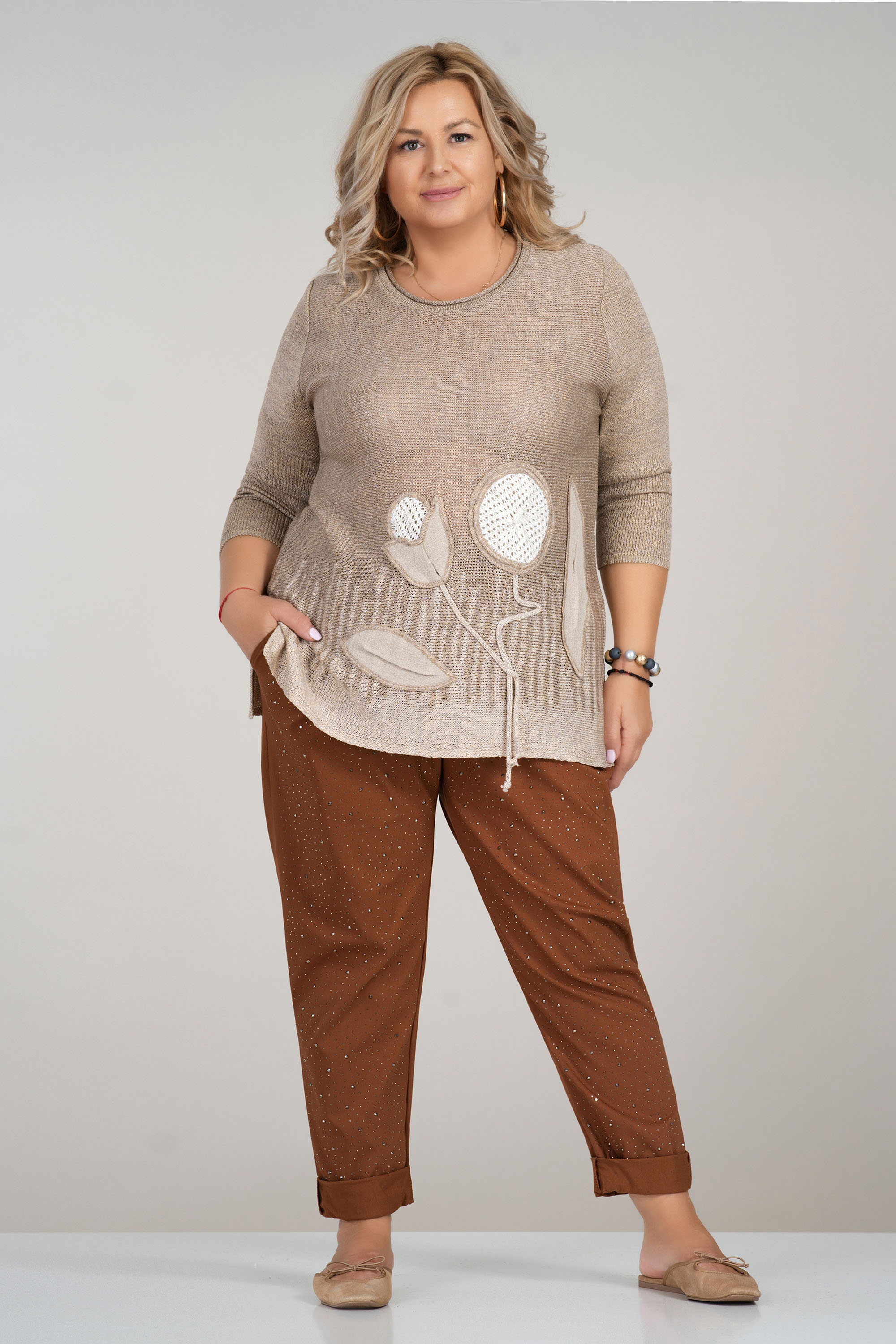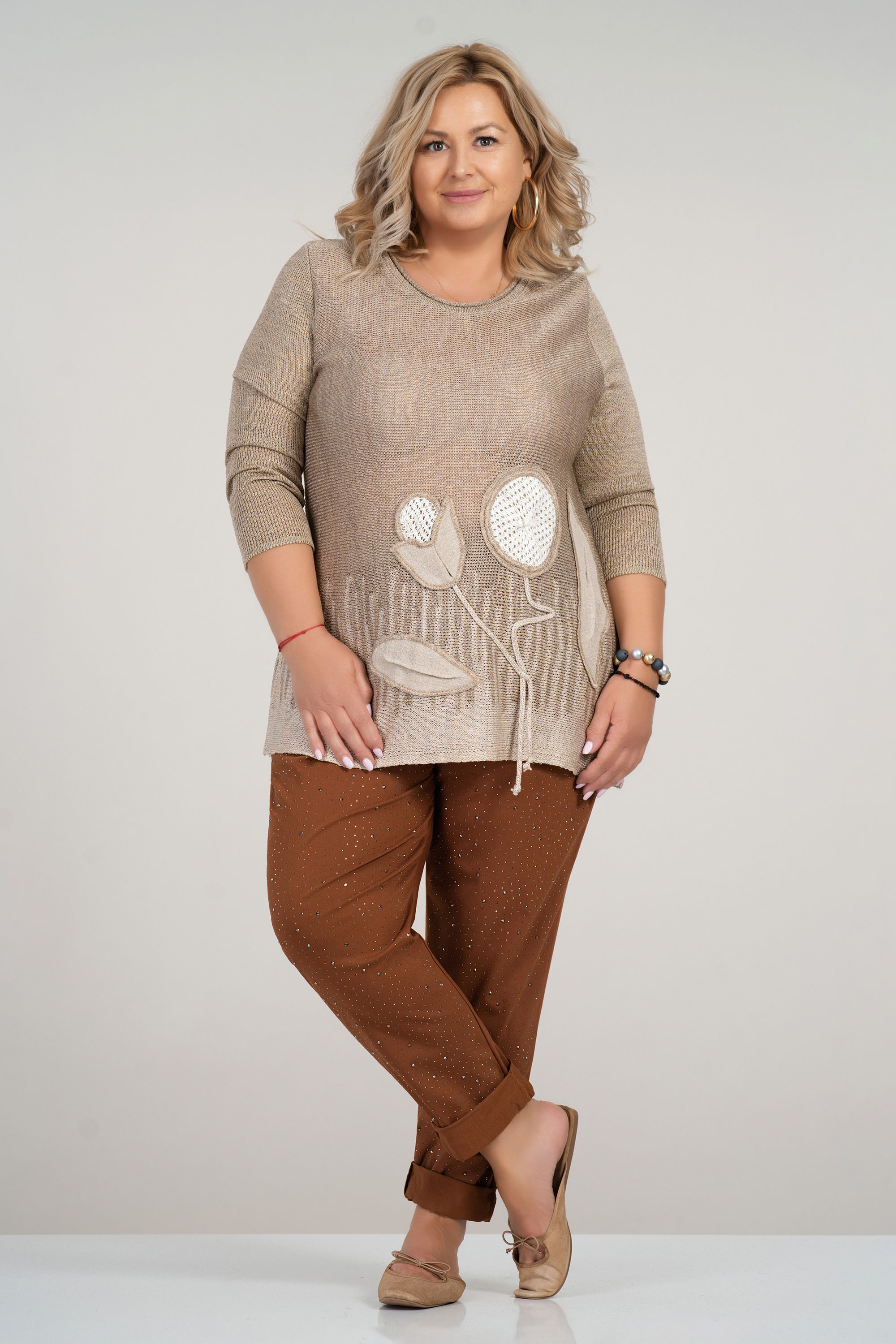 Бутиков модел в ограничено количество, изработен е от висококачествено плетиво с високо съдържание на лен, което осигурява комфорт и мекота през преходните сезони. Блузата е в бежов цвят с деликатни хоризонтални линии в плетката, които ѝ дават изчистен и елегантен вид. Има права, свободна кройка, която пада леко по тялото и осигурява свобода на движение. Ръкавите са 7/8 дължина, а в долната част има красив релефен флорален мотив – голямо цвете и листа, изработени в бял цвят, но с различна текстура, което добавя стилен акцент. Блузата е с класическо обло деколте и странични цепки за по-добро прилягане. Идеална е за комбиниране с дънки или панталони, като съчетава едновременно удобство и женственост през преходните сезони.