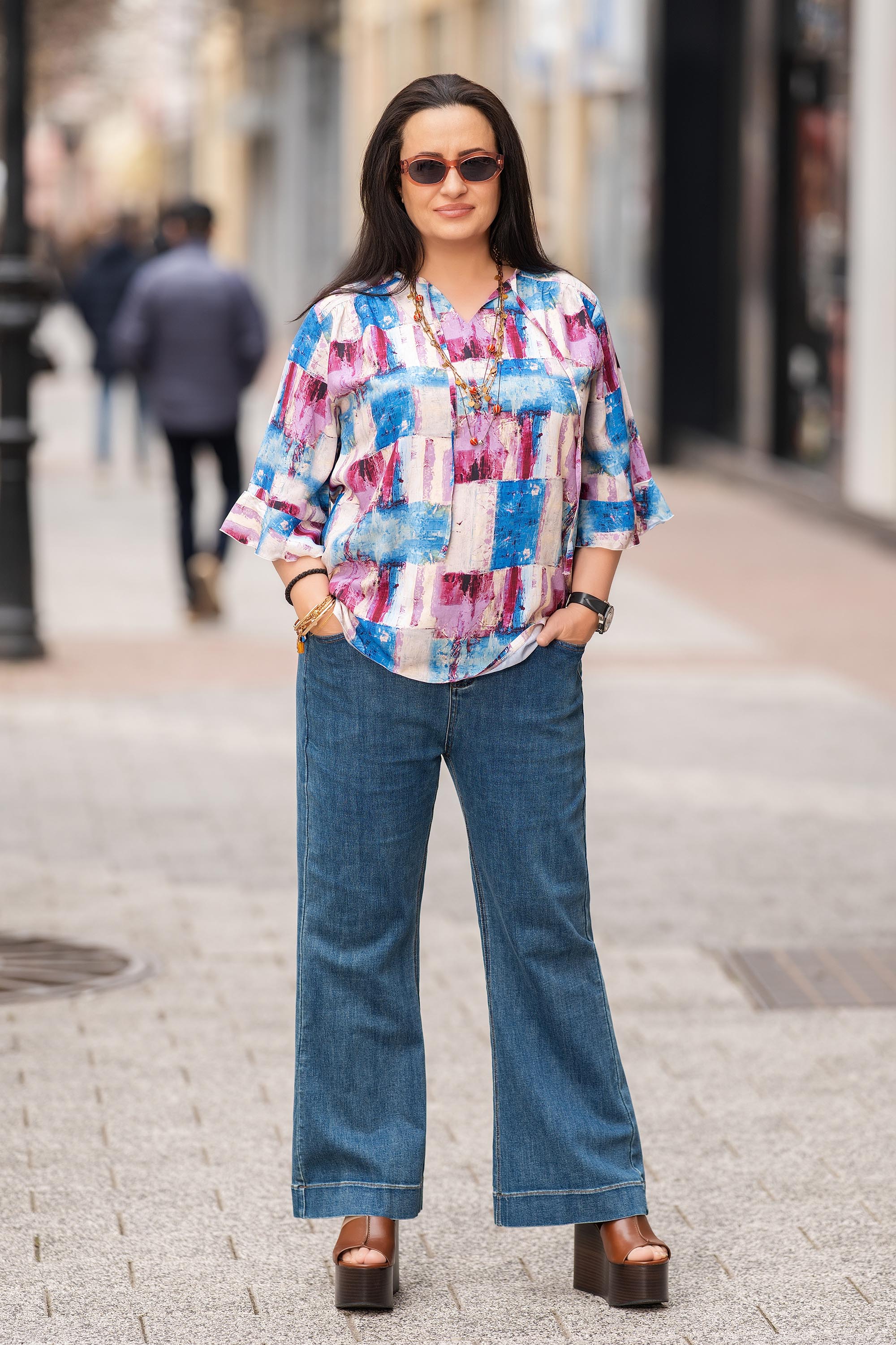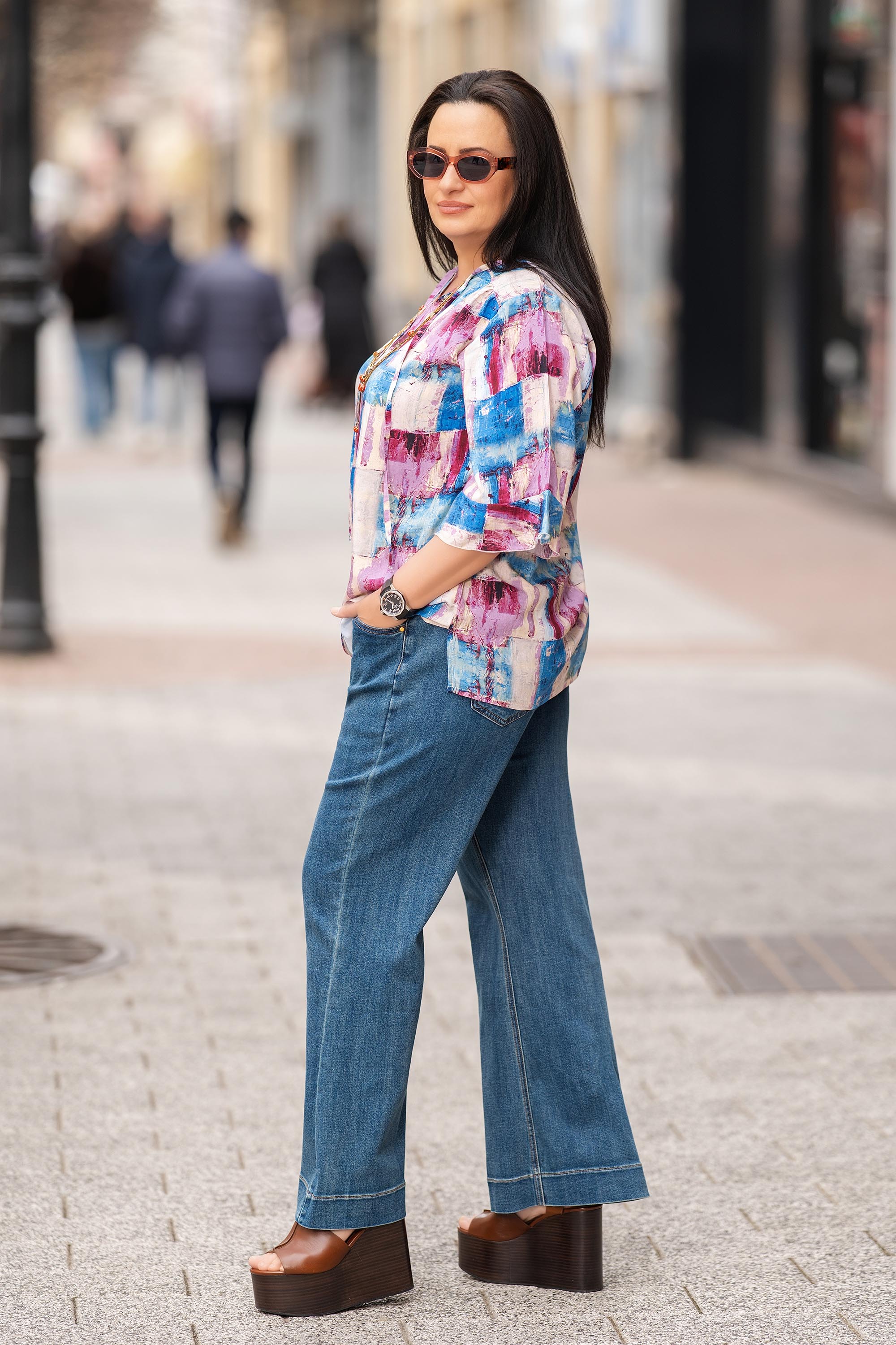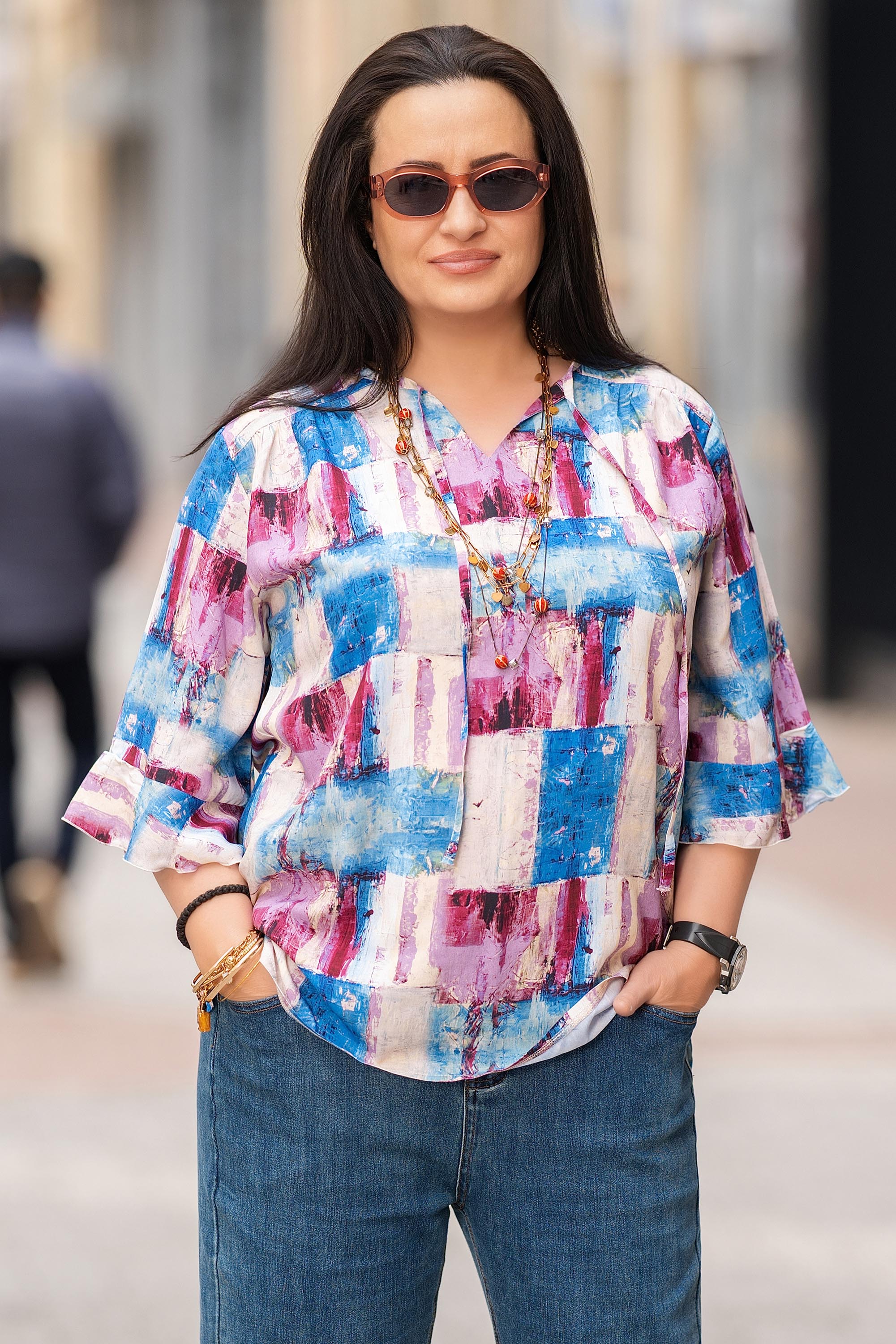 Макси блуза с артистичен характер и отлично усещане за комфорт. Материята от вискоза е лека, мека и дишаща, което я прави идеален избор за ежедневието и по-топлите дни. Свободната кройка осигурява удобно прилягане, а 7/8 ръкавите с леко разкрояване добавят женствен завършек. Многоцветният принт в розови и сини нюанси внася свежест и лесно се комбинира с деним или неутрални тонове.