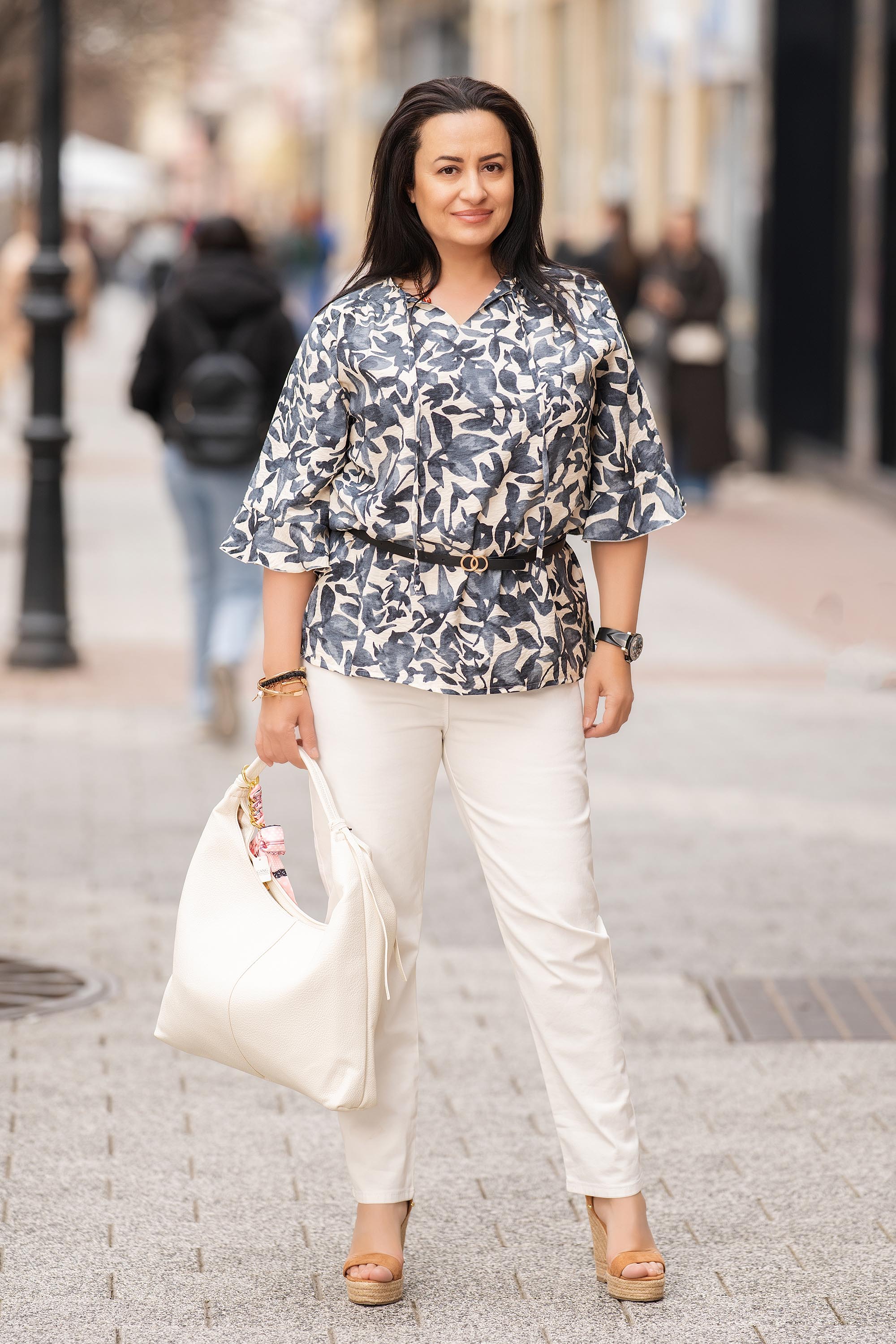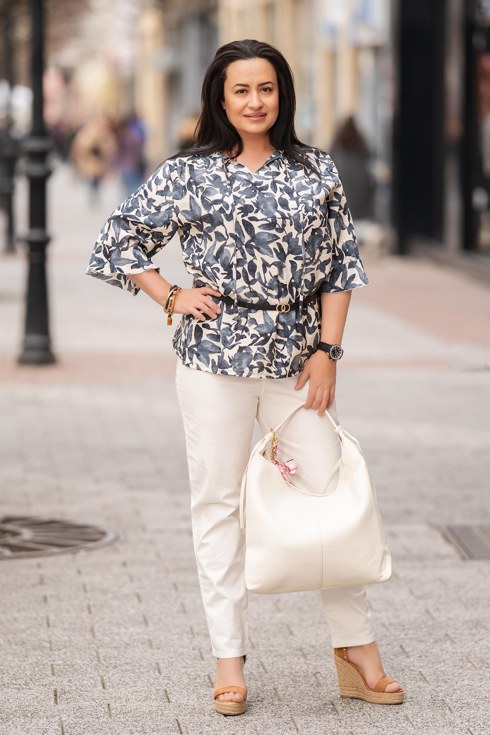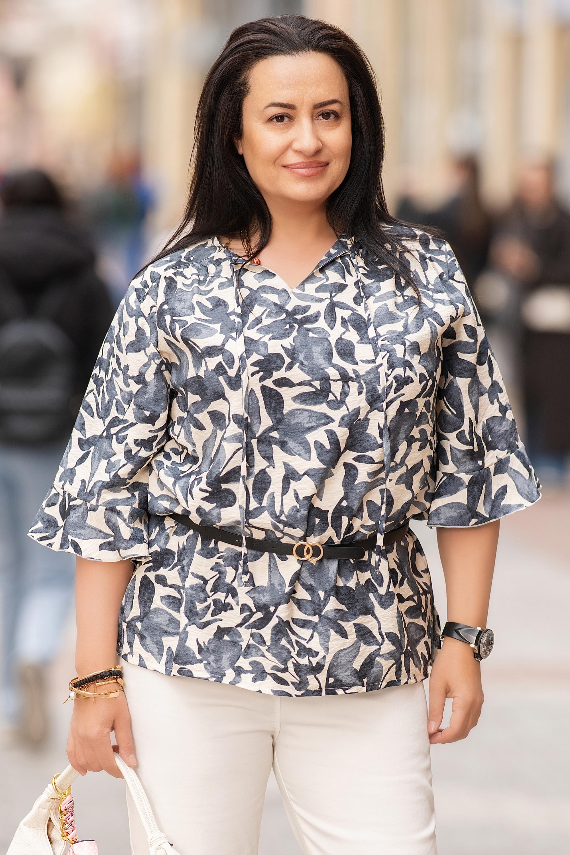 Макси блуза с артистичен характер и отлично усещане за комфорт. Материята от вискоза е лека, мека и дишаща, което я прави идеален избор за ежедневието и по-топлите дни. Свободната кройка осигурява удобно прилягане, а 7/8 ръкавите с леко разкрояване добавят женствен завършек. Интересният принт внася свежест и лесно се комбинира с деним или неутрални тонове.