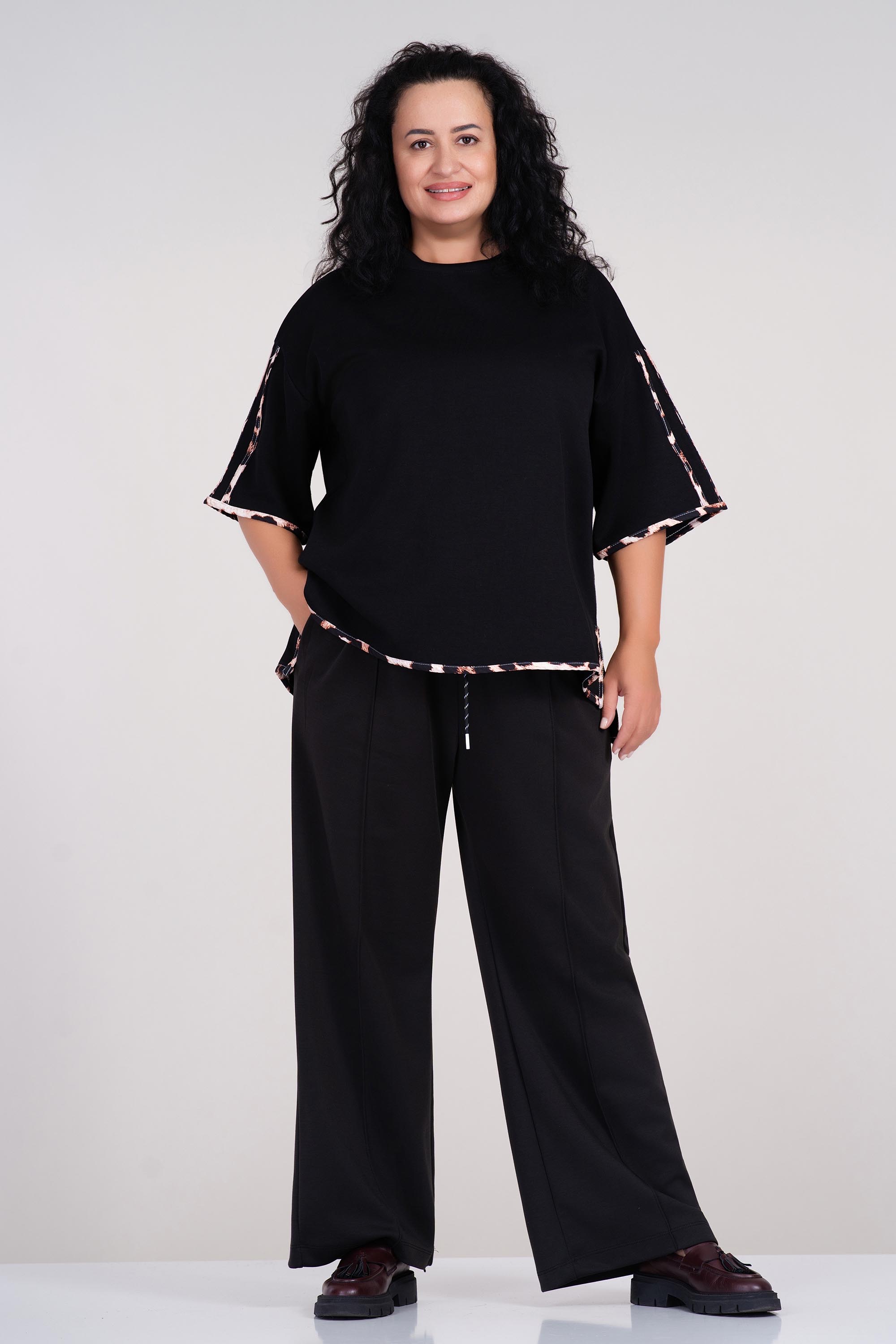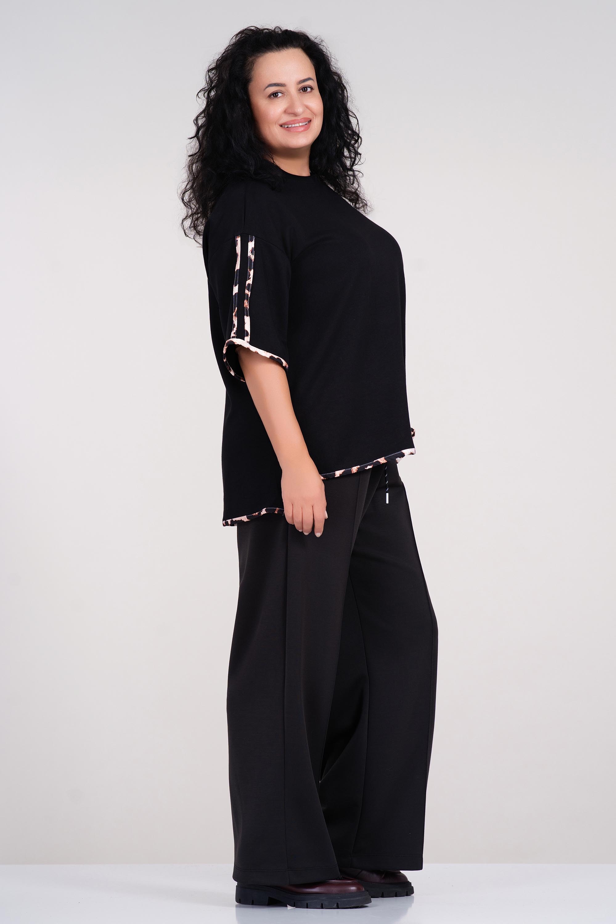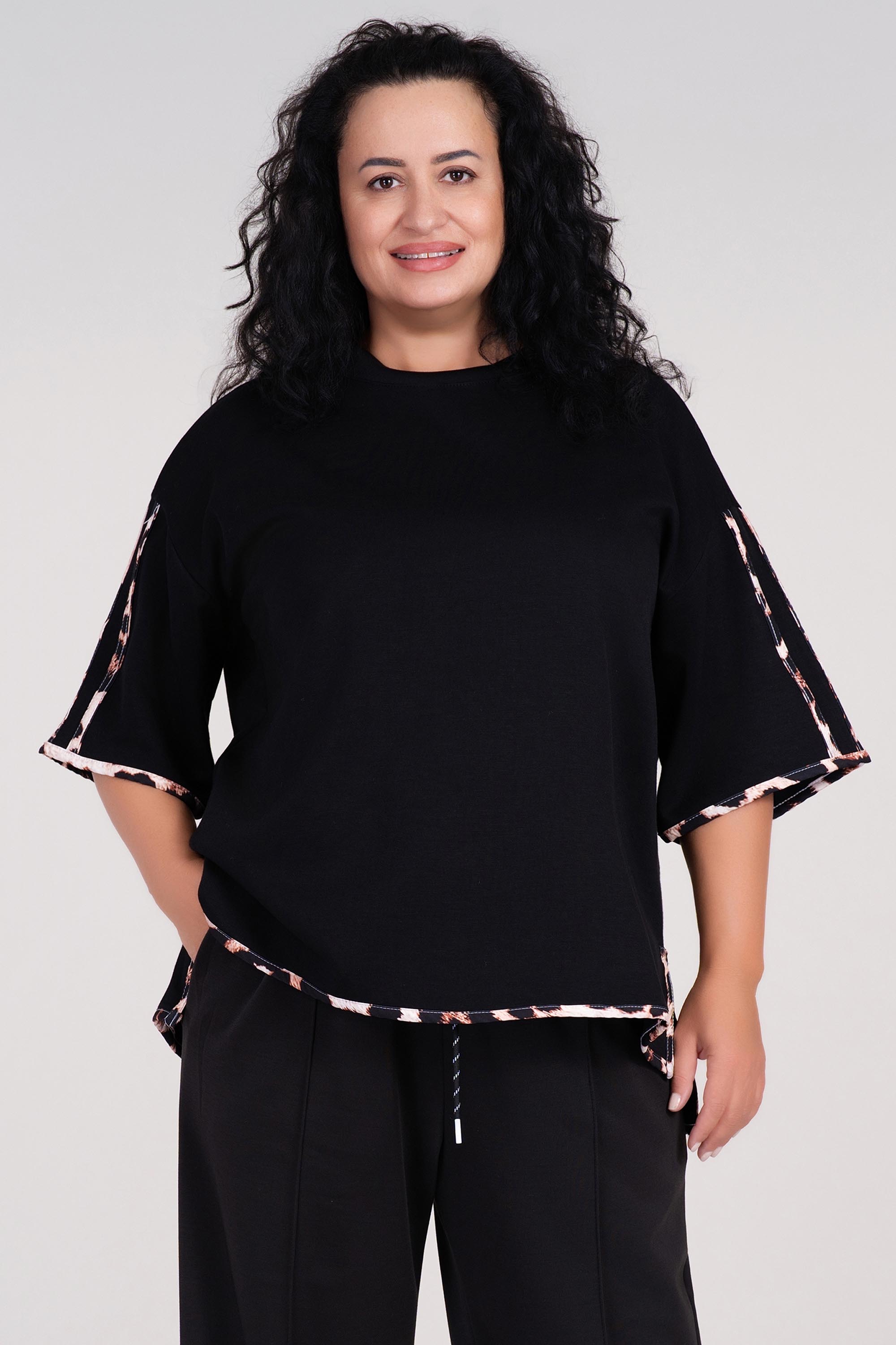Тази макси блуза тип туника е изработена от меко трико, което осигурява комфорт през целия ден. Облото деколте и свободната линия придават женствена и непринудена визия, докато леопардовият кант добавя модерен акцент. Черният и цвят я прави лесна за съчетаване в есенно-зимния гардероб. Подходяща за ежедневие или неофициални срещи