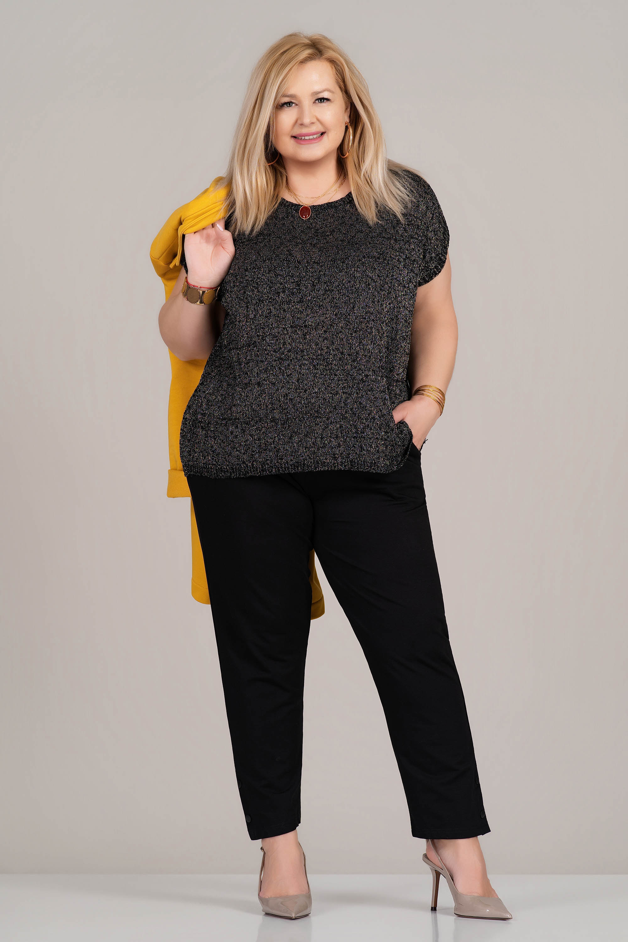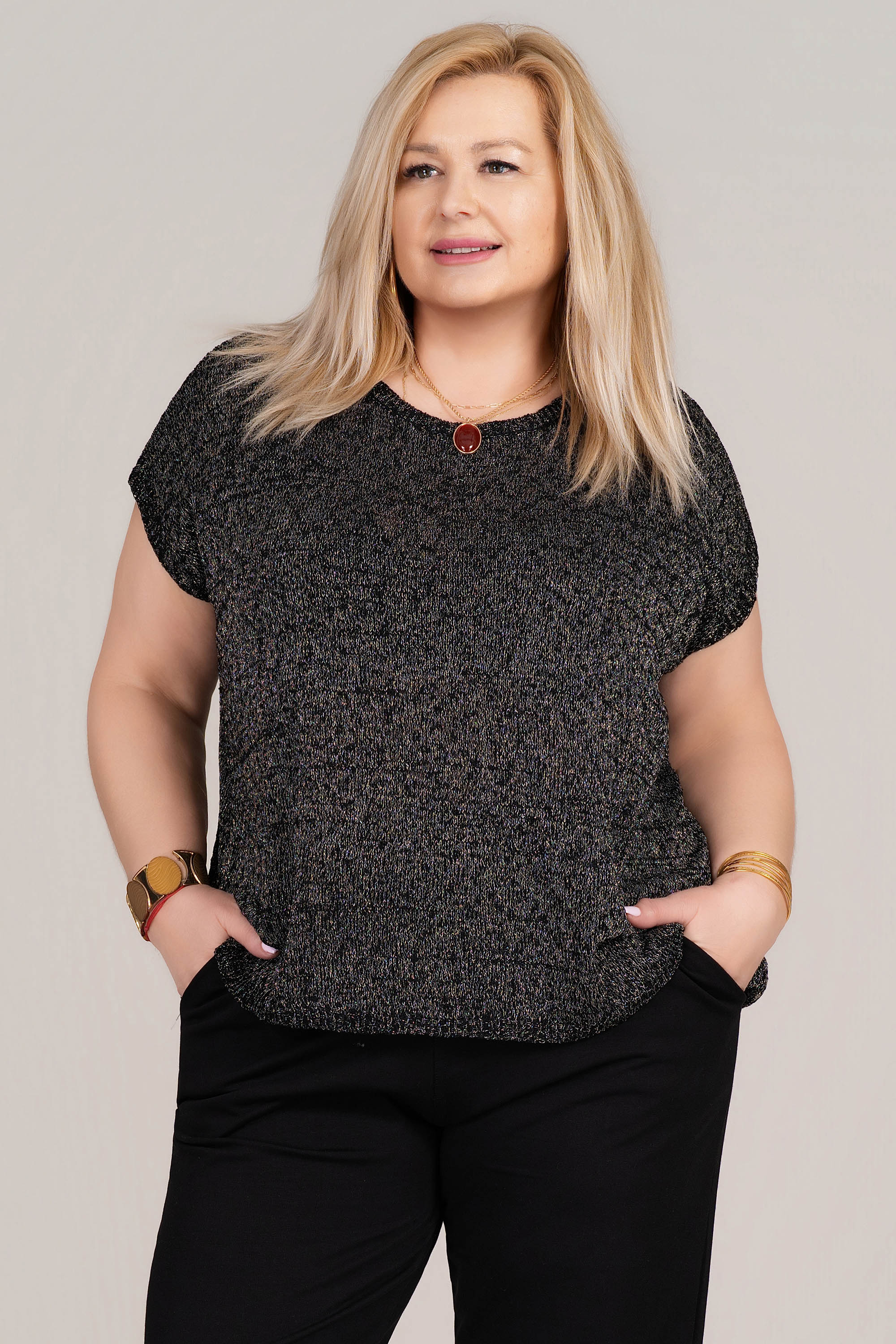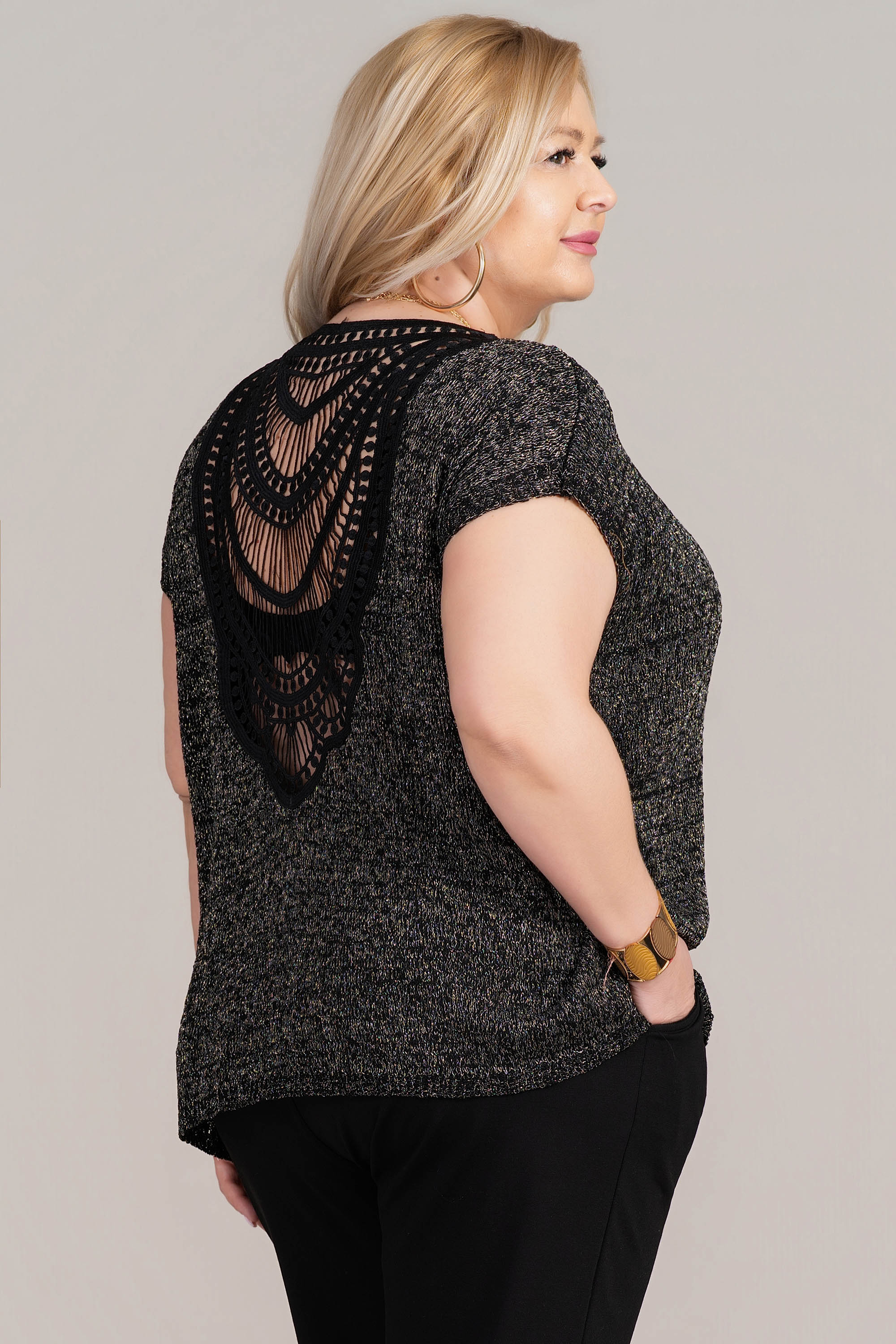 Стилна макси блуза тип туника с изчистена предна част и впечатляващ плетен детайл на гърба. Свободната линия осигурява комфорт в областта на бюста и корема, а фината плетена текстура с блестящи нишки създават елегантно и модерно излъчване.
