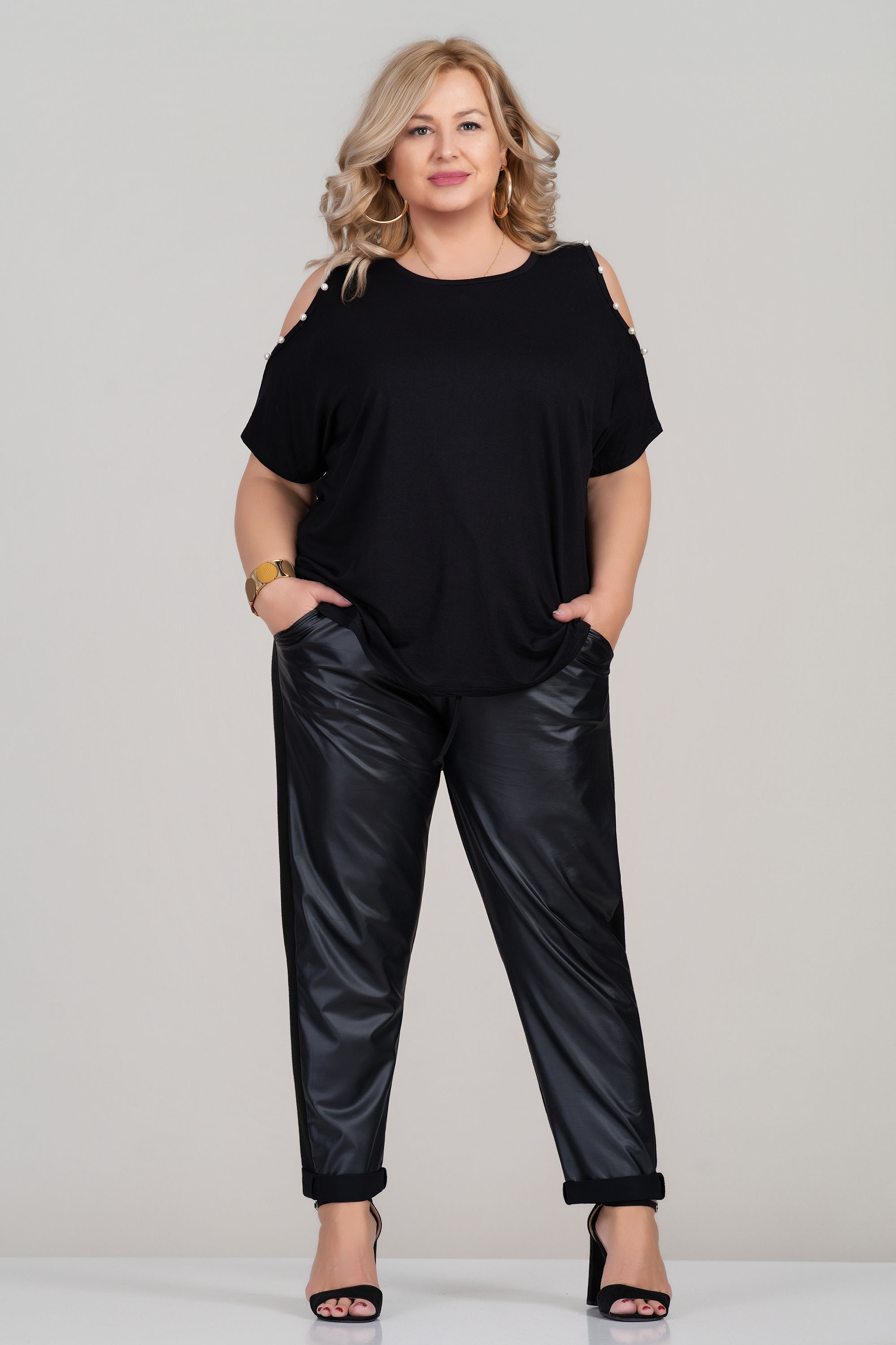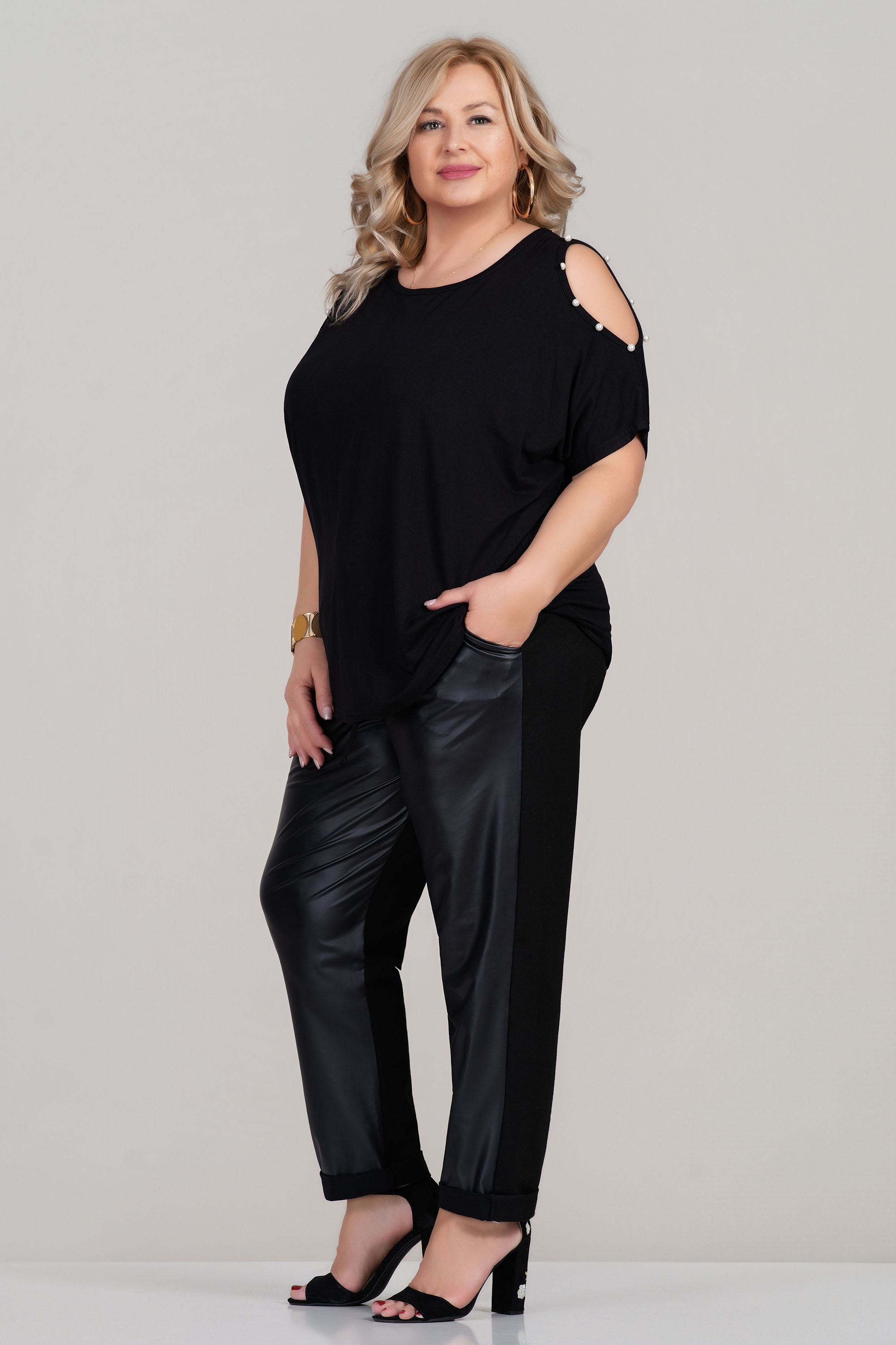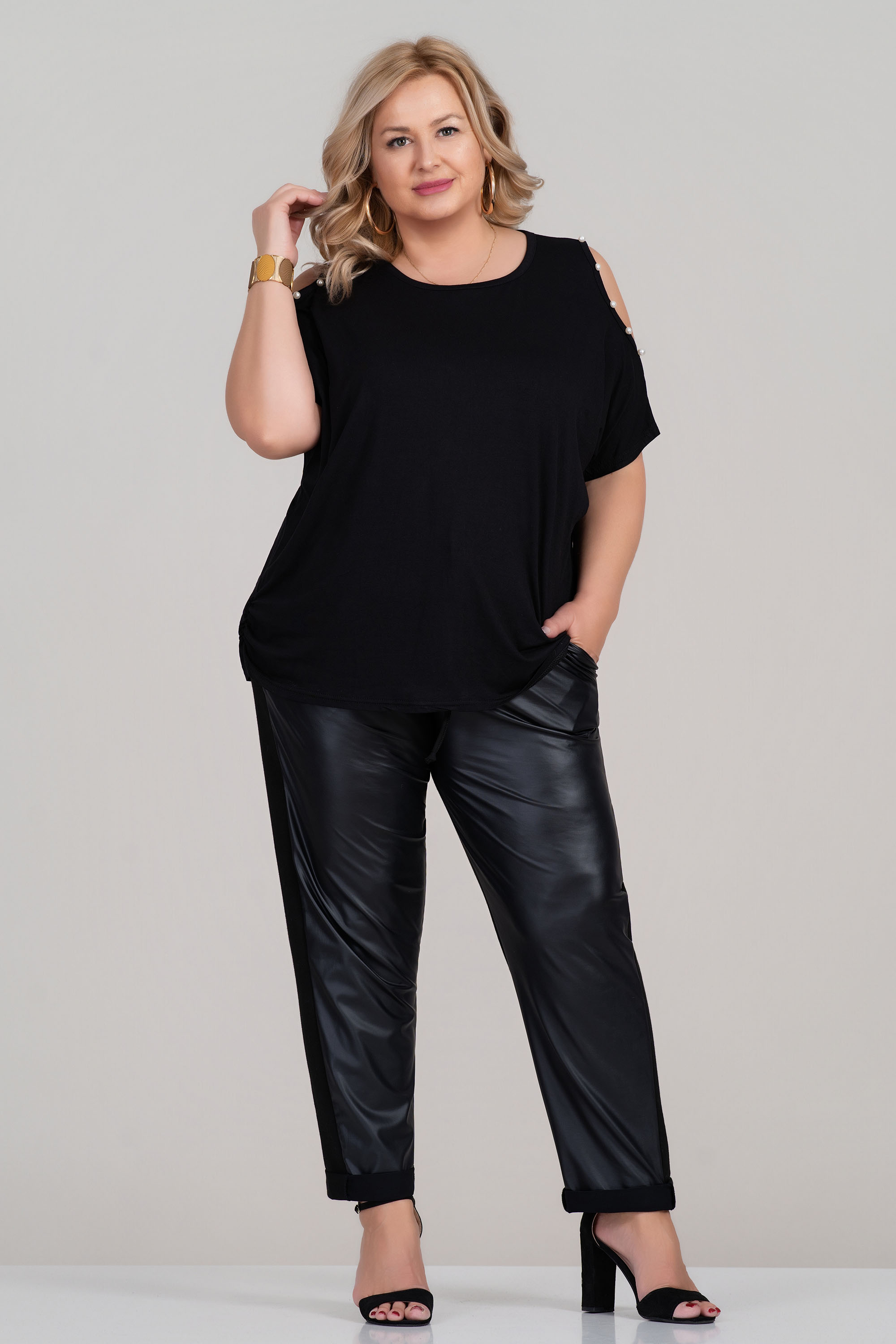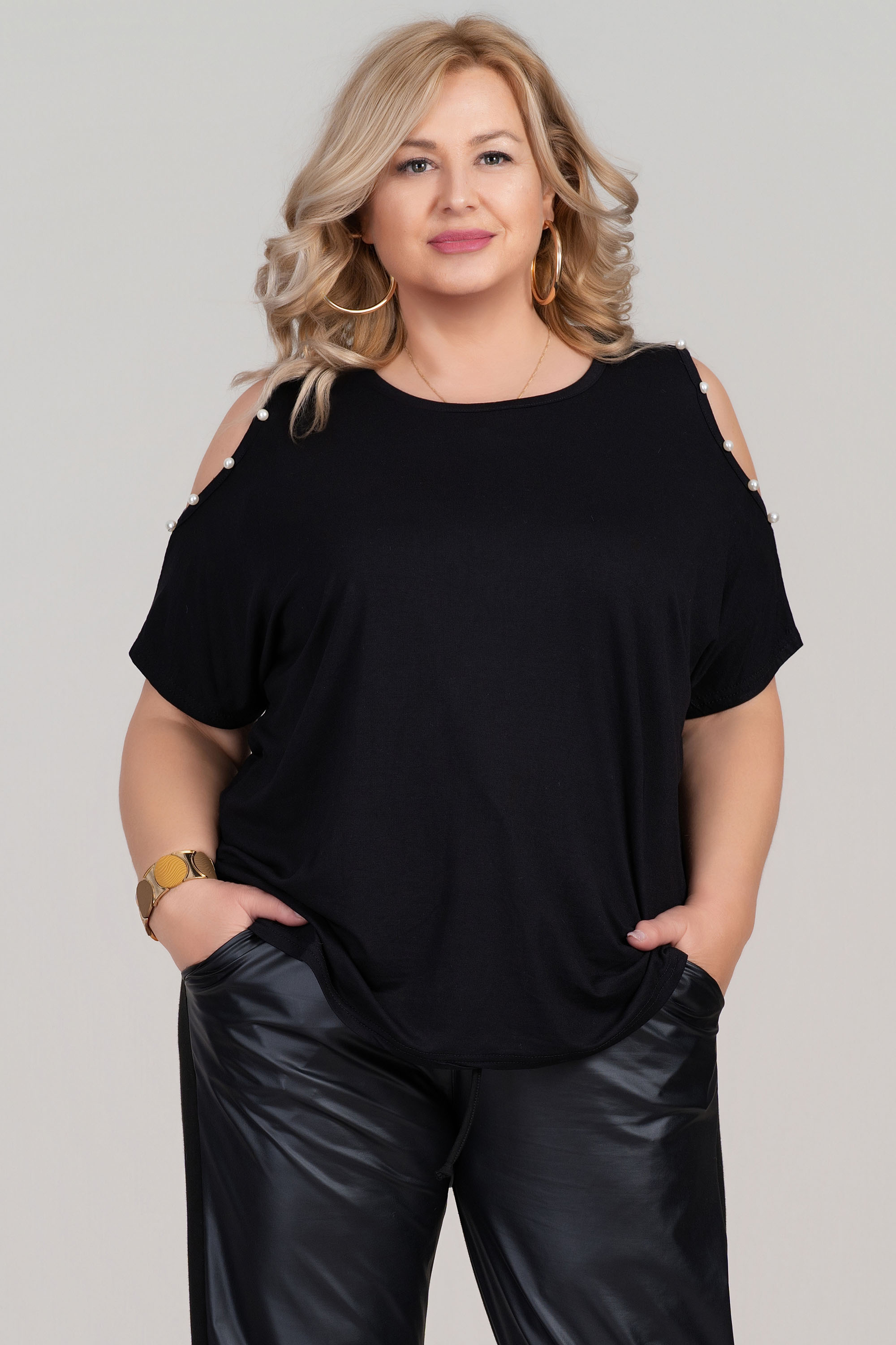 Свободна макси блуза от фино трико с отворени ръкави, декорирани с перли. Черният цвят е стилен и лесен за комбиниране, а кройката е подходяща за дами, които търсят комфорт и свобода на движение. Моделът е отличен избор за ежедневието през топлите сезони.