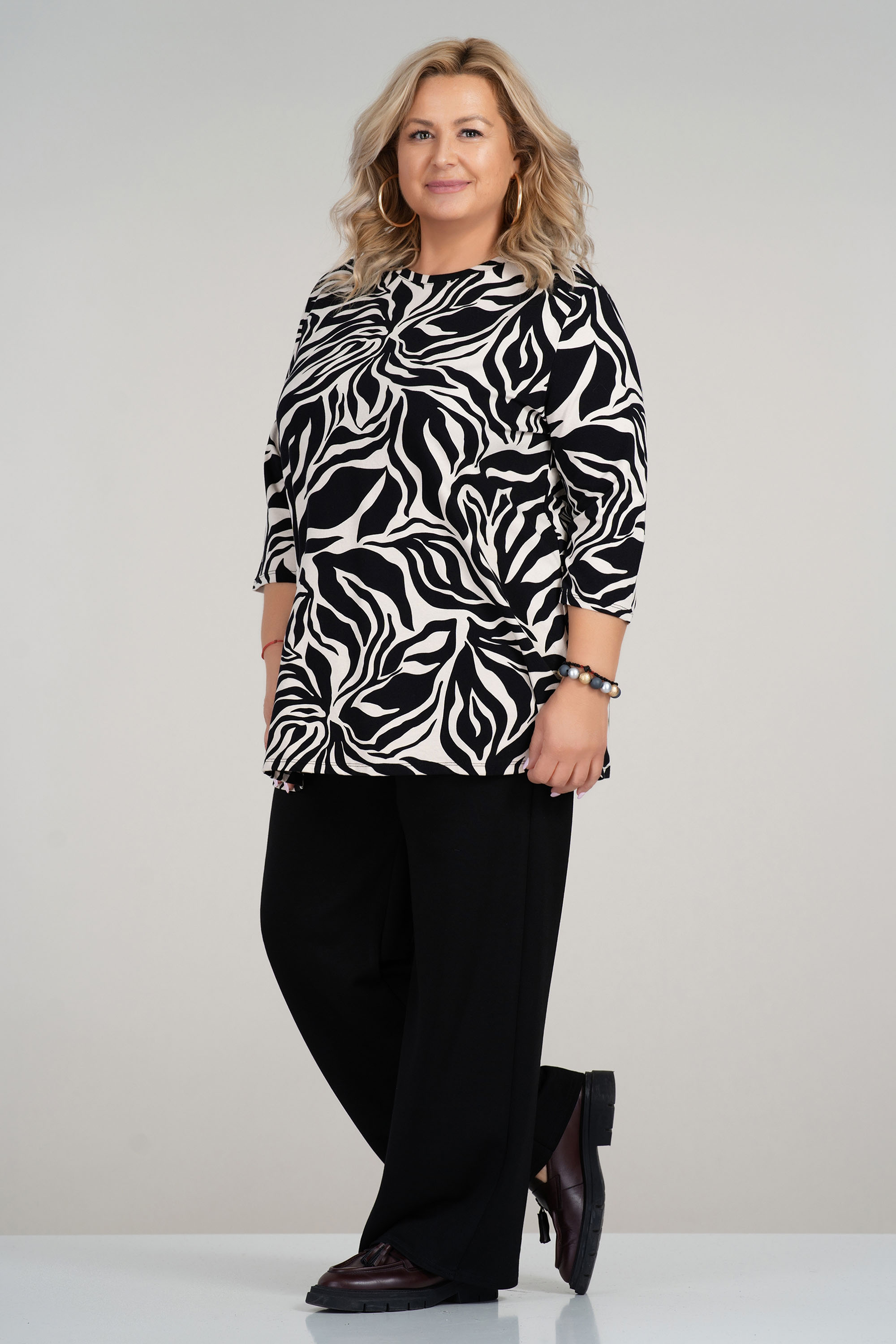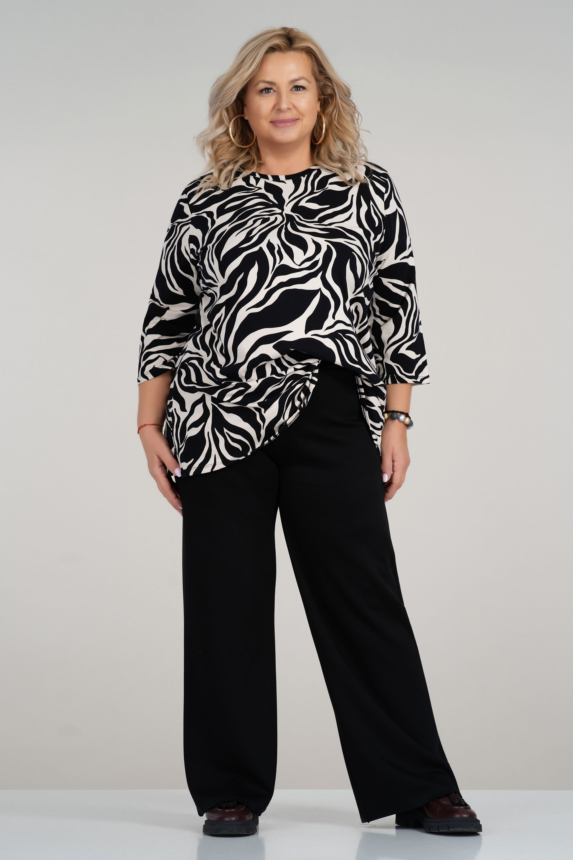 Тази мека макси блуза от трико впечатлява с модерен зебров принт . Кройката е свободна и удобна, а обло деколте и ¾ ръкав създават балансирана визия. Подходяща е за всекидневието и лесно се комбинира с едноцветни долнища.