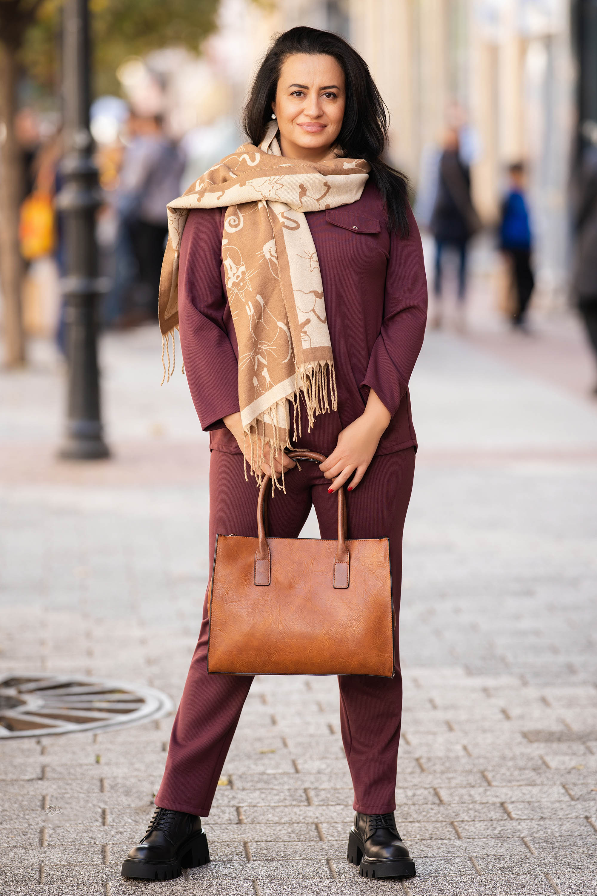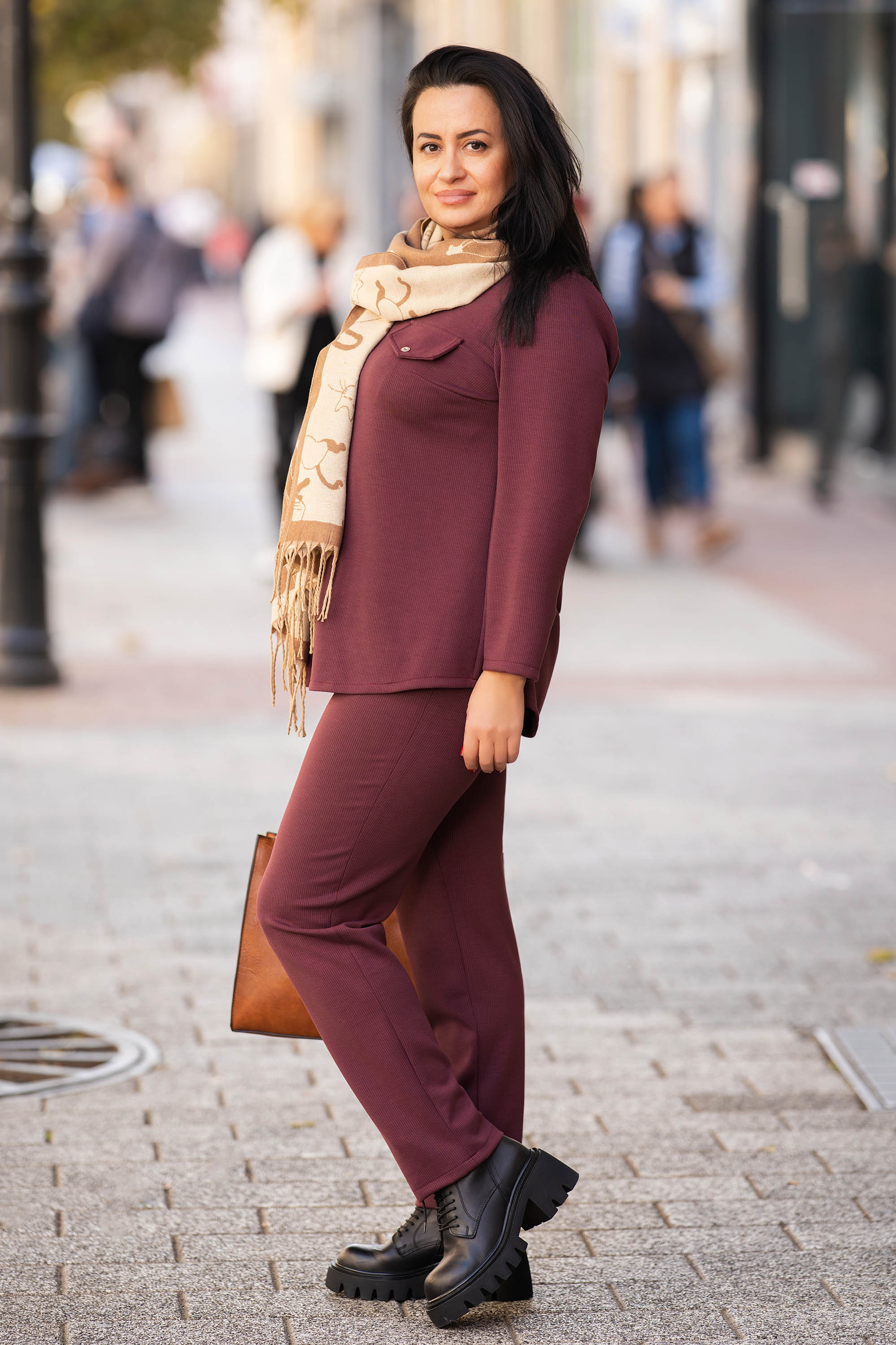 Блузата се отличава с дискретно раирана материя в бордо нюанс, който се комбинира лесно с различни долни части. Меката вискозна материя осигурява комфорт при носене, а свободната кройка допринася за свобода на движение. Облото деколте и декоративният капак тип джоб придават характерен акцент. Подходяща е за ежедневието или за неформални поводи през есенните дни.